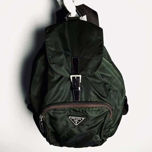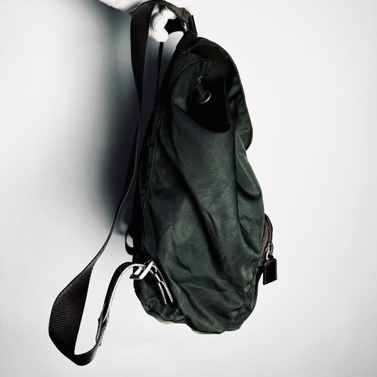 Prada Ebano Khaki Monogram Logo Vela Classic Nylon & Leather Drawstring Backpack Bag