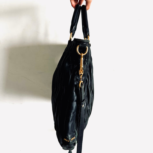 Miu Miu Black GHW Gaufre Matelasse Lux Gathered Leather Classic Logo 2-Way Bauletto Shopper Shoulder Sling Tote Bag