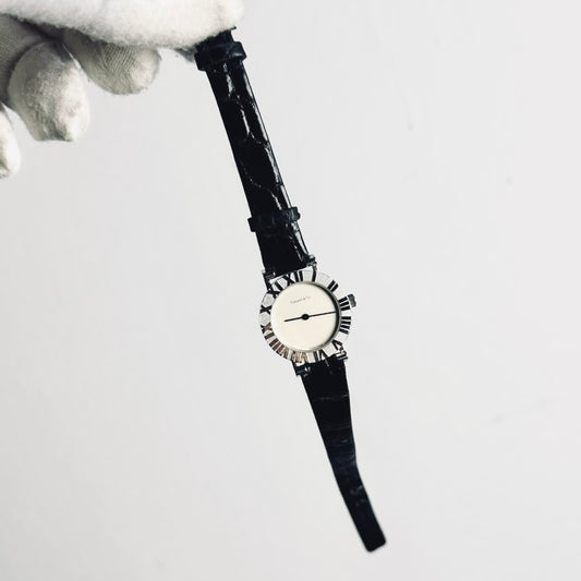 Tiffany & Co T&C Atlas Round White Dial Roman Numerals Black Embossed Leather Strap 24MM Quartz Watch