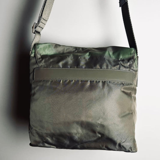 Prada Sage Green Khaki Tessuto Monogram Logo Nylon & Leather Flap Shoulder Sling Bag