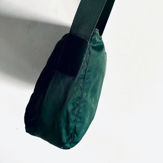 Prada Tessuto Dark Green Classic Logo Nylon Hobo Baguette Shoulder Sling Bag