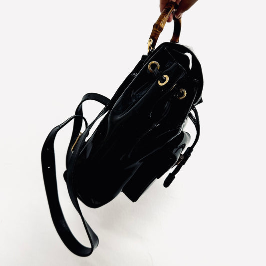 Gucci Black GHW Bamboo Handle Small Patent Leather Monogram Logo Flap Backpack Bag