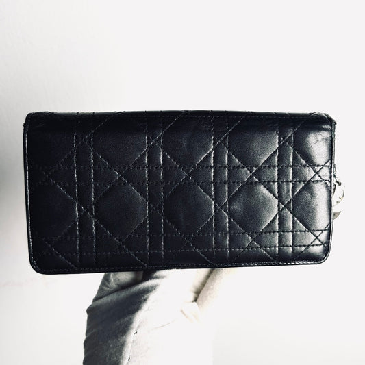 Christian Dior CD Lady Dior Black / Turquoise Charms Monogram Logo Cannage Quilted Lambskin Long Flap Bifold Wallet