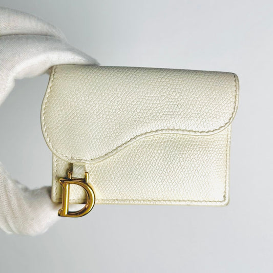 Christian Dior CD White GHW Saddle Lotus Monogram Logo Grained Calfskin Flap Compact Wallet