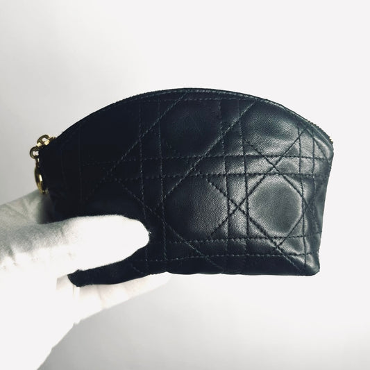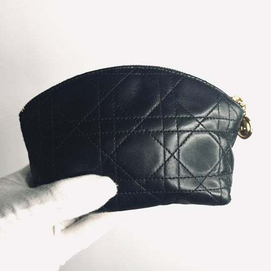 Christian Dior CD Black GHW Lady Dior Monogram Logo Cannage Quilted Lambskin Zip Cosmetic Toiletry Pouch Clutch Case