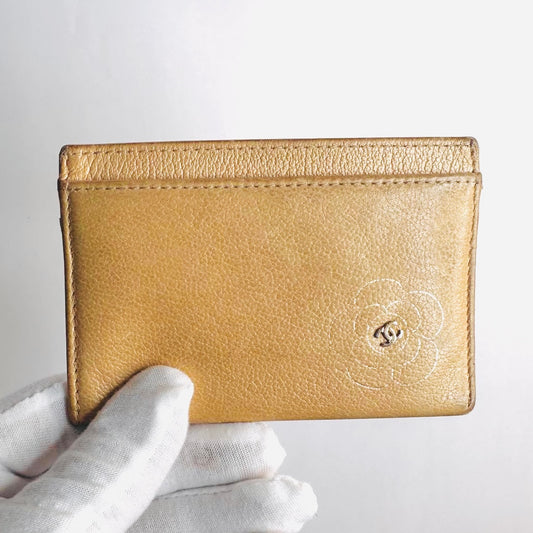 Chanel Camellia Beige Giant CC Logo Chevre Leather Compact Cardholder Card Case Wallet 15s