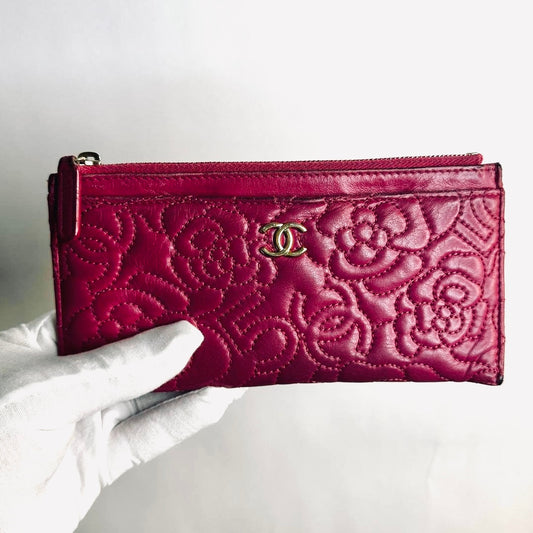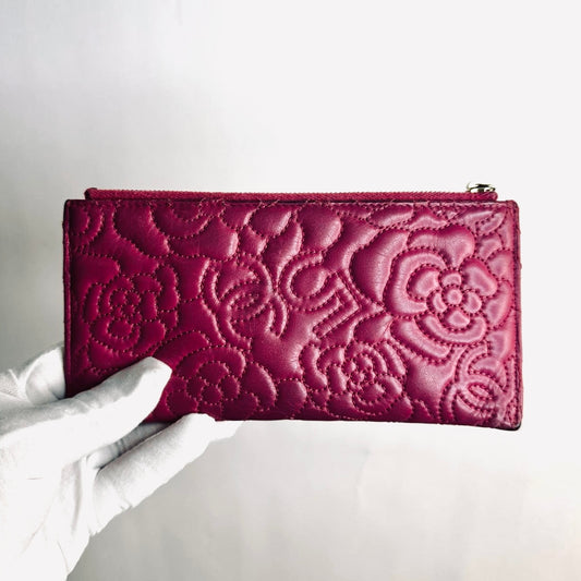 Chanel Camellia Fuchsia GHW CC Monogram Logo Embossed Lambskin Zip Long Flat Wallet Cardholder Card Case Pouch 26s