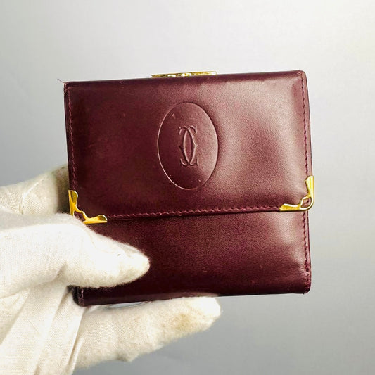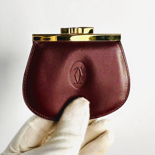 Cartier Must / Mast de Cartier Maroon Burgundy GHW Smooth Leather Kisslock Snap Coin Purse Compact Wallet