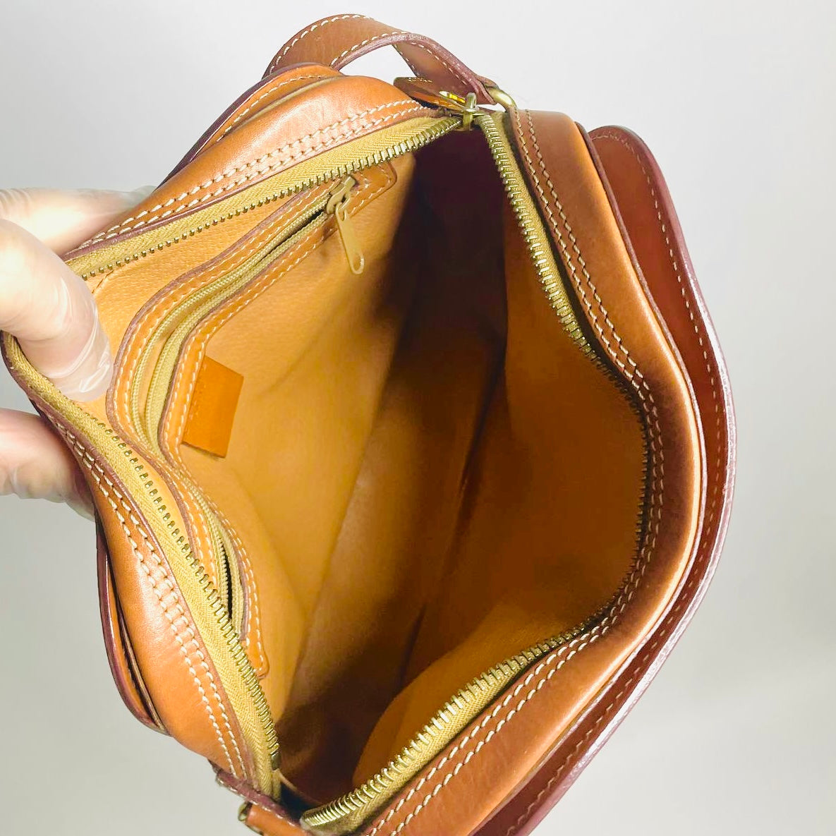 Preloved 9.5/10. This has a flap magnetic button closure front pocket, zip central compartment and zip pocket. This measures 25x19x6cm.