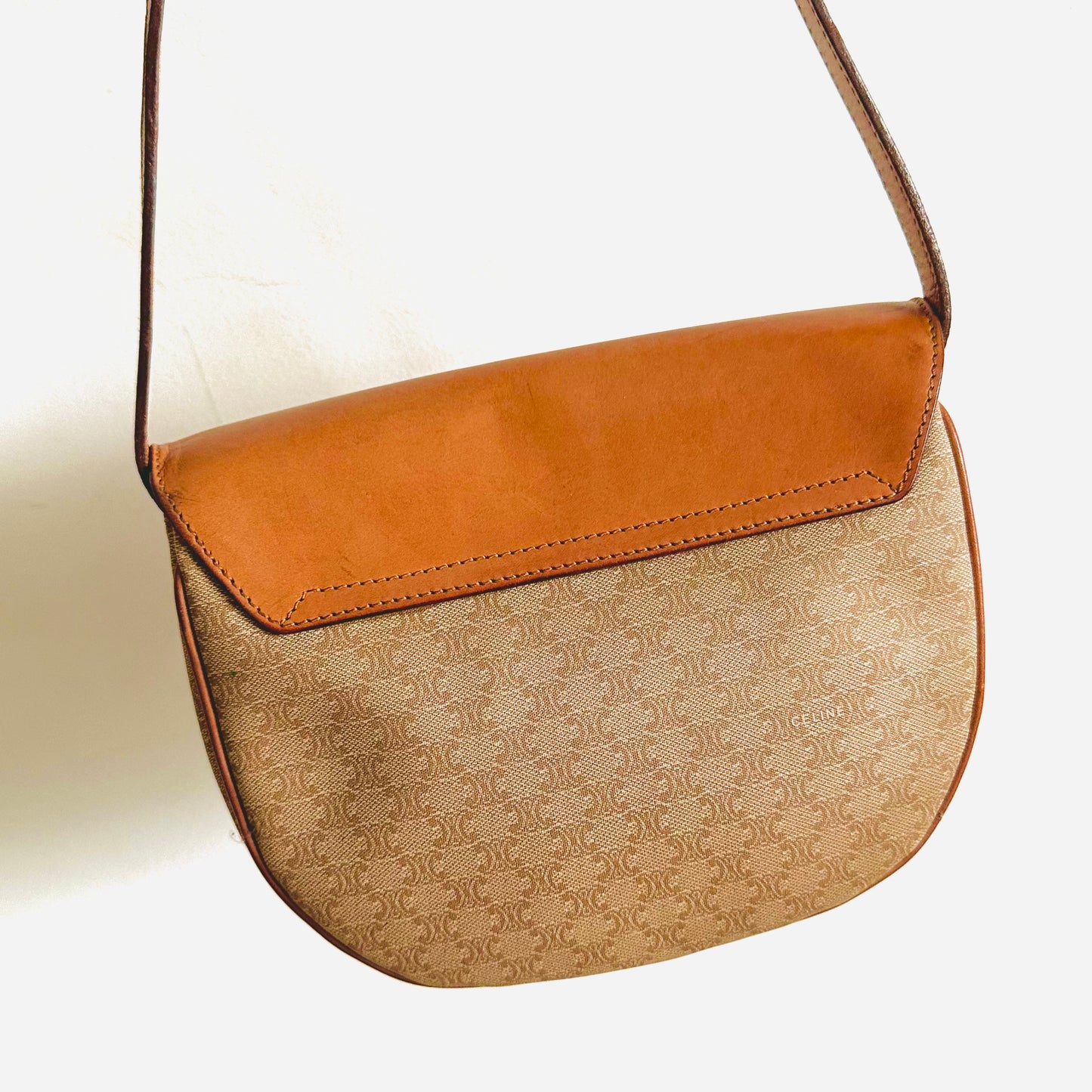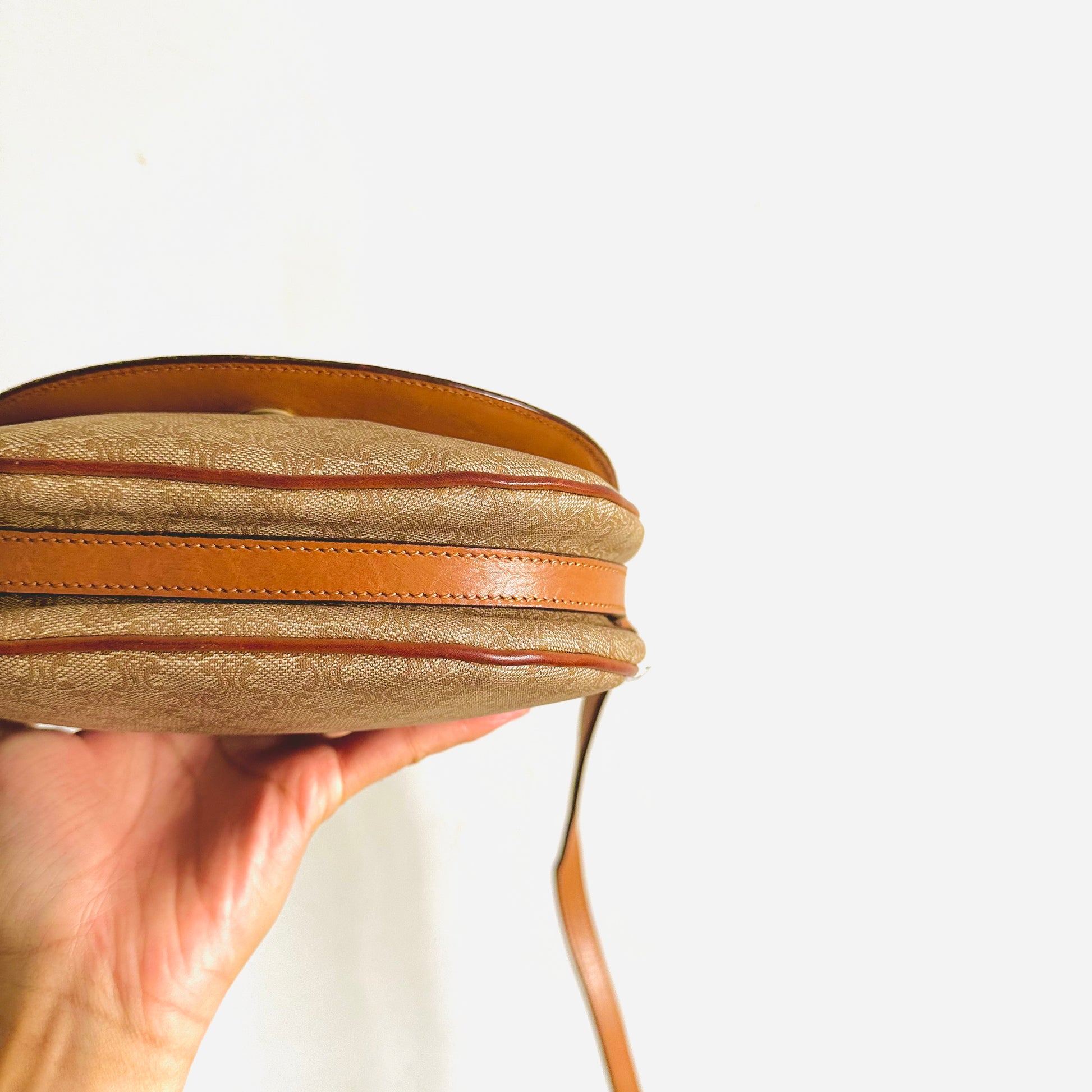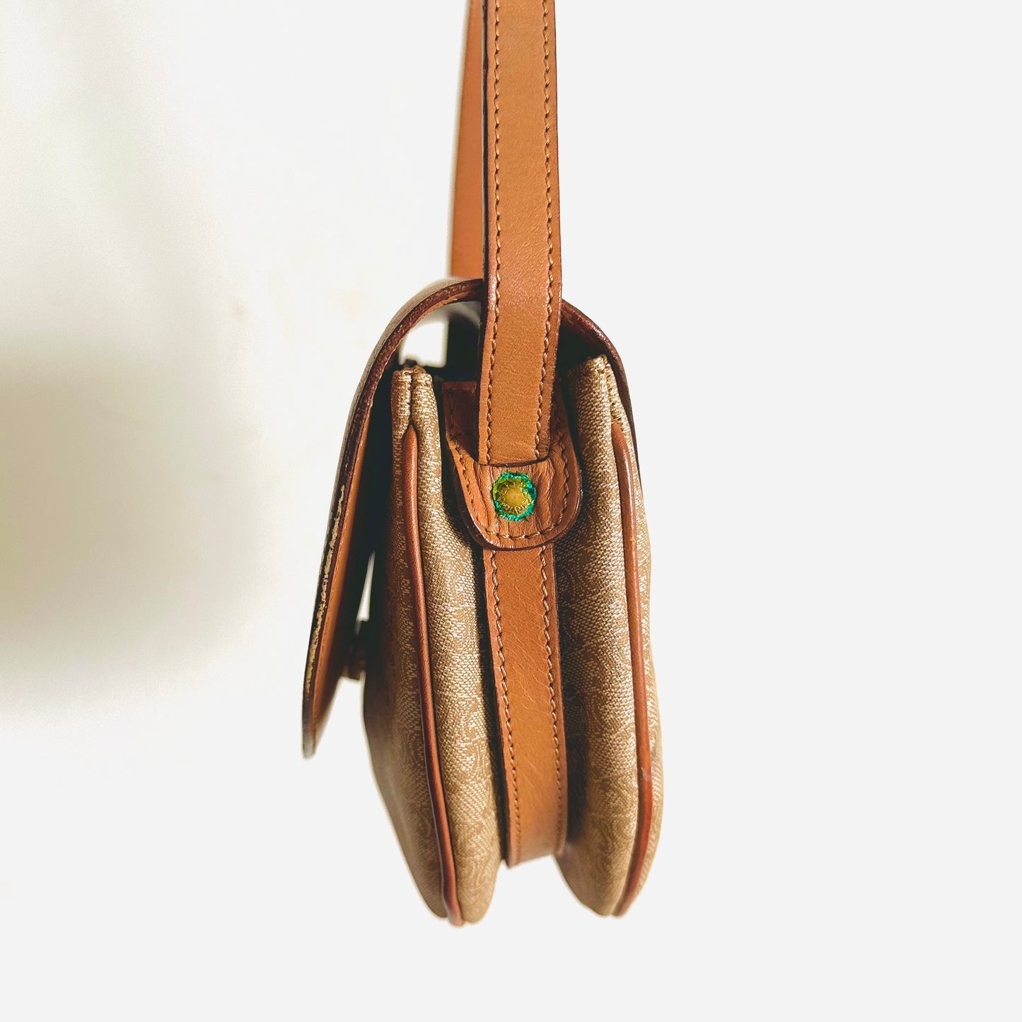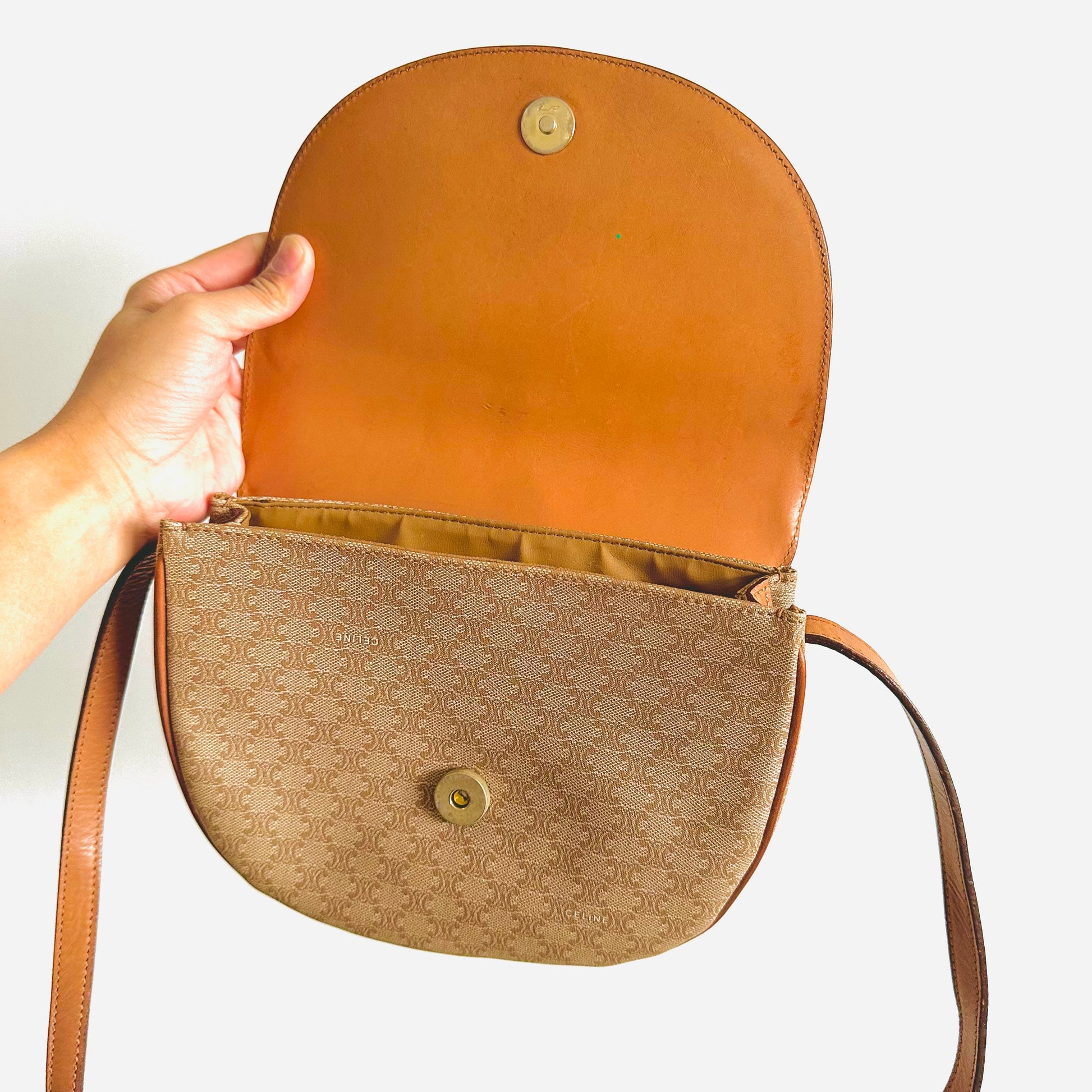 Celine Beige Triomphe Macadam Monogram Logo & Leather Vintage Flap Shoulder Sling Bag