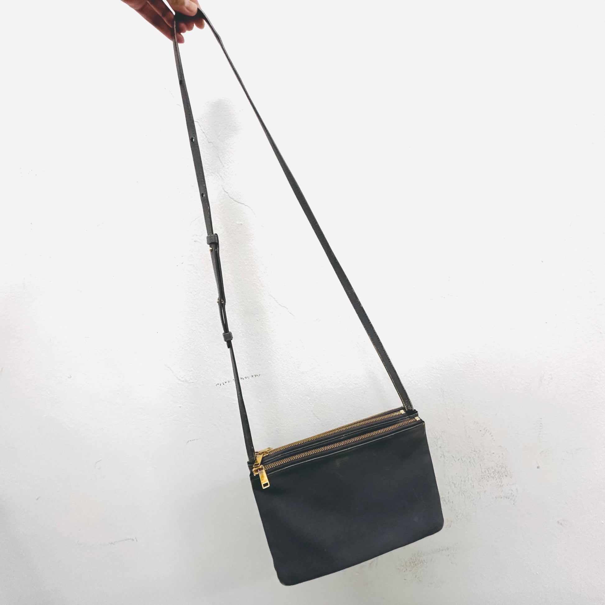 Preloved. This has an adjustable strap, snap buttons connecting the pouches, zip closures and central compartments. This measures 25x18x4cm.