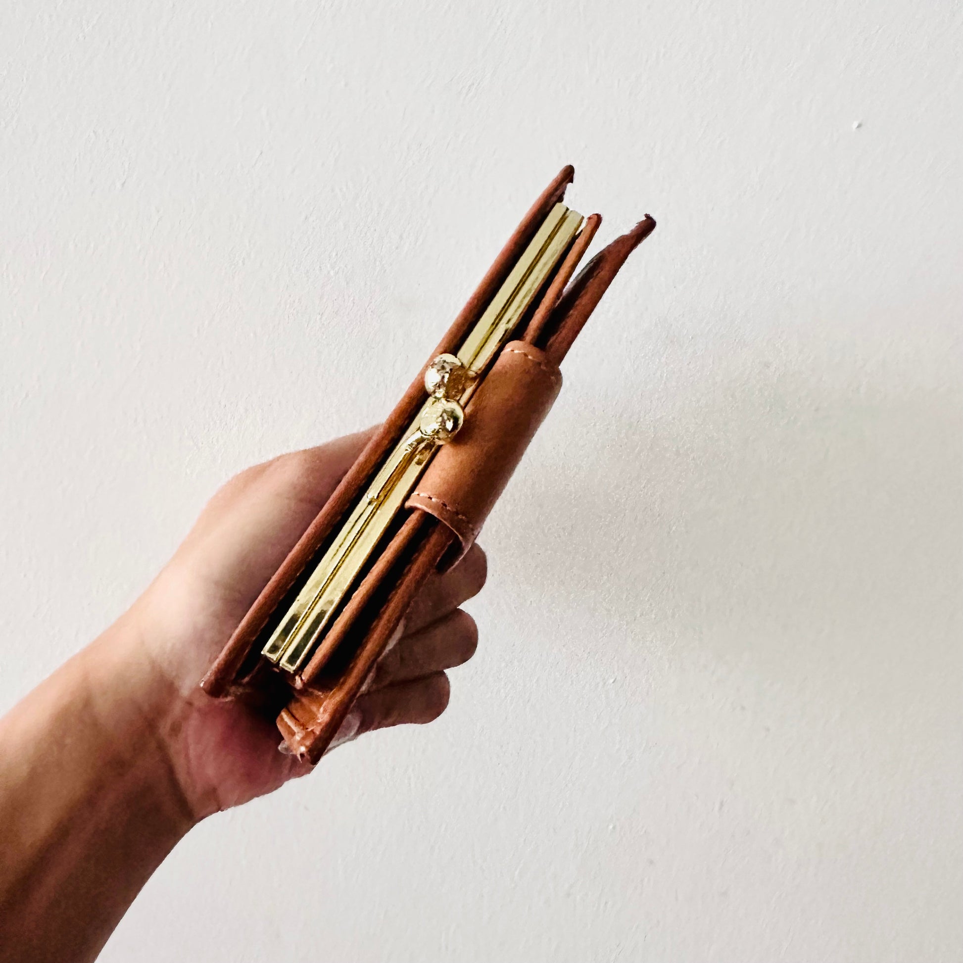 This has a flap button closure, notes compartment, card slots, clasp coin pocket and slip pockets. This measures 12.5x10x1cm. This comes with front logo, interior stamping and model code.