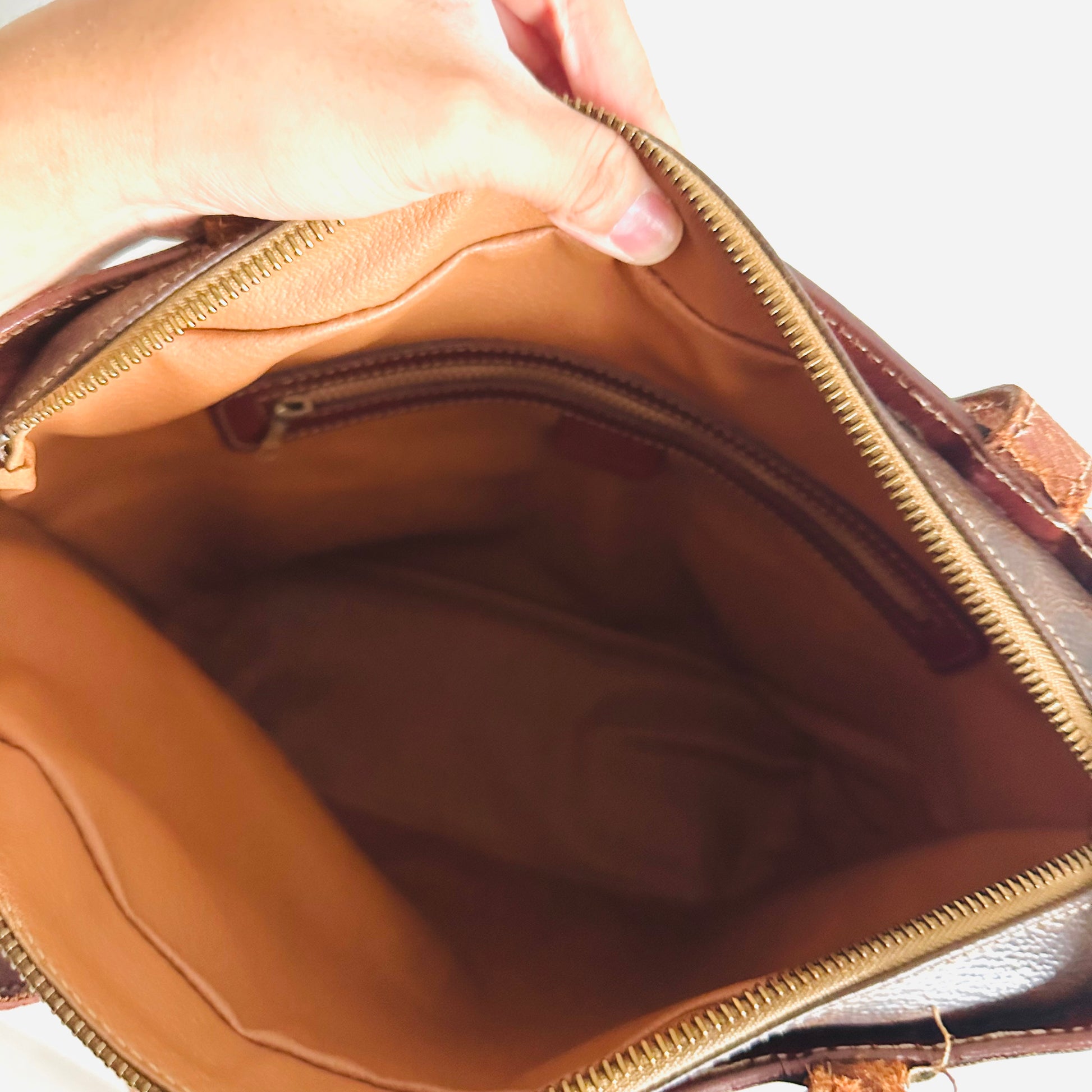 Preloved 9/10. This has a magnetic flap front pocket, zip closure, central compartment and zip pocket. This measures 32x26x12cm.