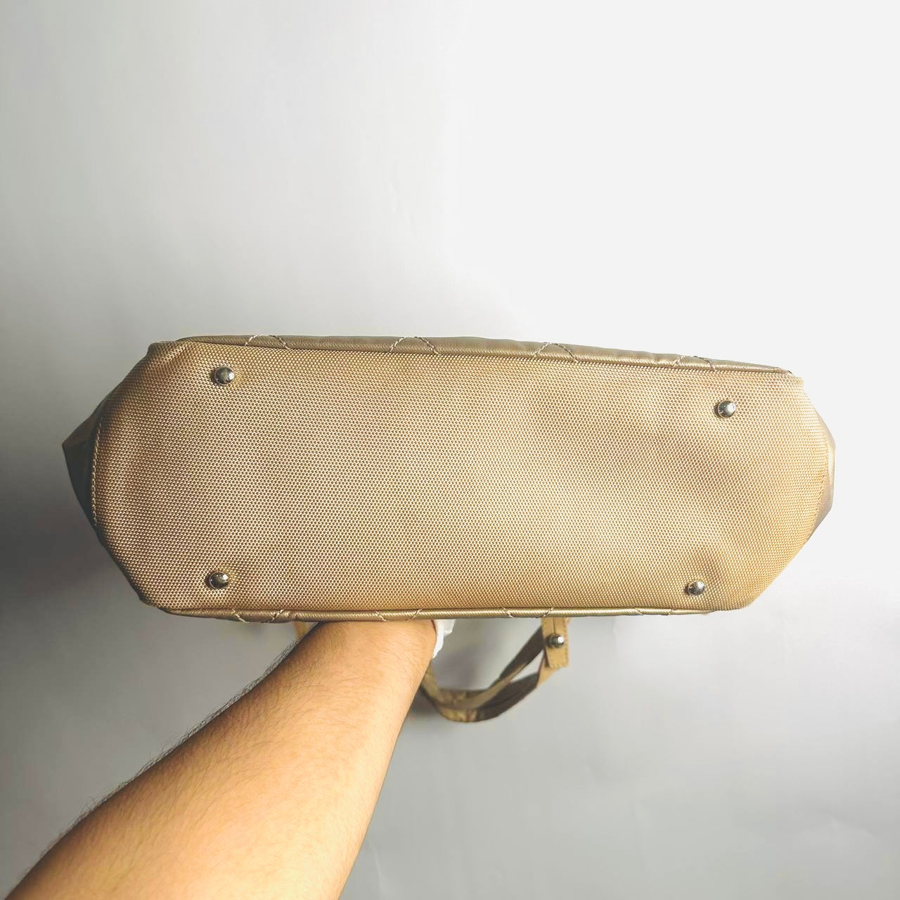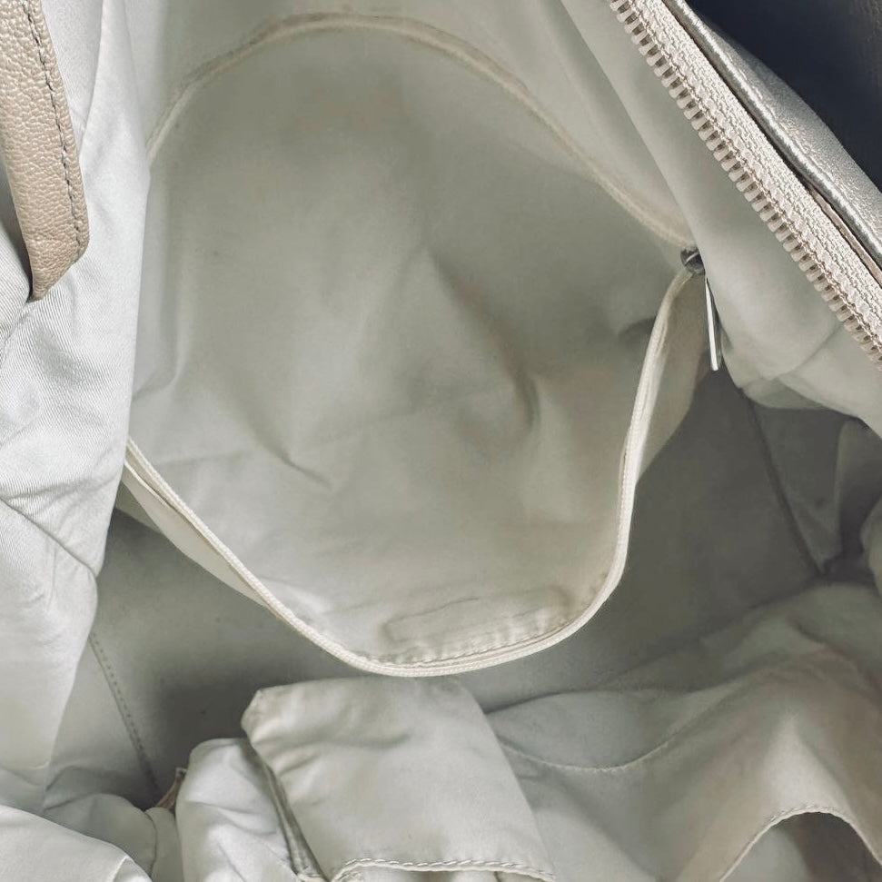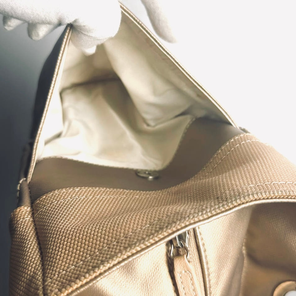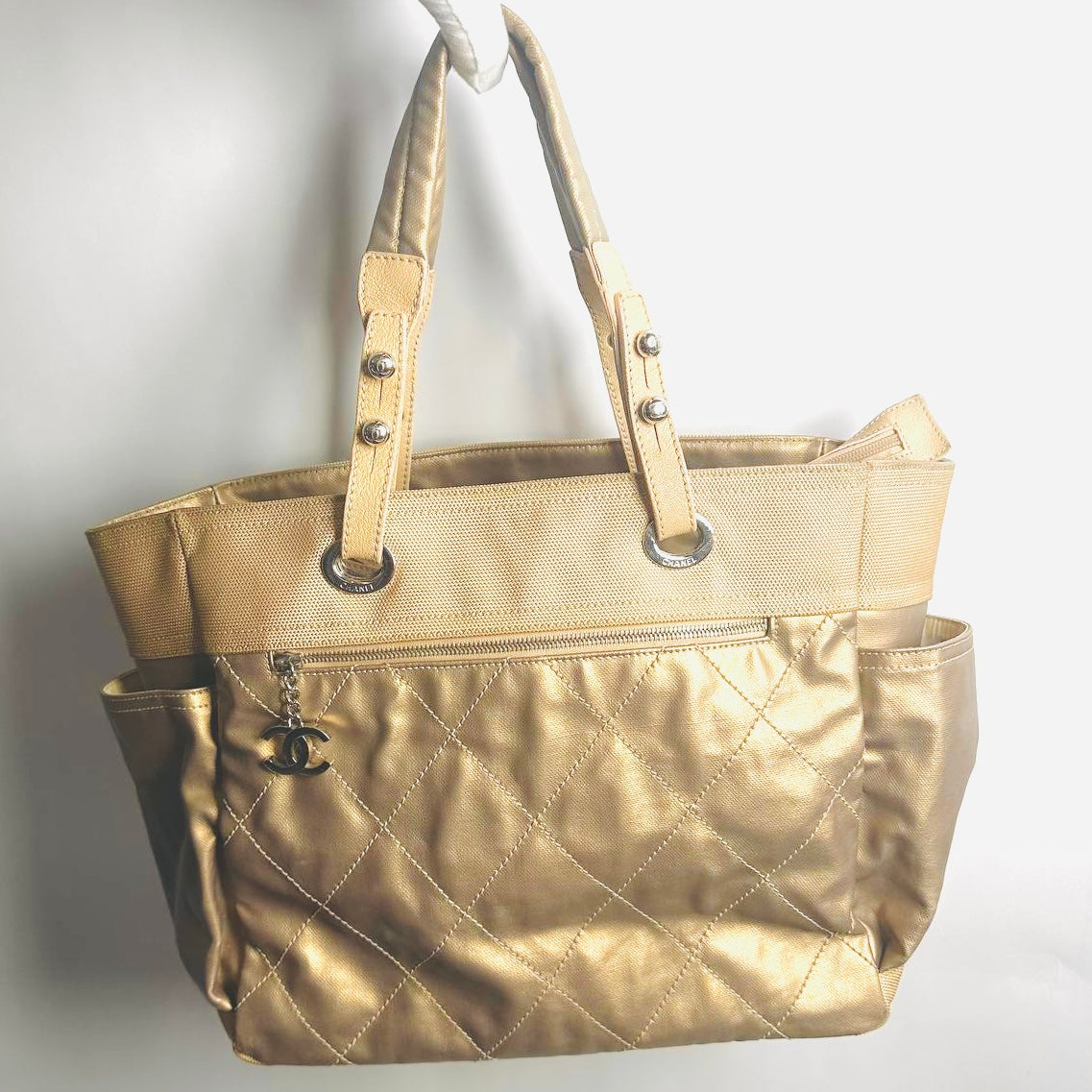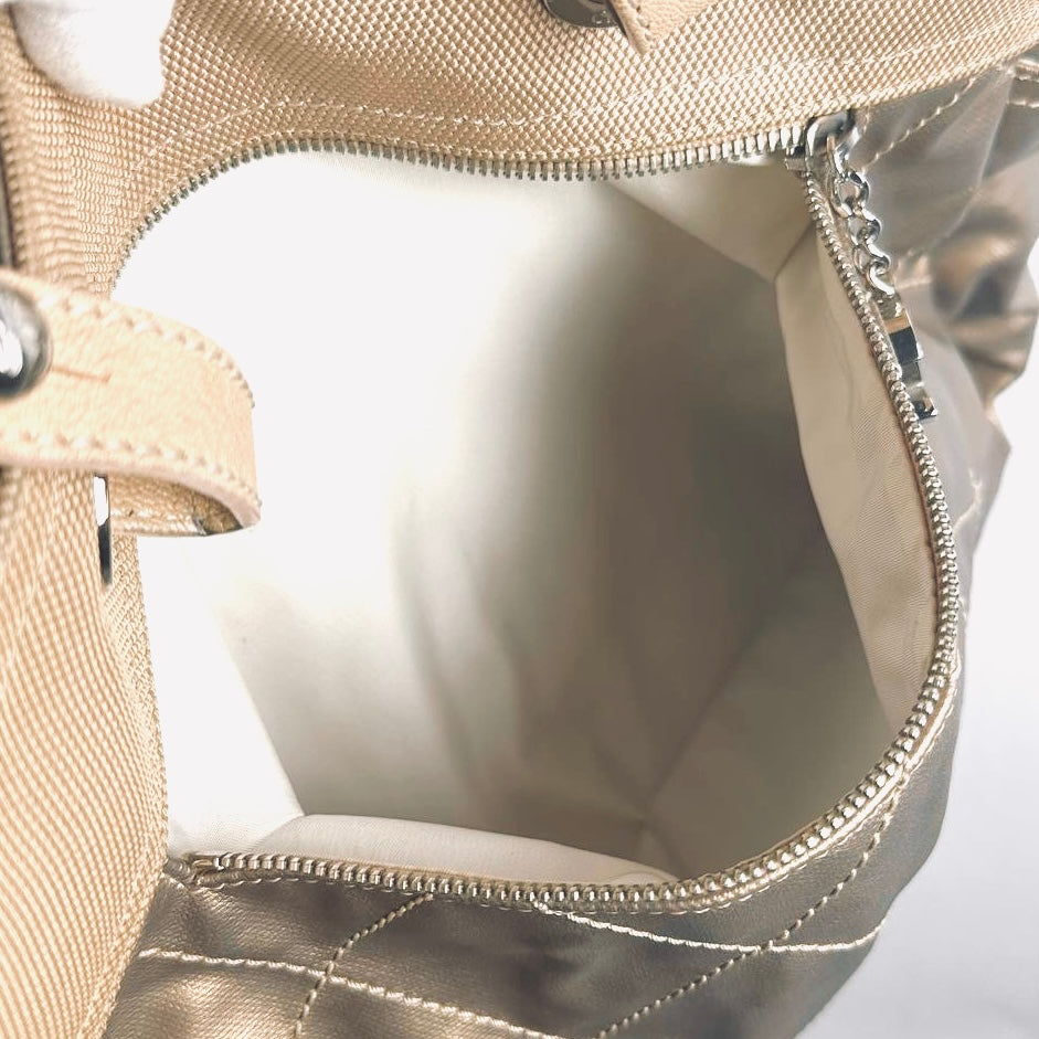 Chanel Beige Taupe Metallic Paris Biarritz CC Monogram Logo Quilted Fabric & Leather Shopper Shoulder Tote Bag With Pockets 11s