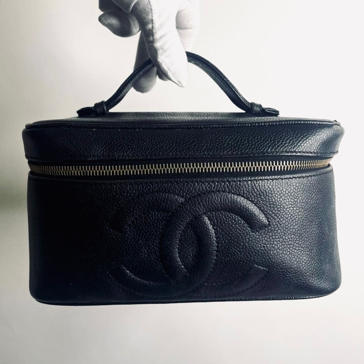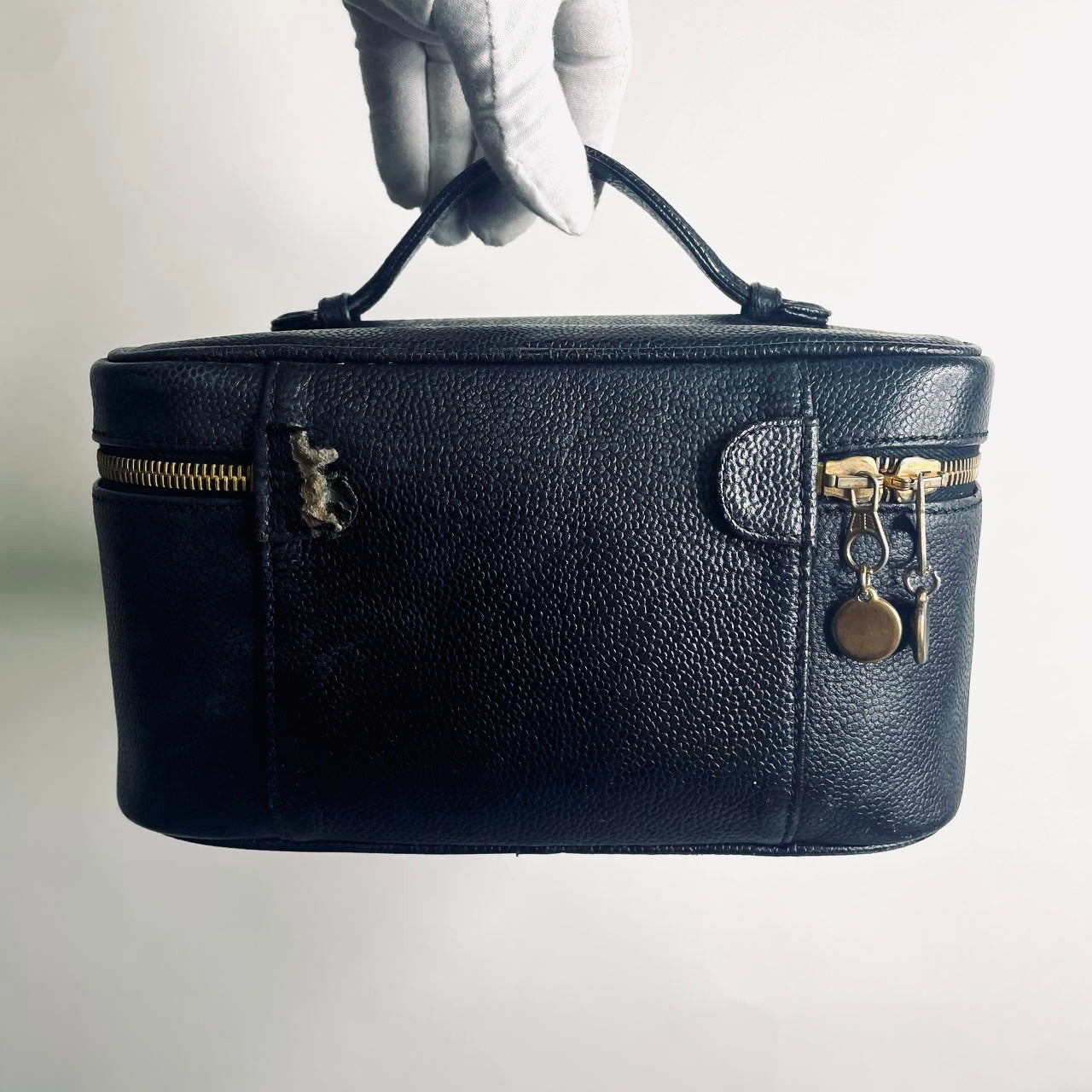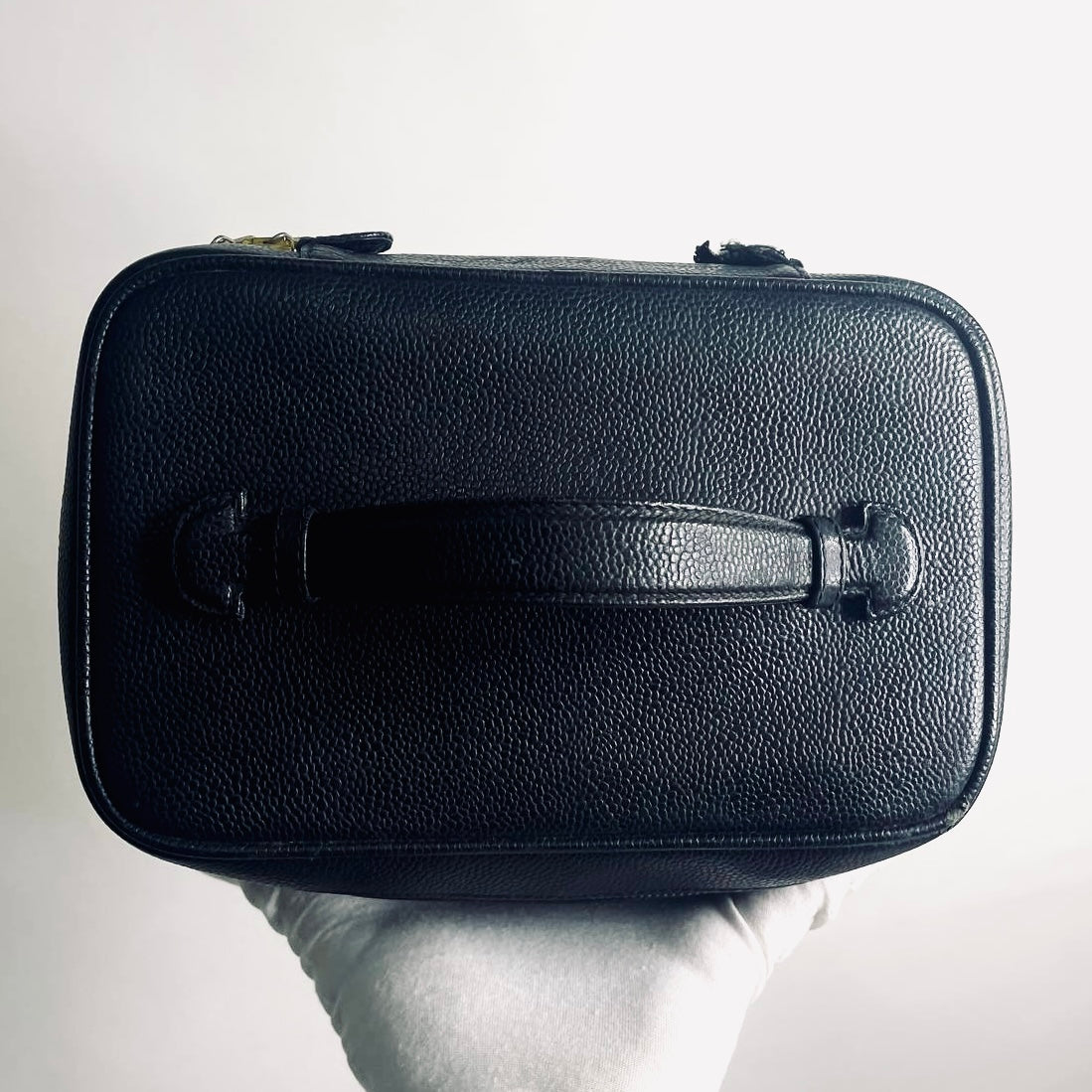 Chanel Black GHW Caviar Giant CC Logo Wide Horizontal Vanity Case Vintage Top Handle Bag 4s