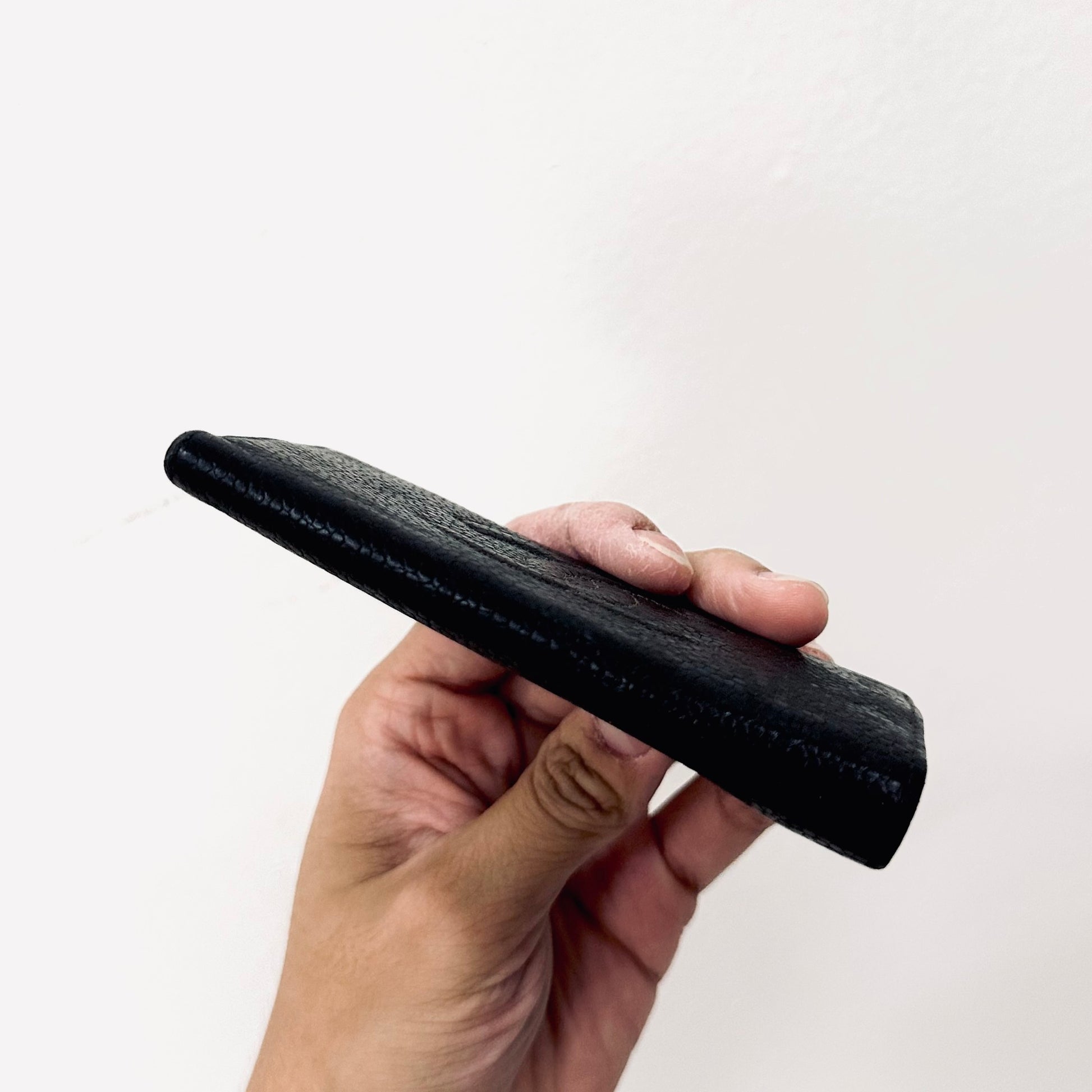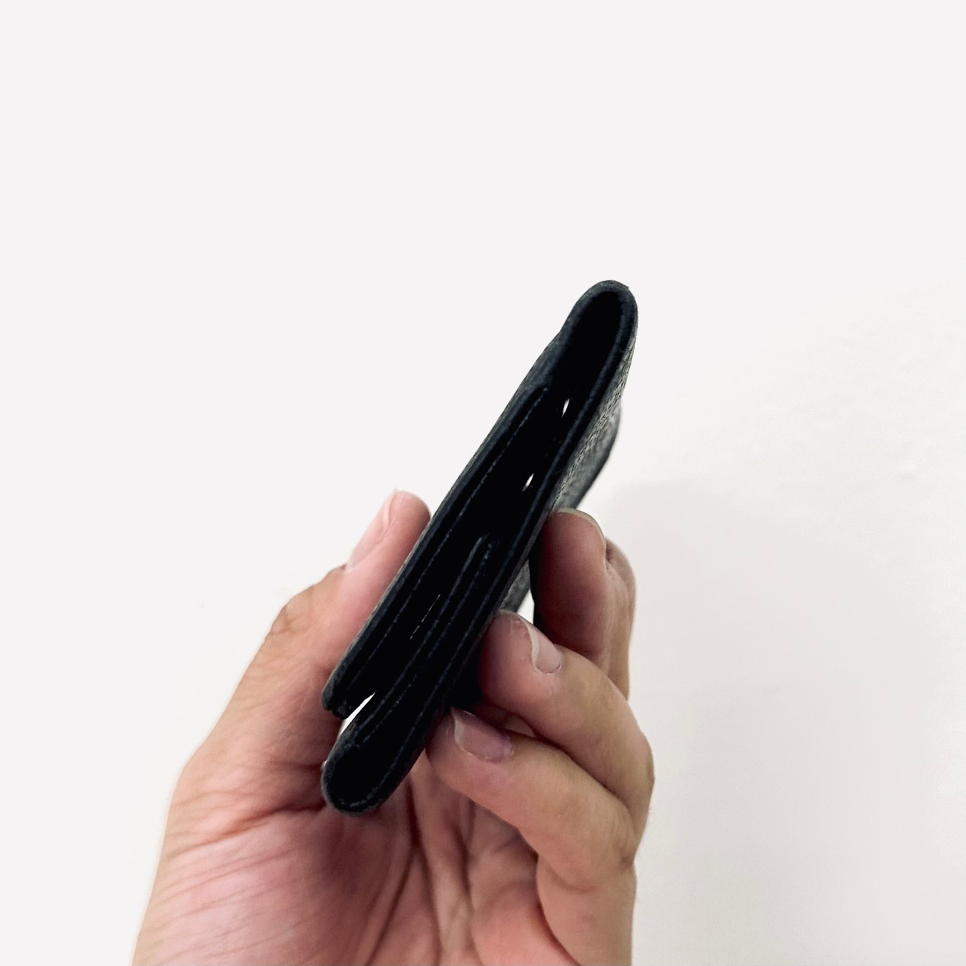 This has a flap button closure, key rings and slip pocket. This measures 10.5x7x1cm. This comes with clearly engraved hardware, interior stamping and holo.