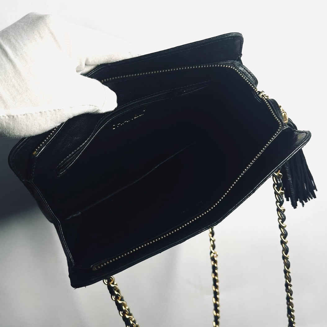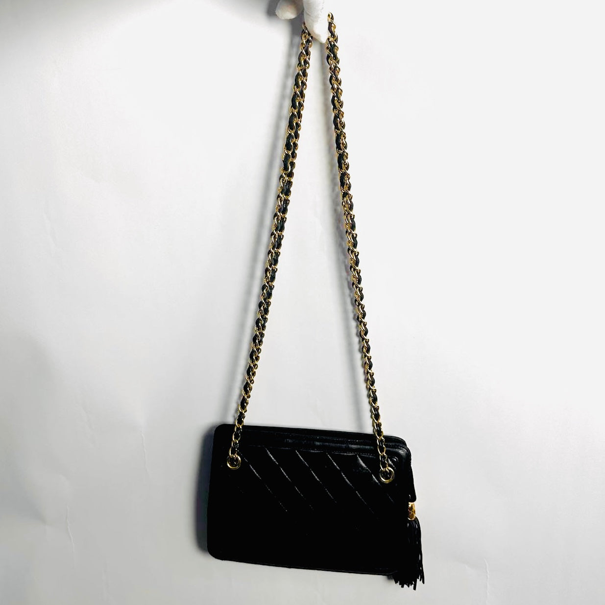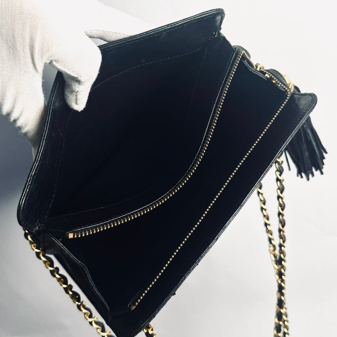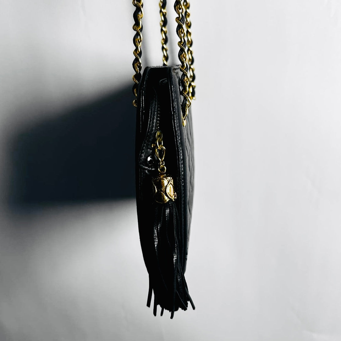 Chanel Black GHW Quilted Lambskin CC Logo Vintage Zip Shoulder Sling Bag 1s with Tassel Fringe
