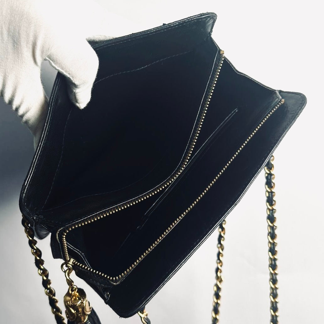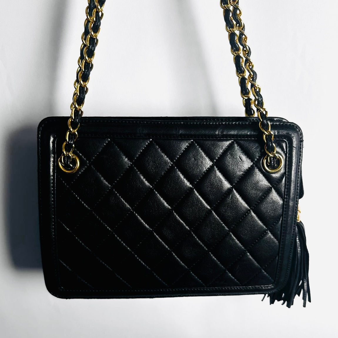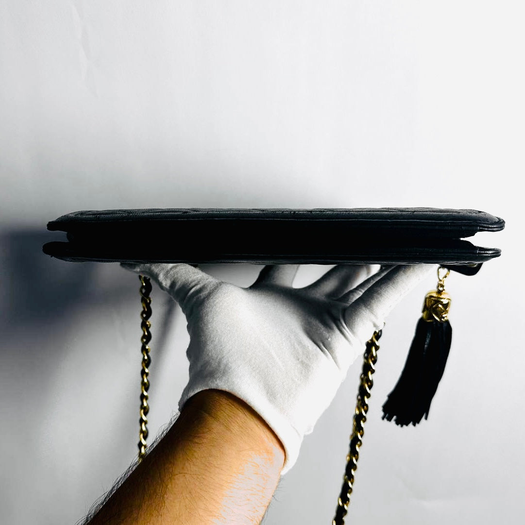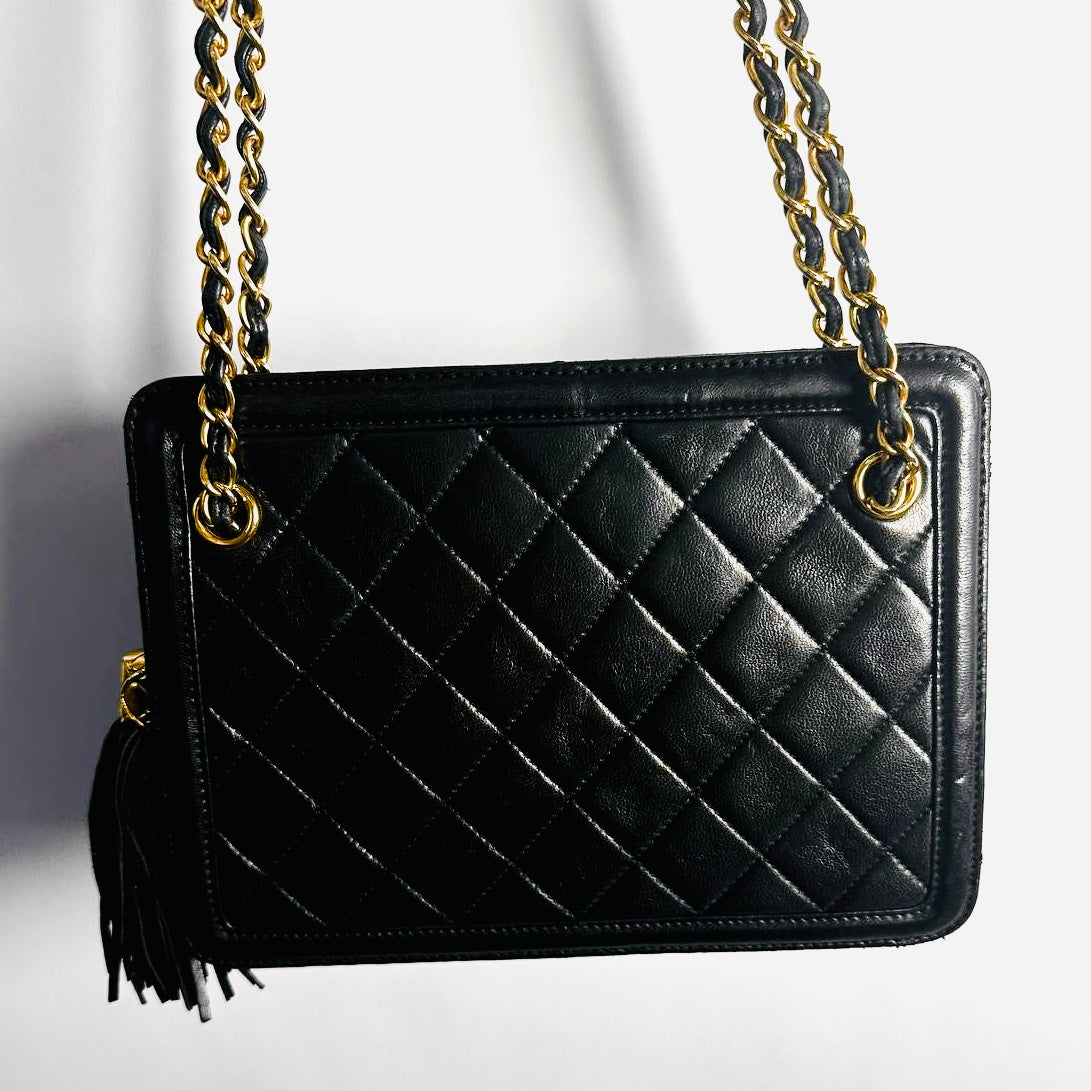 Chanel Black GHW Quilted Lambskin CC Logo Vintage Zip Shoulder Sling Bag 1s with Tassel Fringe