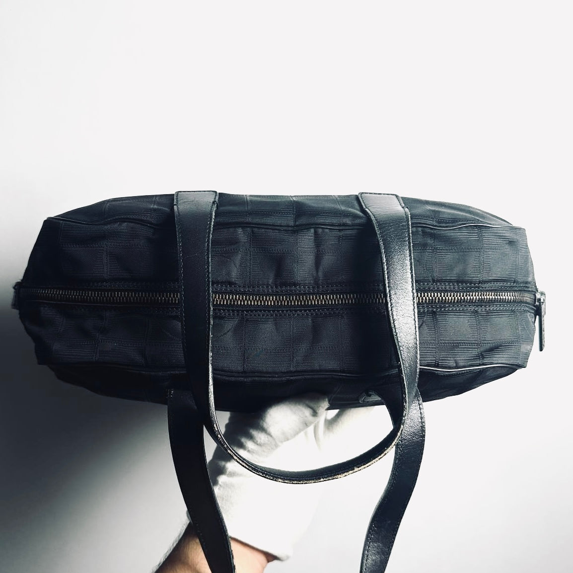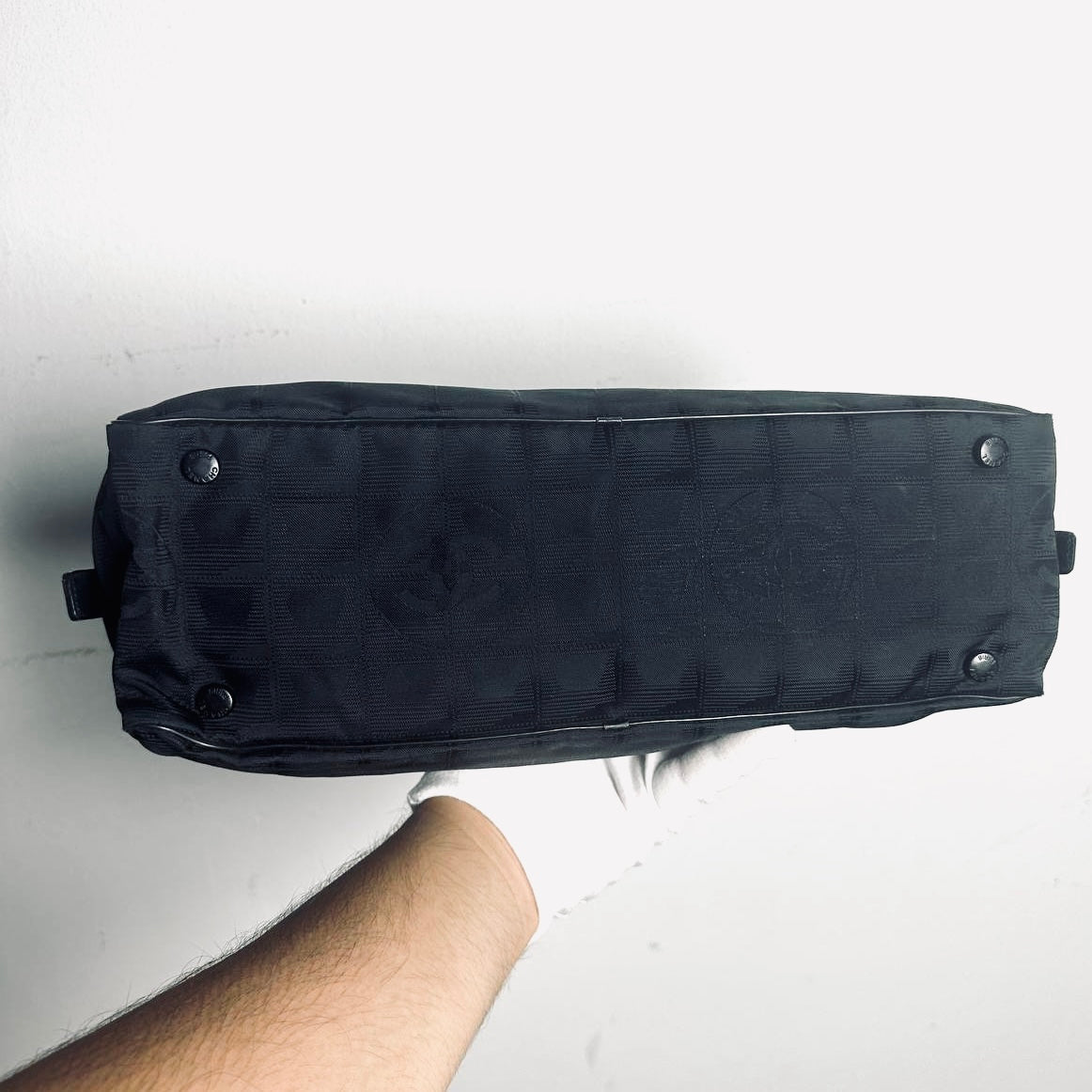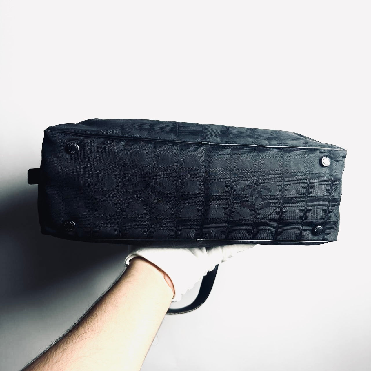 Chanel Black Travel Line East West Quilted Jacquard CC Monogram Logo Shoulder Shopper Boston Tote Bag 7s