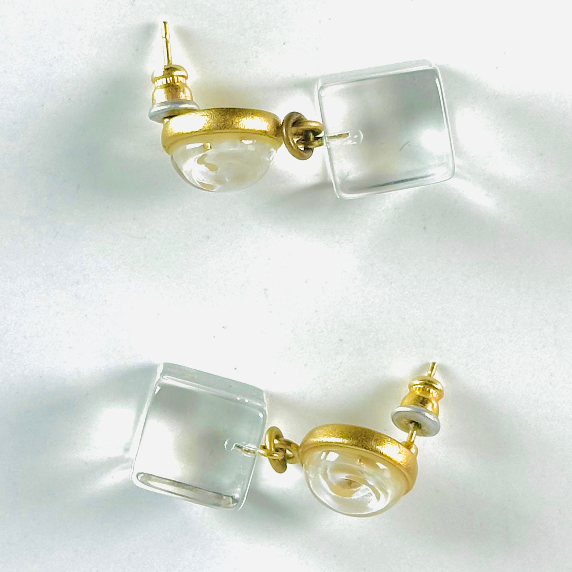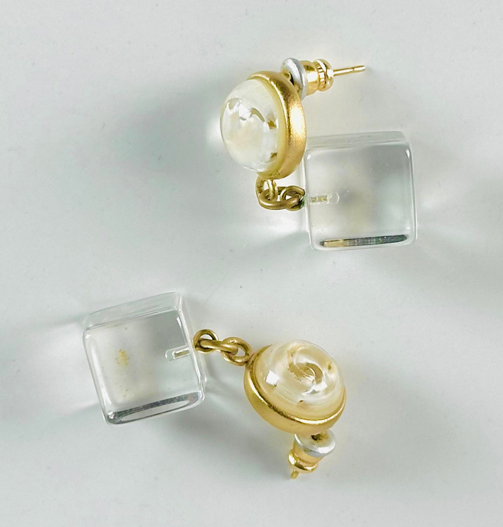 Chanel CC Monogram Logo Pearl & Cubes Gold Dangling Vintage Stud Earrings