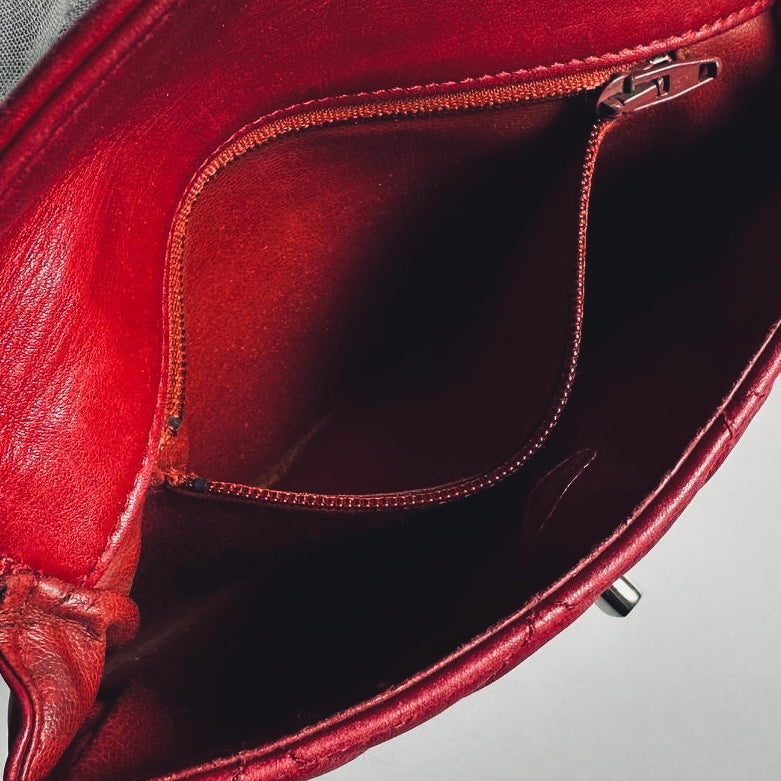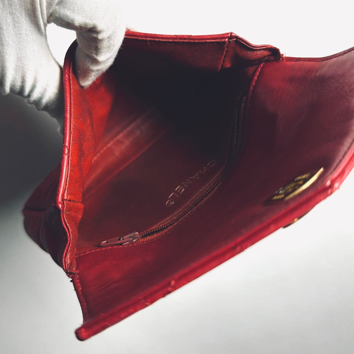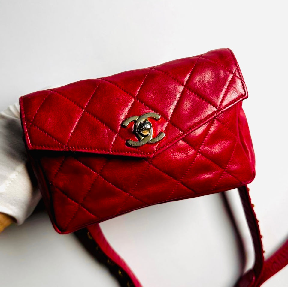Chanel Cherry Red GHW Giant CC Logo Quilted Lambskin Turnlock 2-Way Vintage Belt Waist Shoulder Sling Bag Clutch Pouch