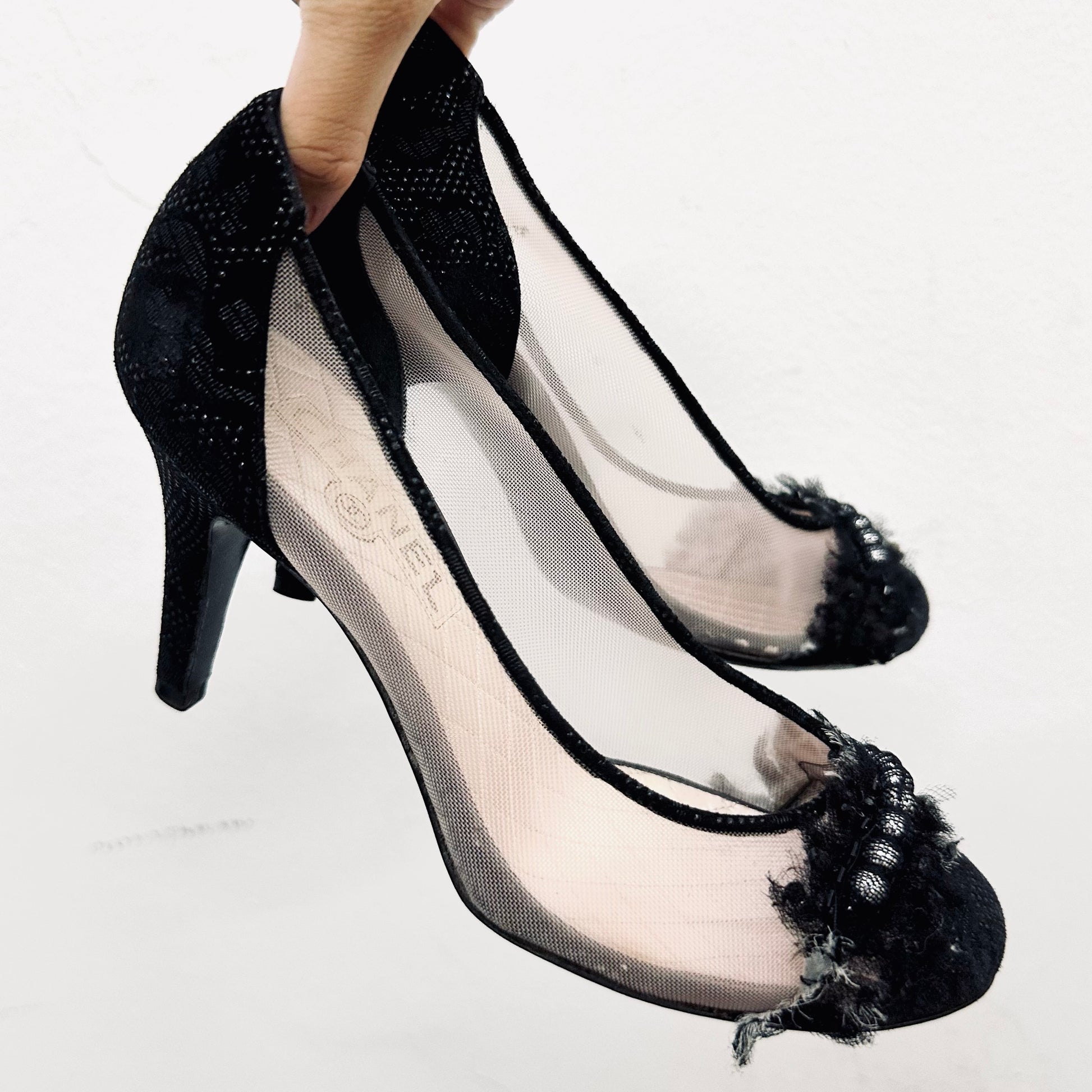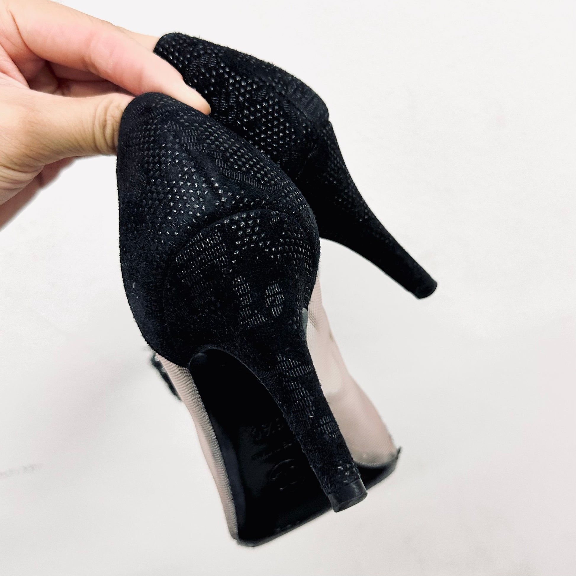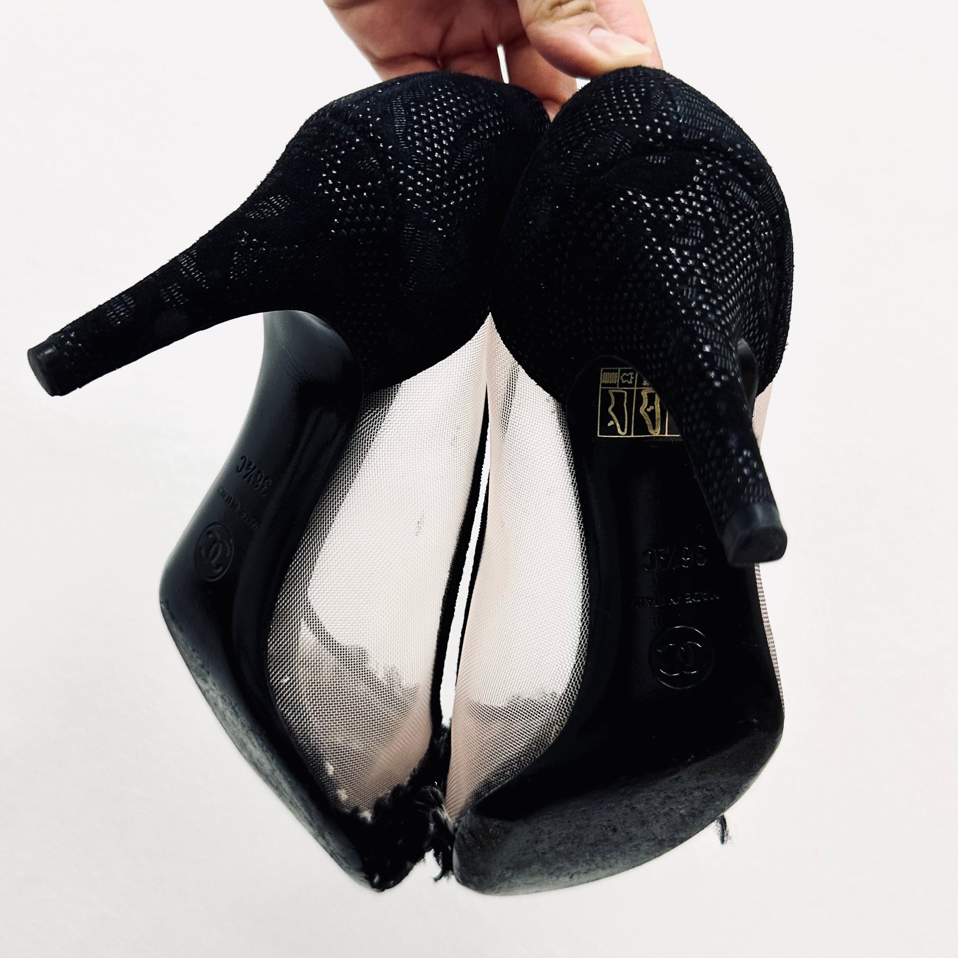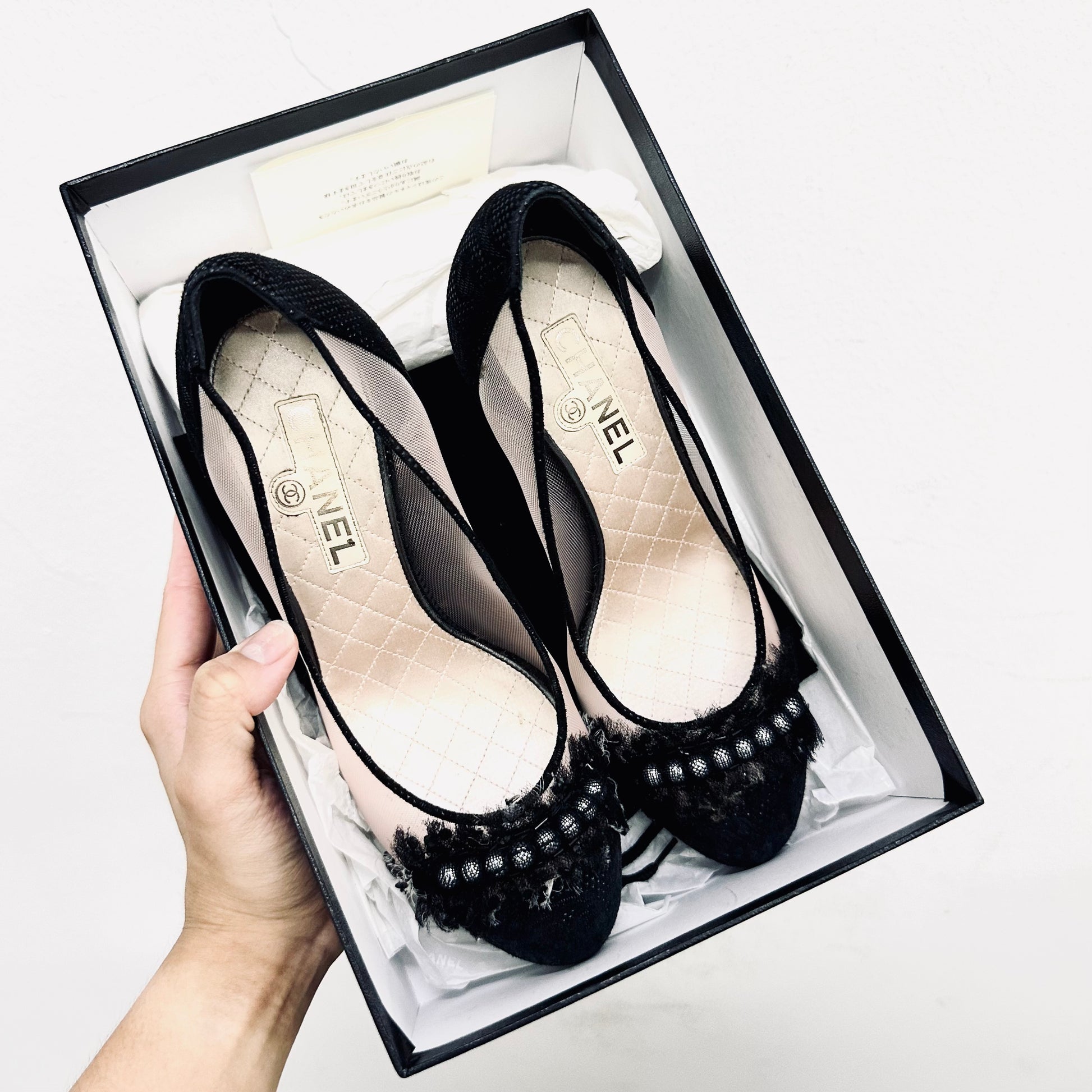 Chanel Classic CC Monogram Logo Mesh Black Lace Closed Toe Ballet Ballerina Heels Pumps Shoes