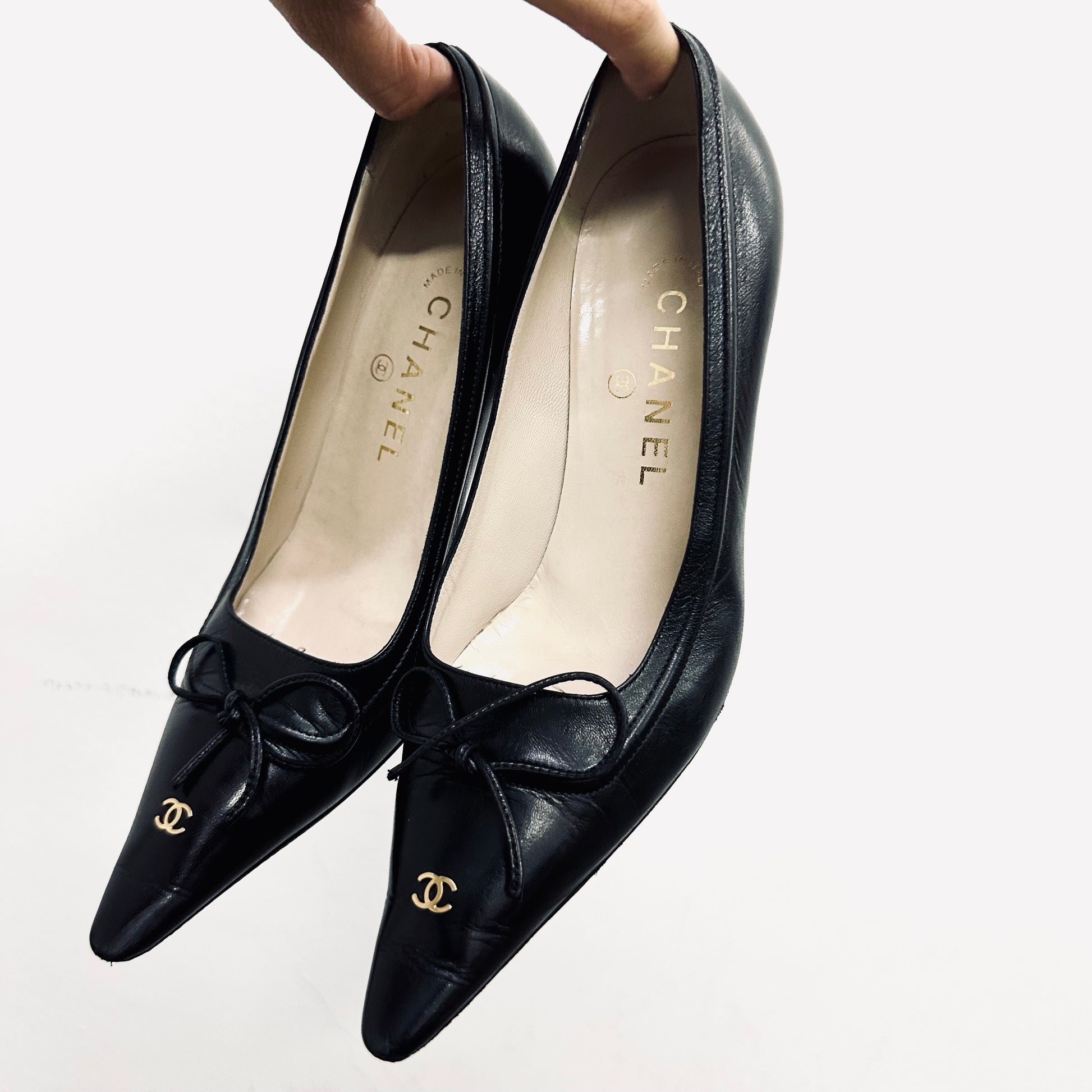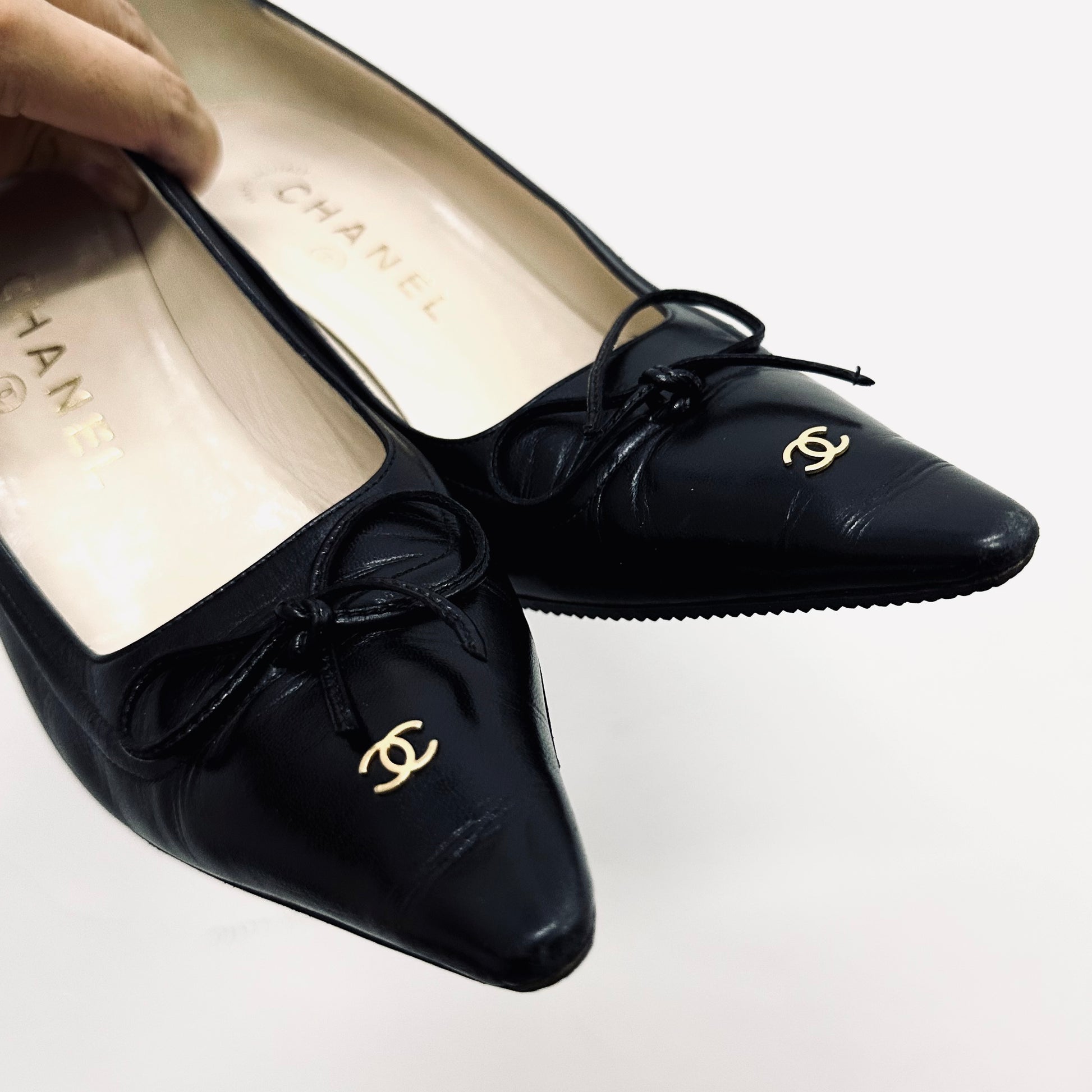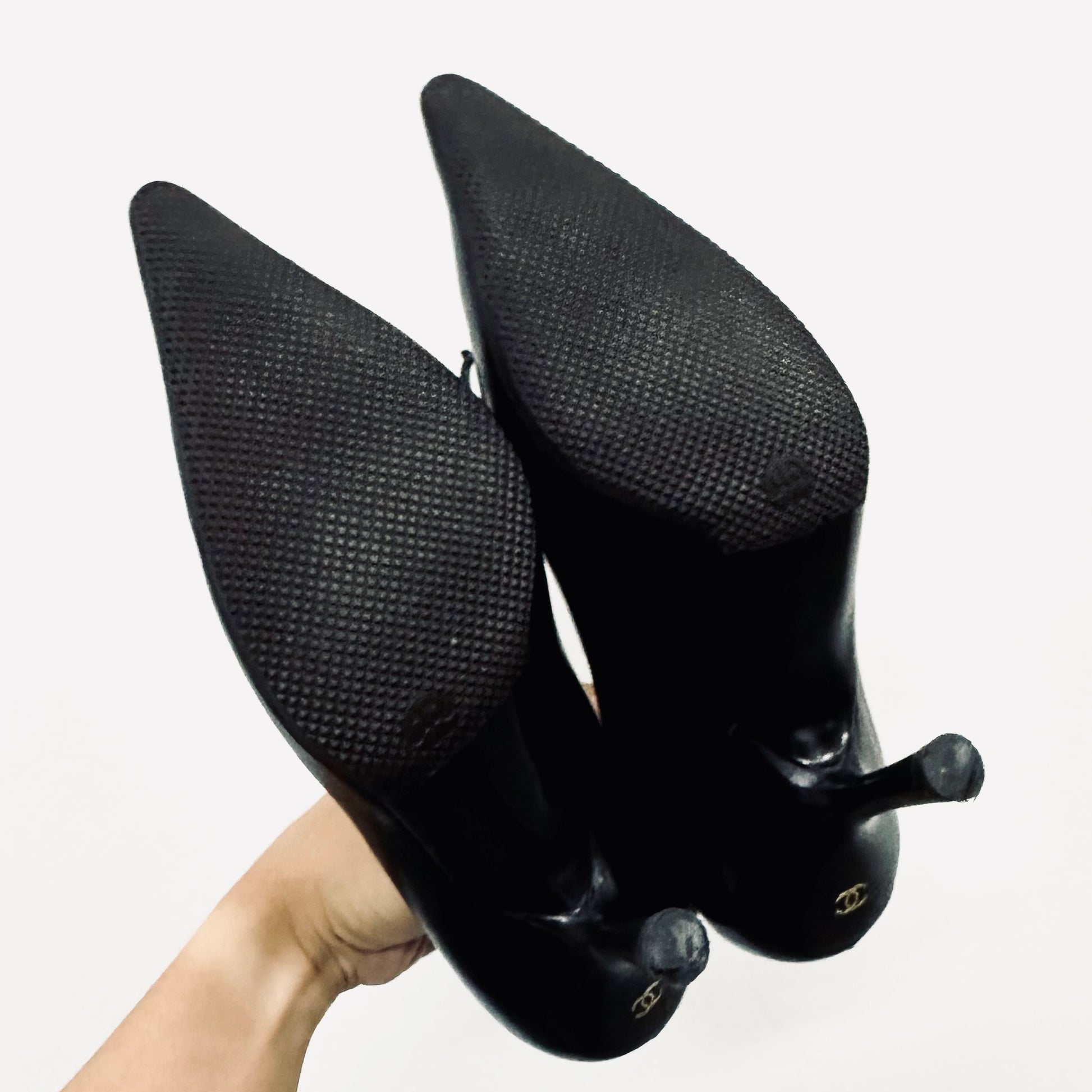 Chanel Classic Giant CC Logo Black GHW Lambskin Leather Closed Toe Bow Ballet Ballerina Mules Heels Pumps Shoes