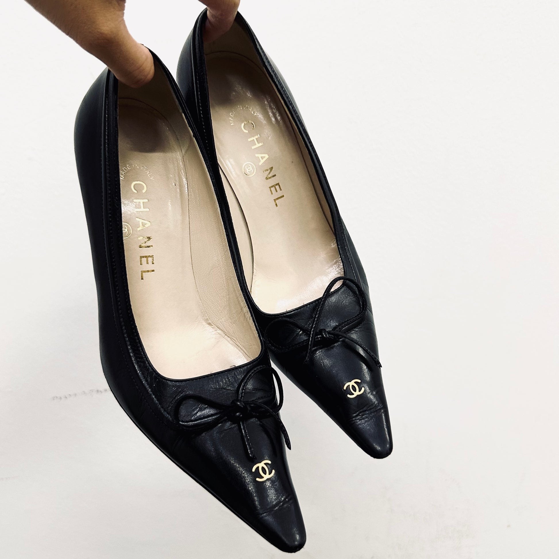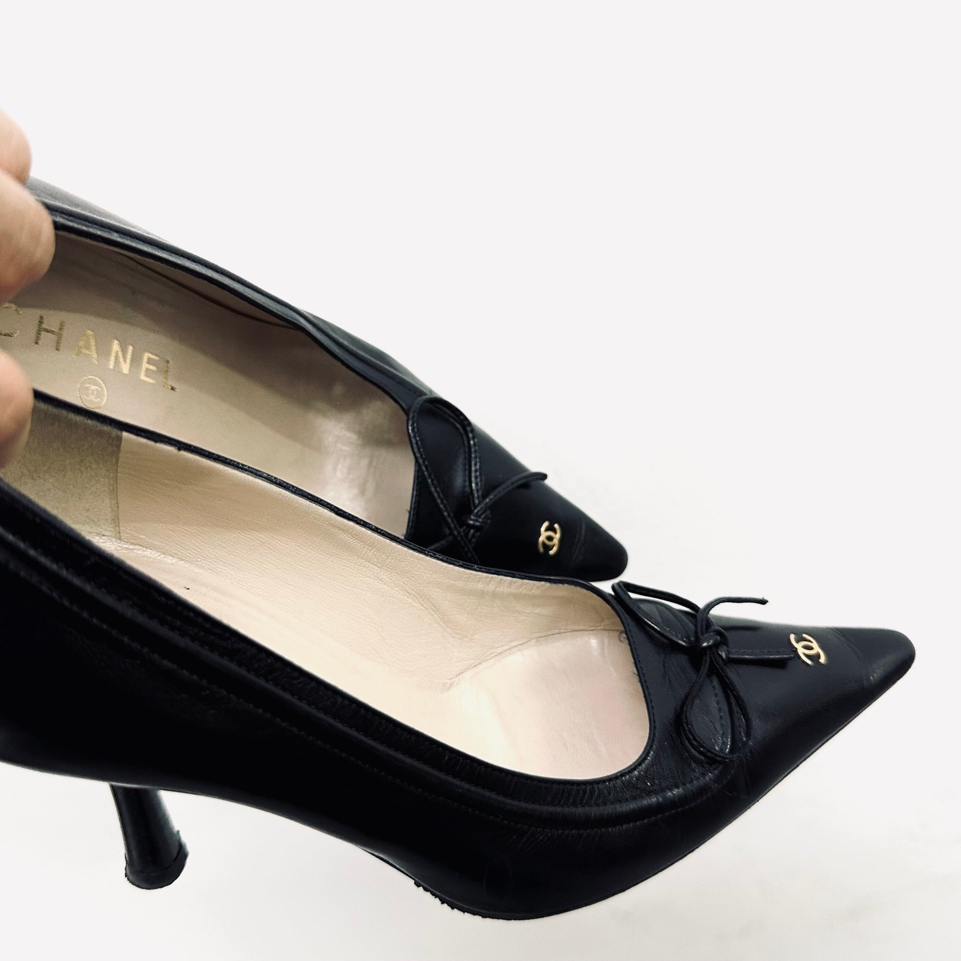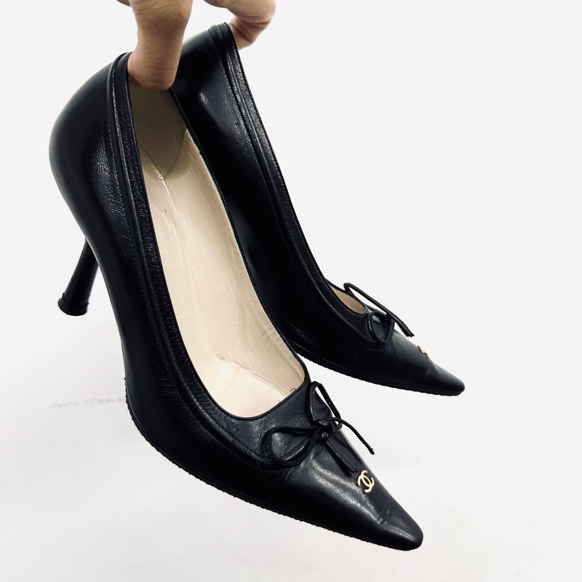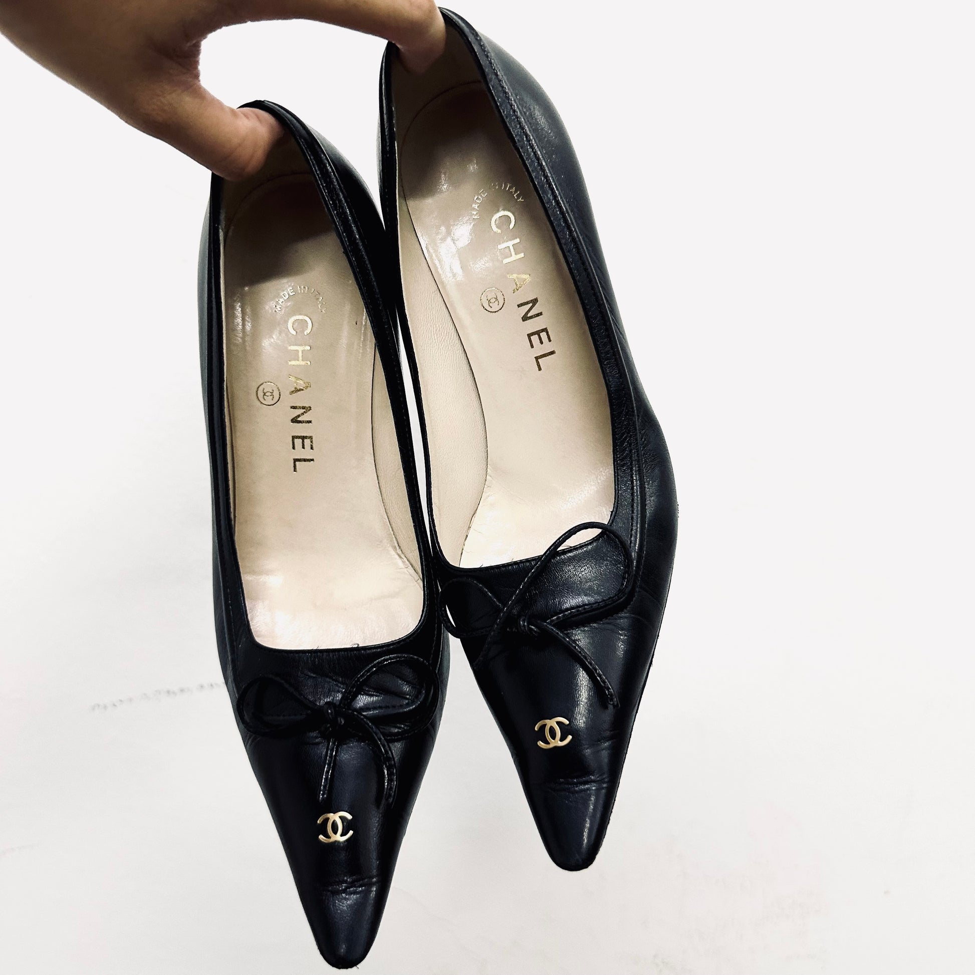 Chanel Classic Giant CC Logo Black GHW Lambskin Leather Closed Toe Bow Ballet Ballerina Mules Heels Pumps Shoes