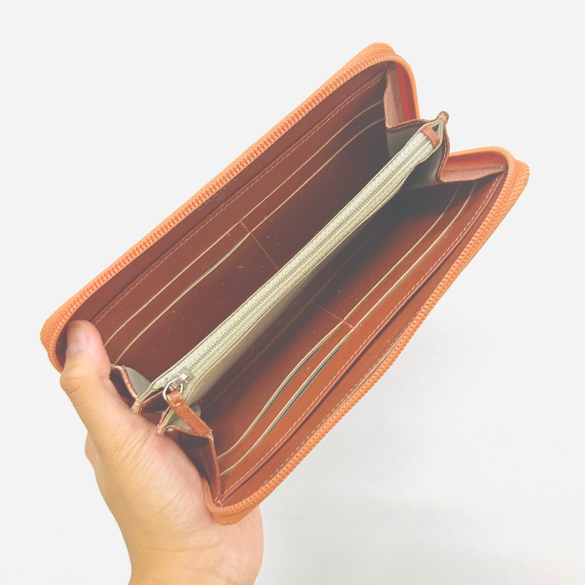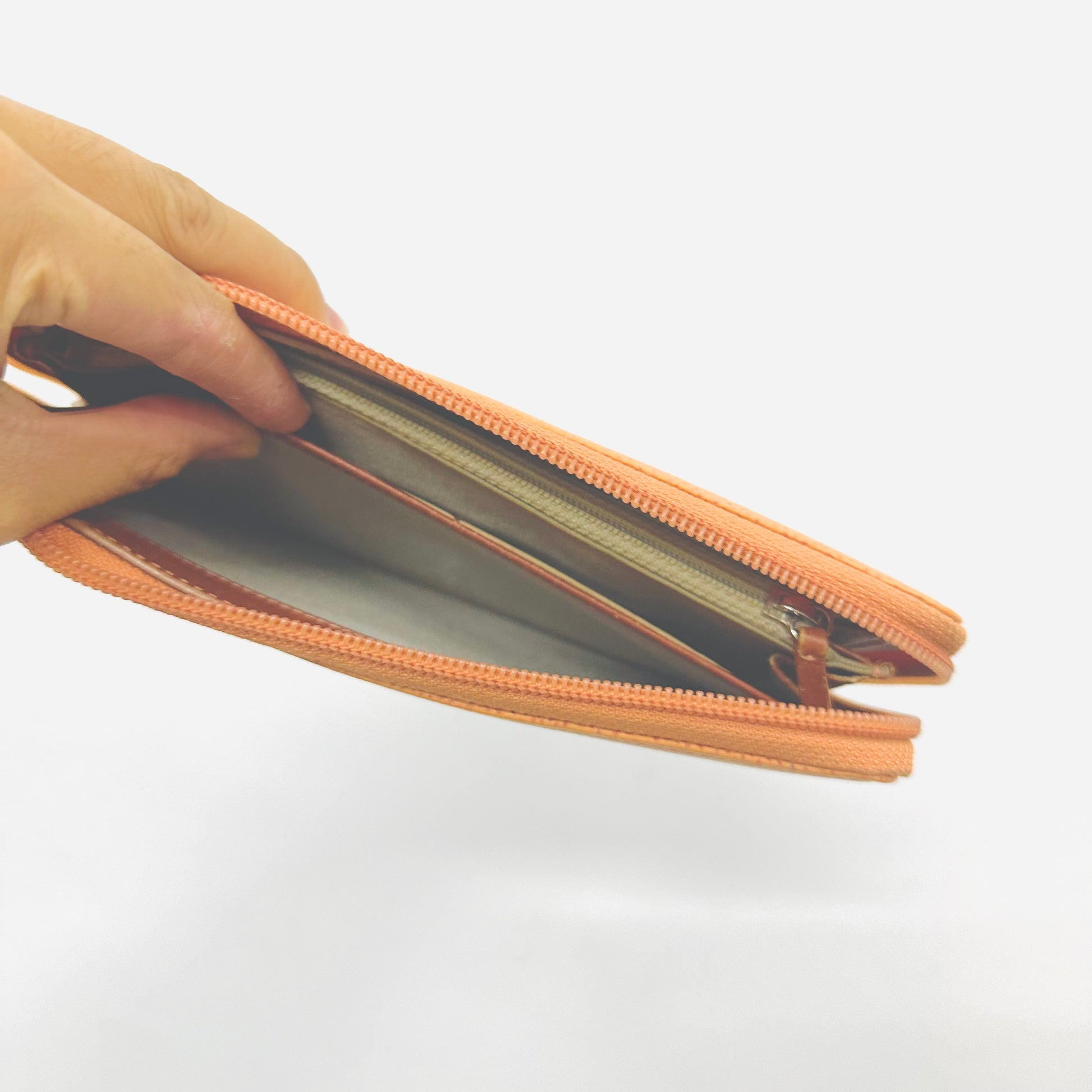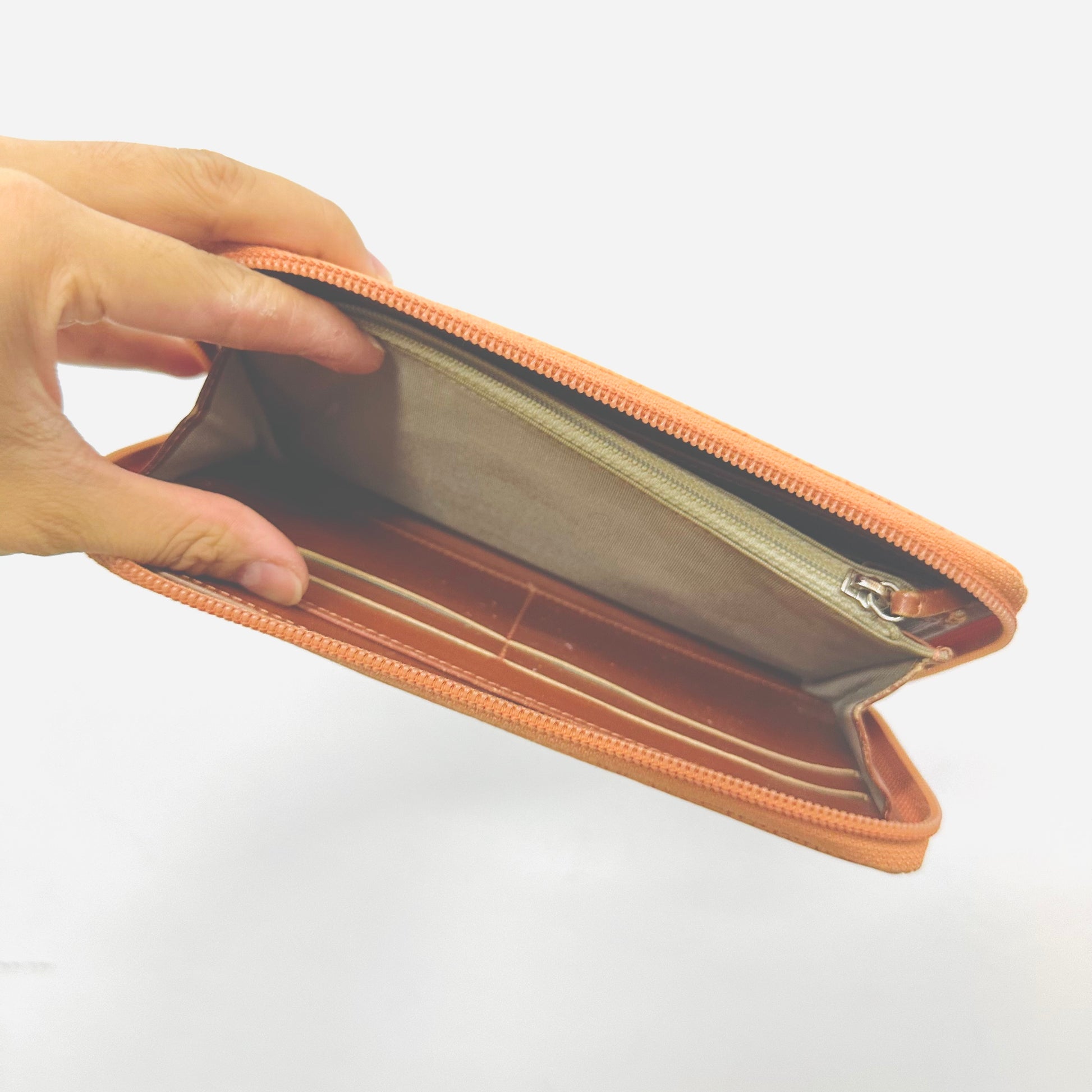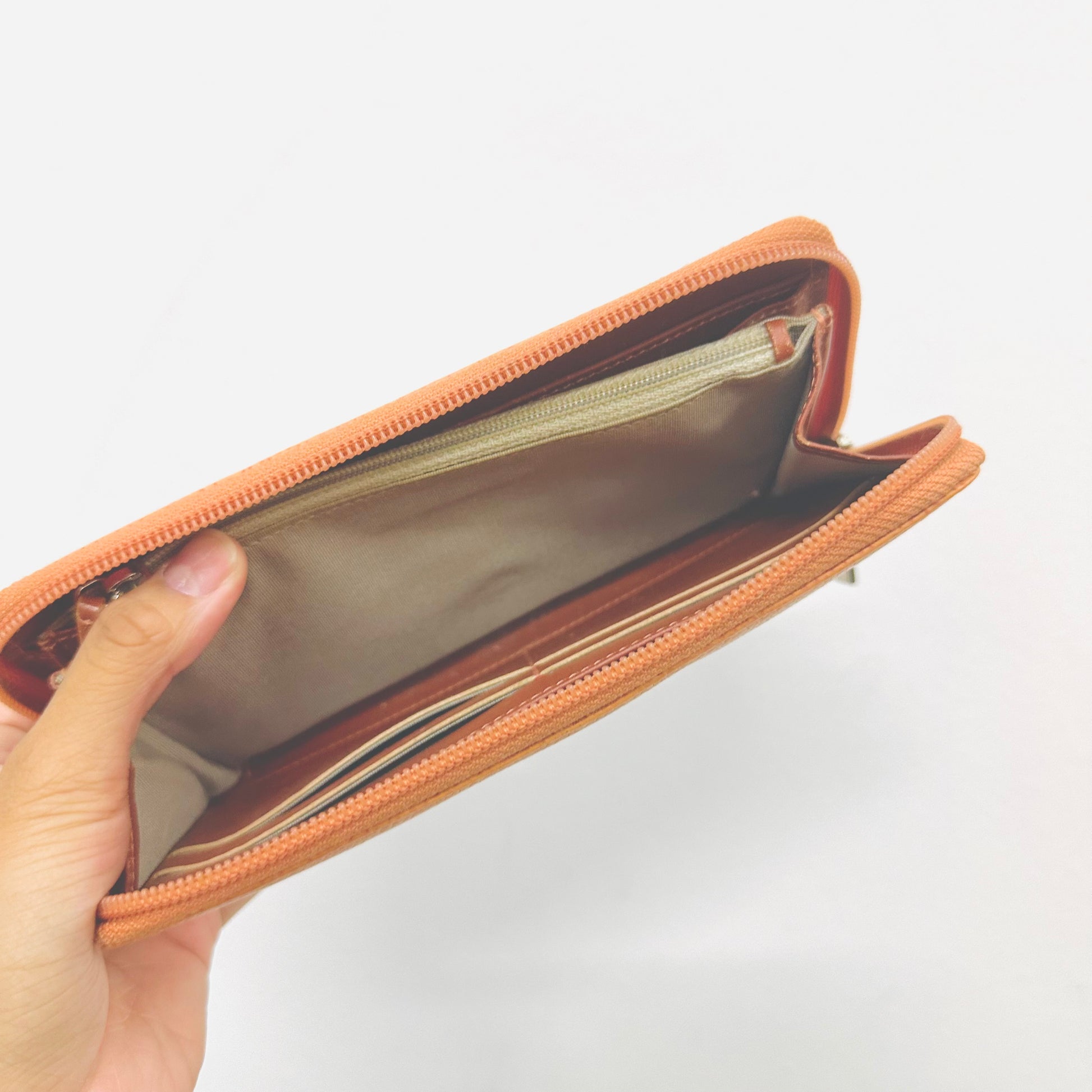 Preloved 9.4/10. This has a zip around closure, card slots, notes compartment, zip pocket and slip pockets. This measures 19.5x10.5x2cm.