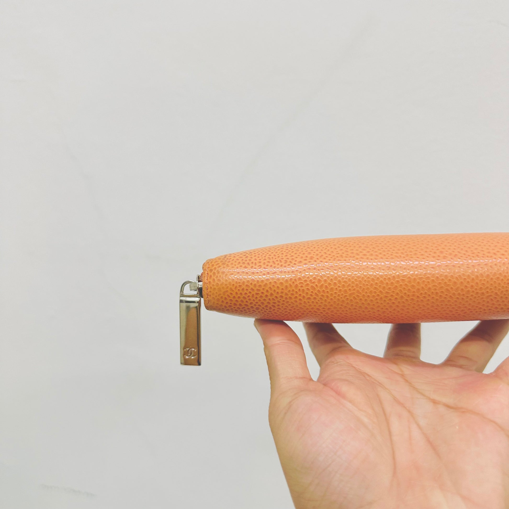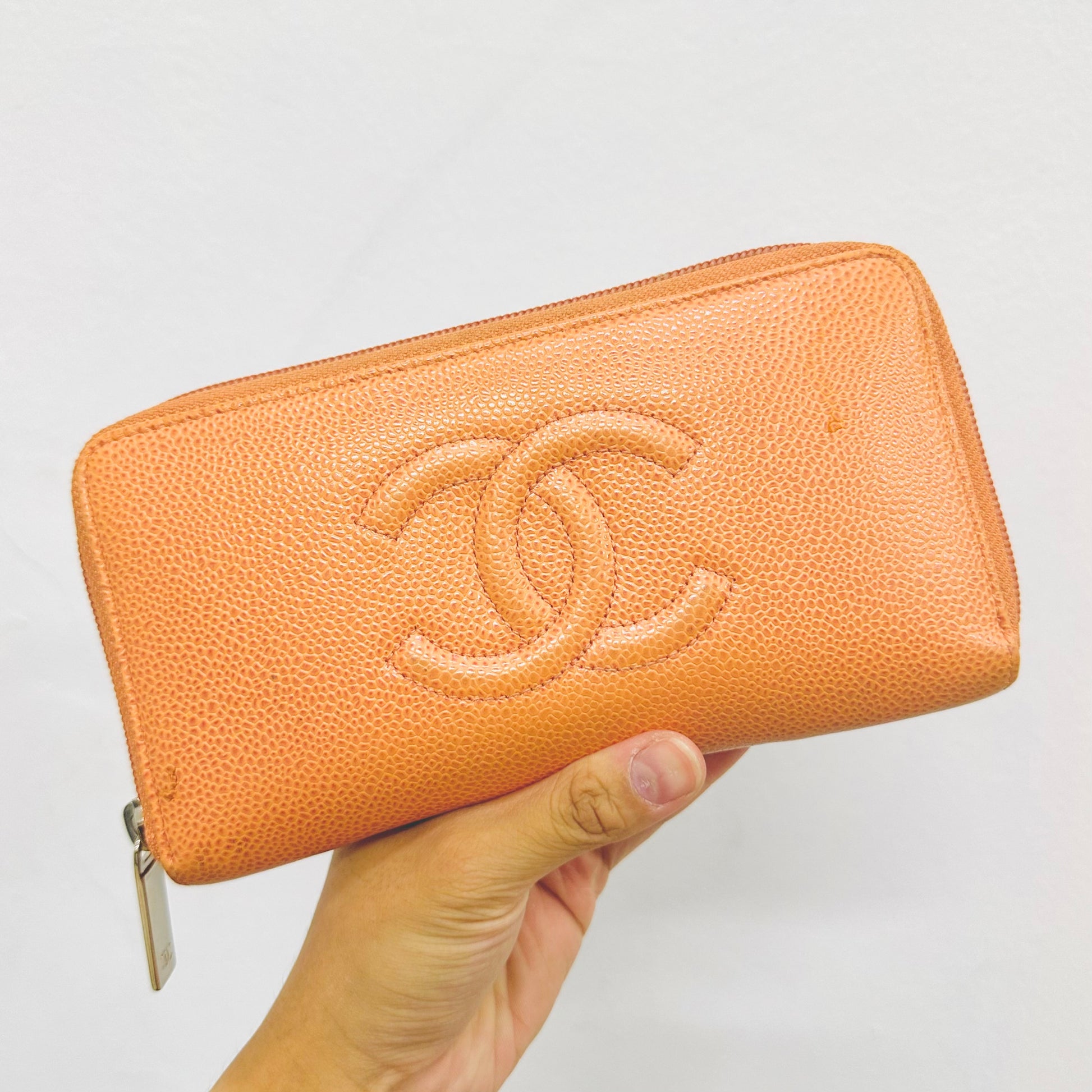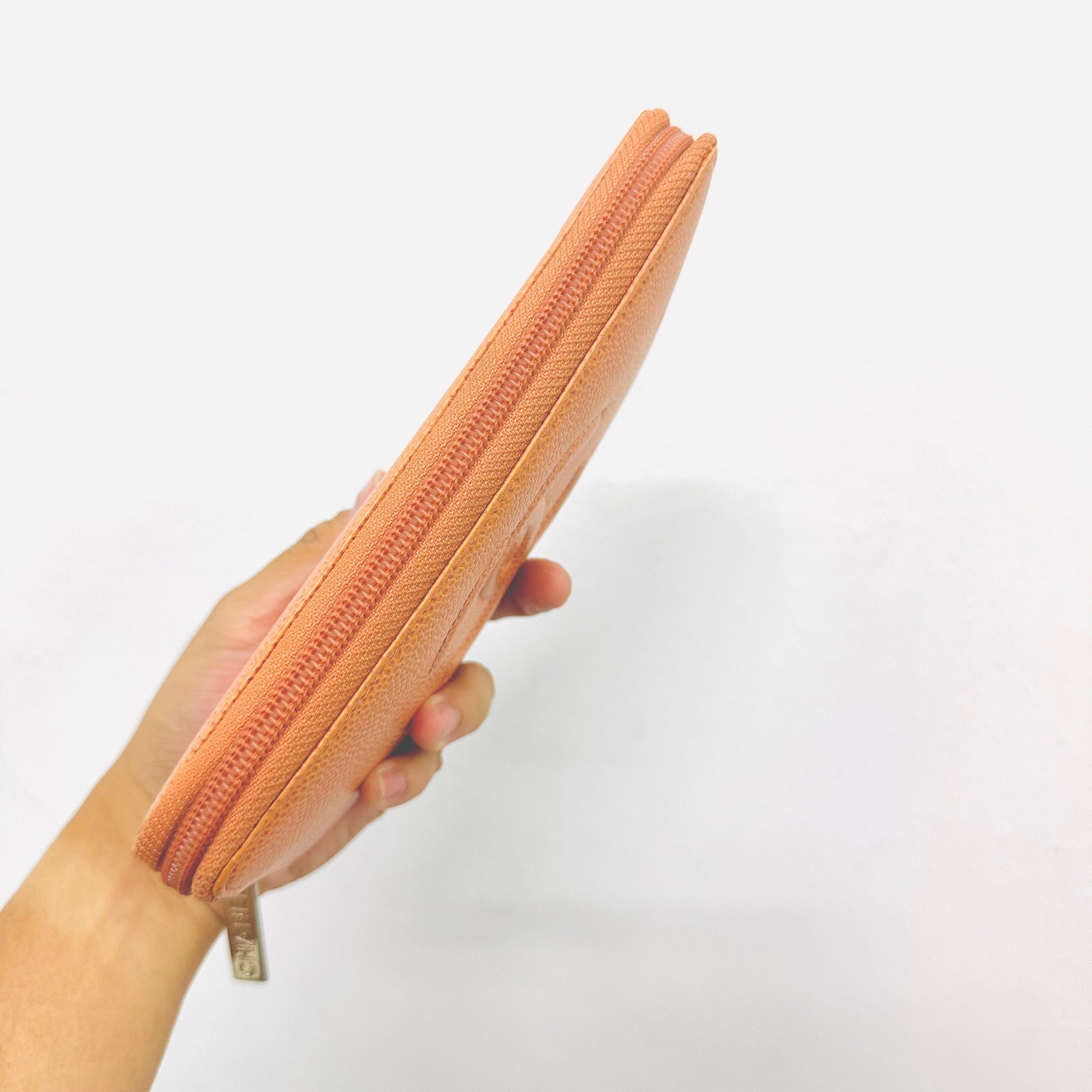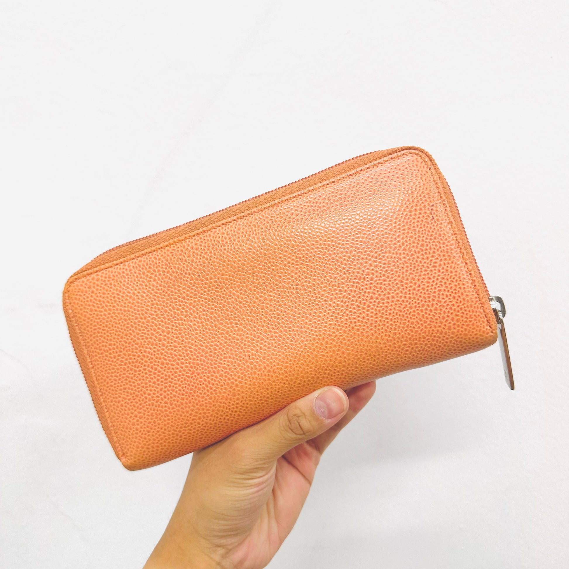 Preloved 9.4/10. This has a zip around closure, card slots, notes compartment, zip pocket and slip pockets. This measures 19.5x10.5x2cm.