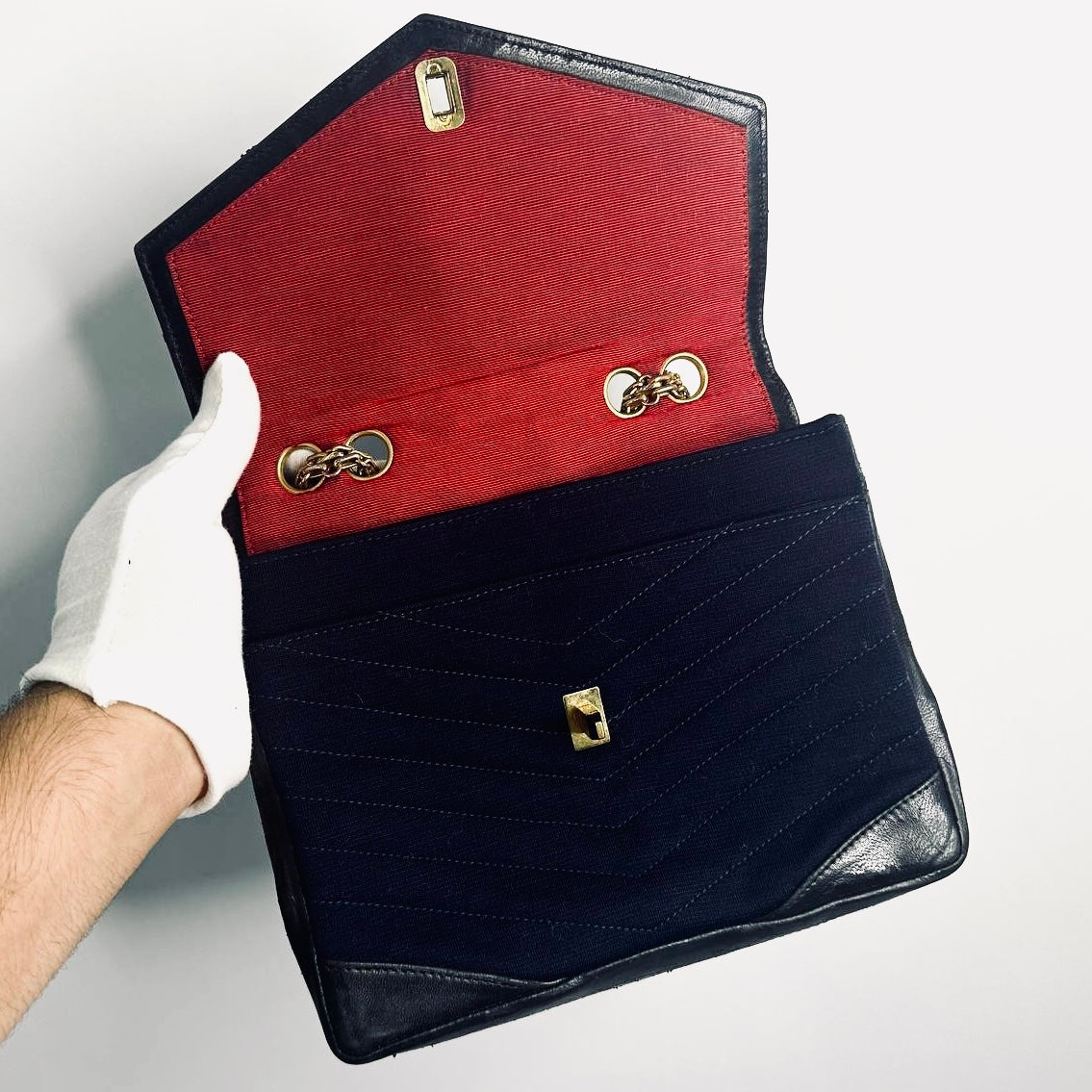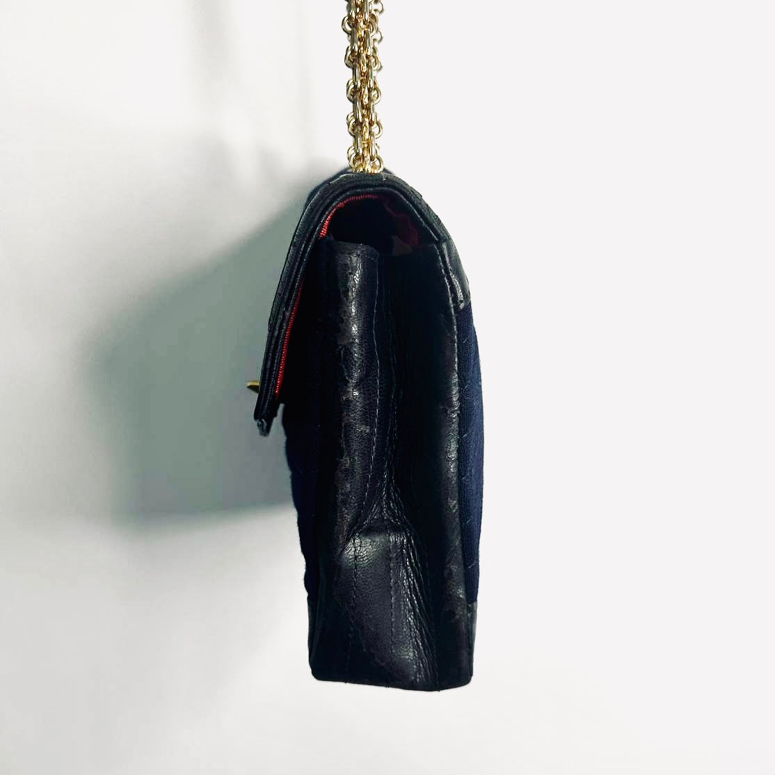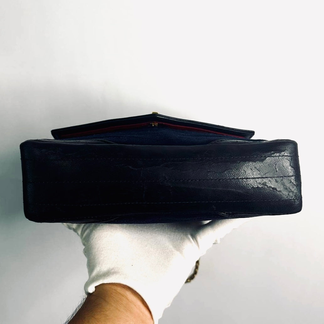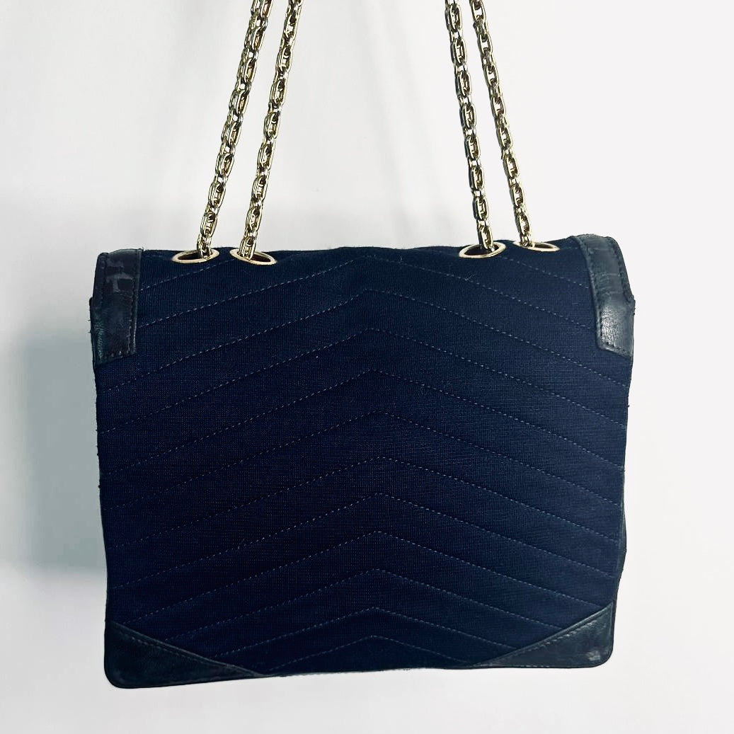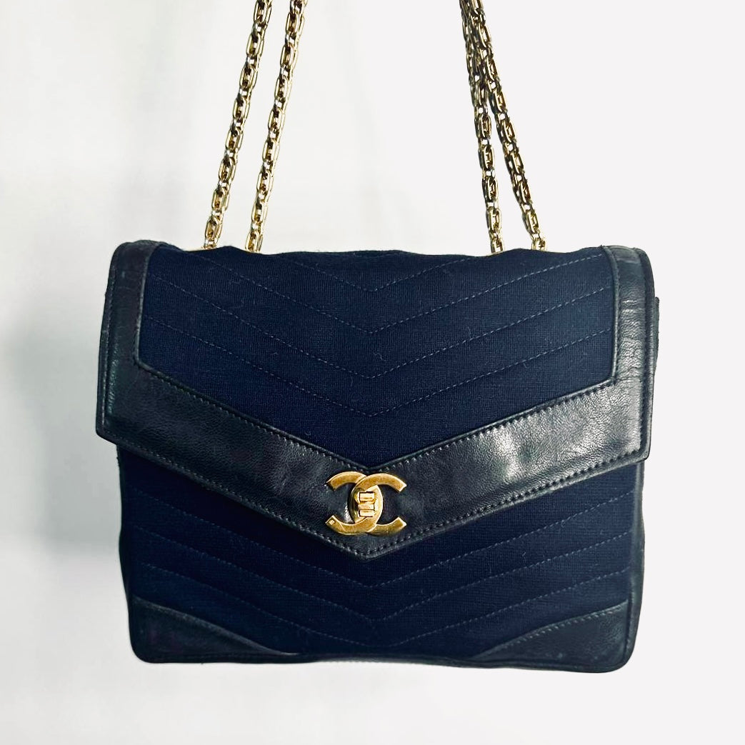 Chanel Navy Blue GHW CC Logo Turnlock Small Classic Single Chevron Quilted Jersey & Lambskin Flap Reissue Chain Vintage Shoulder Sling Bag Pre Series