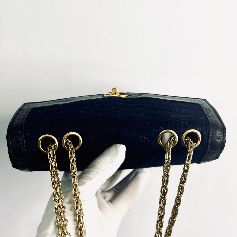 This has a front turnlock flap closure, back pocket, front pocket, central compartment, slip pockets and zip pocket. This measures 23x17x6cm. This comes with dustbag and gold hallmark.