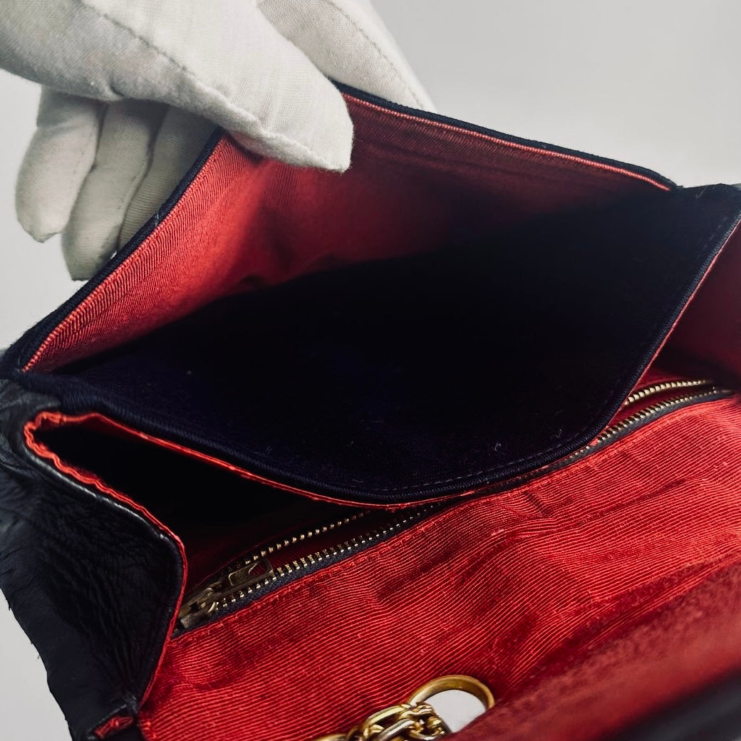 Preloved 9.3/10. This has a front turnlock flap closure, back pocket, front pocket, central compartment, slip pockets and zip pocket. This measures 23x17x6cm.
