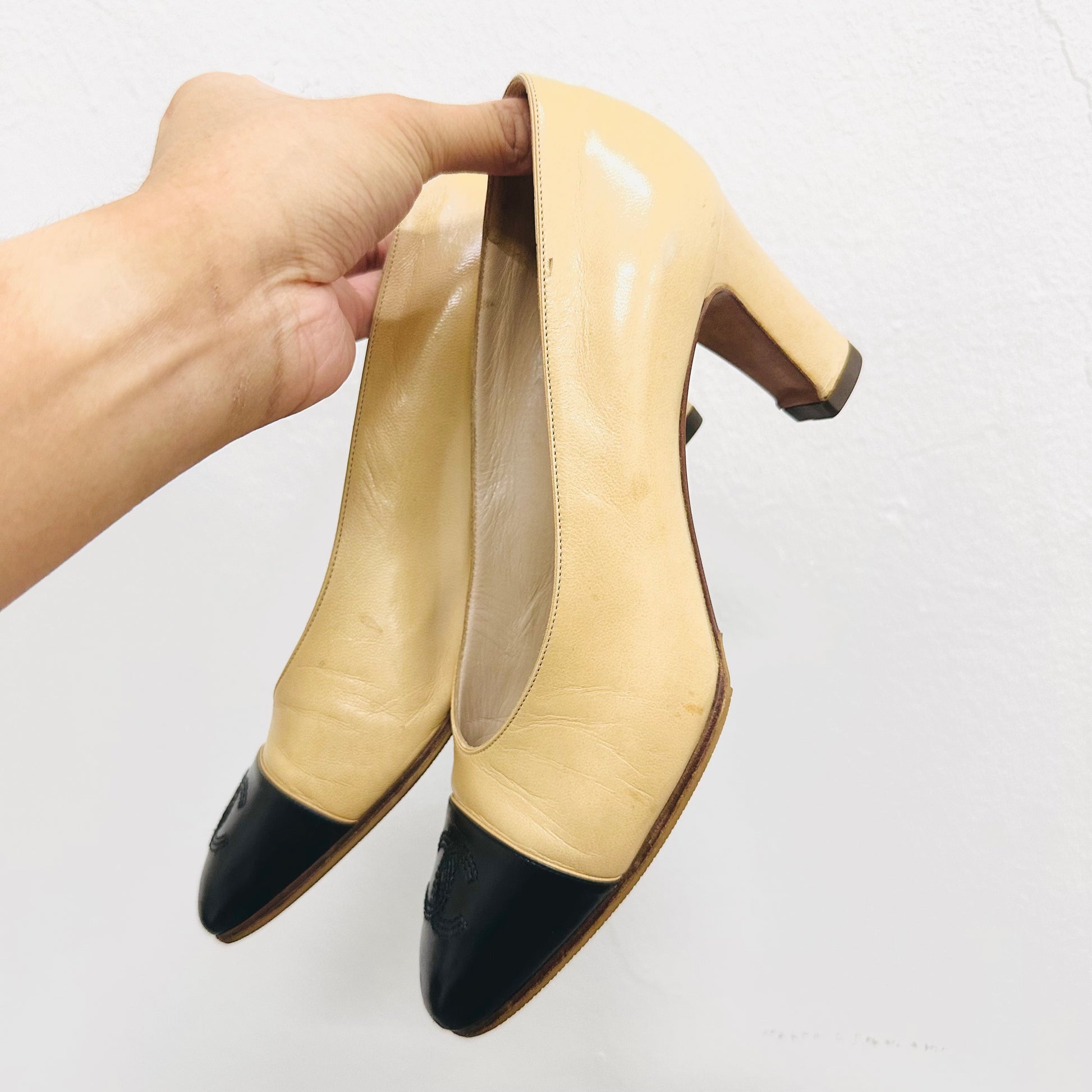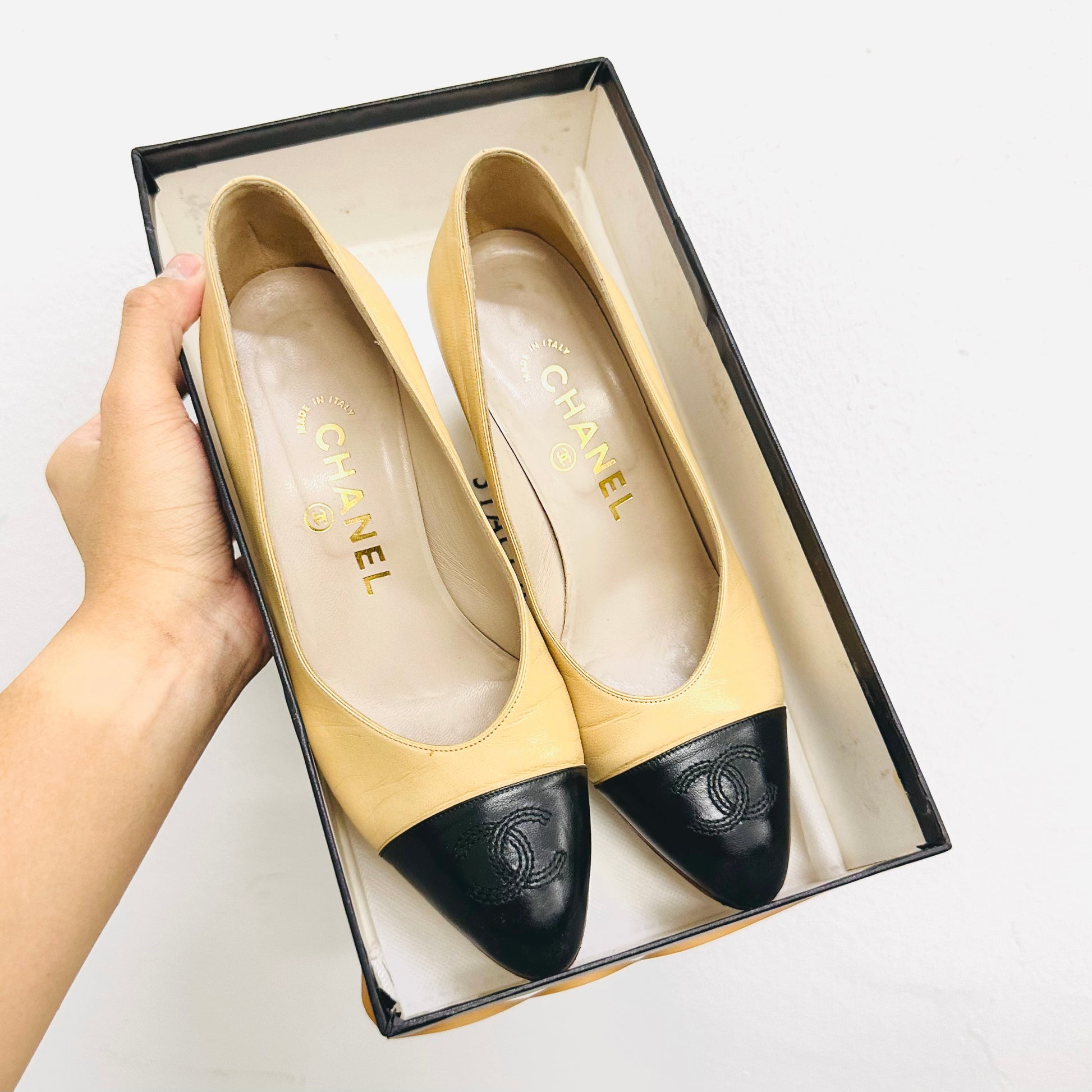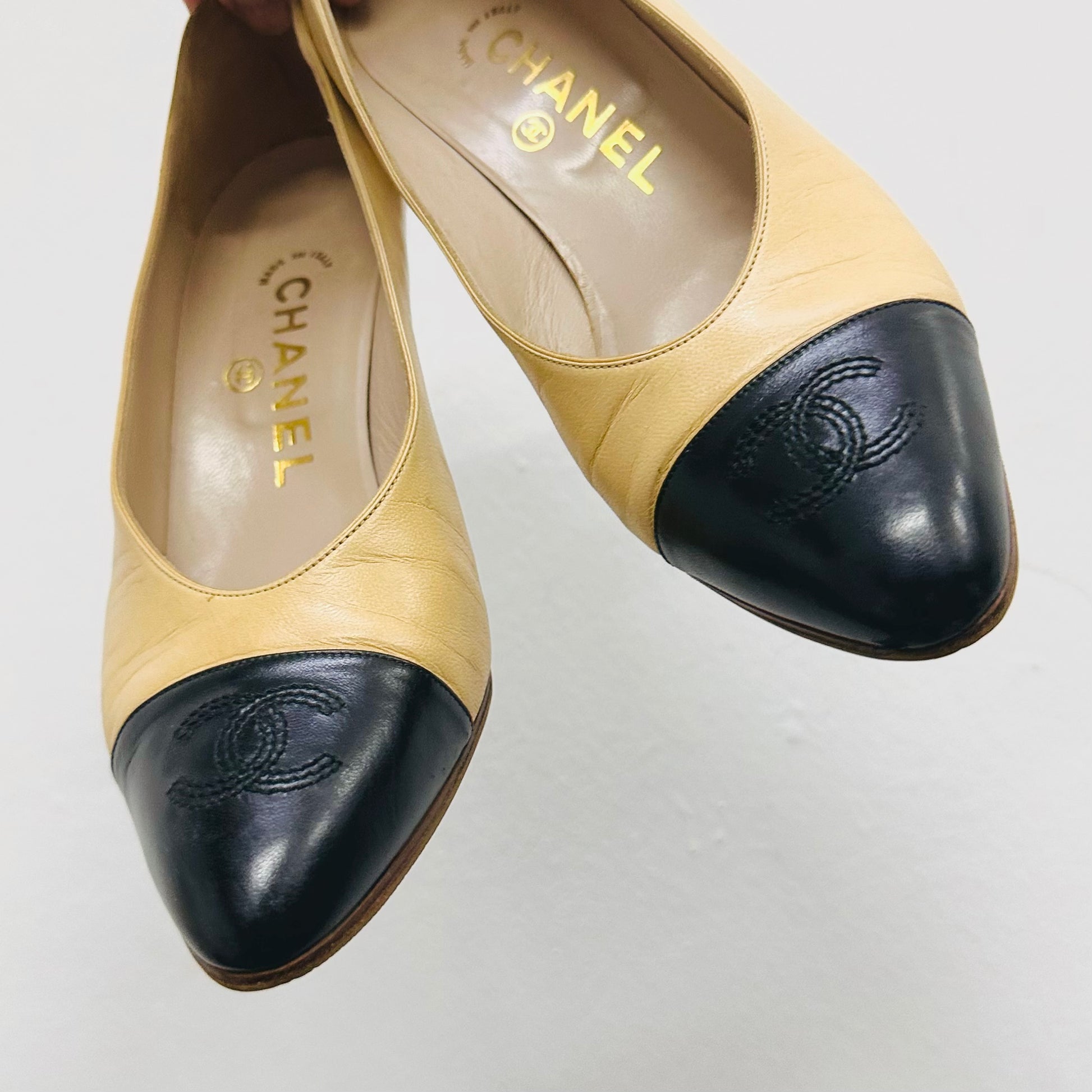 Chanel Two Tone Classic Giant CC Logo Beige / Black Lambskin Leather Closed Toe Bow Ballet Ballerina Block Mules Heels Pumps Shoes