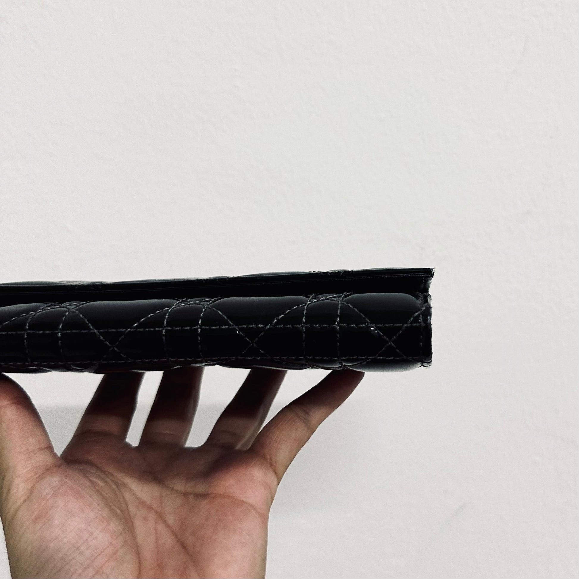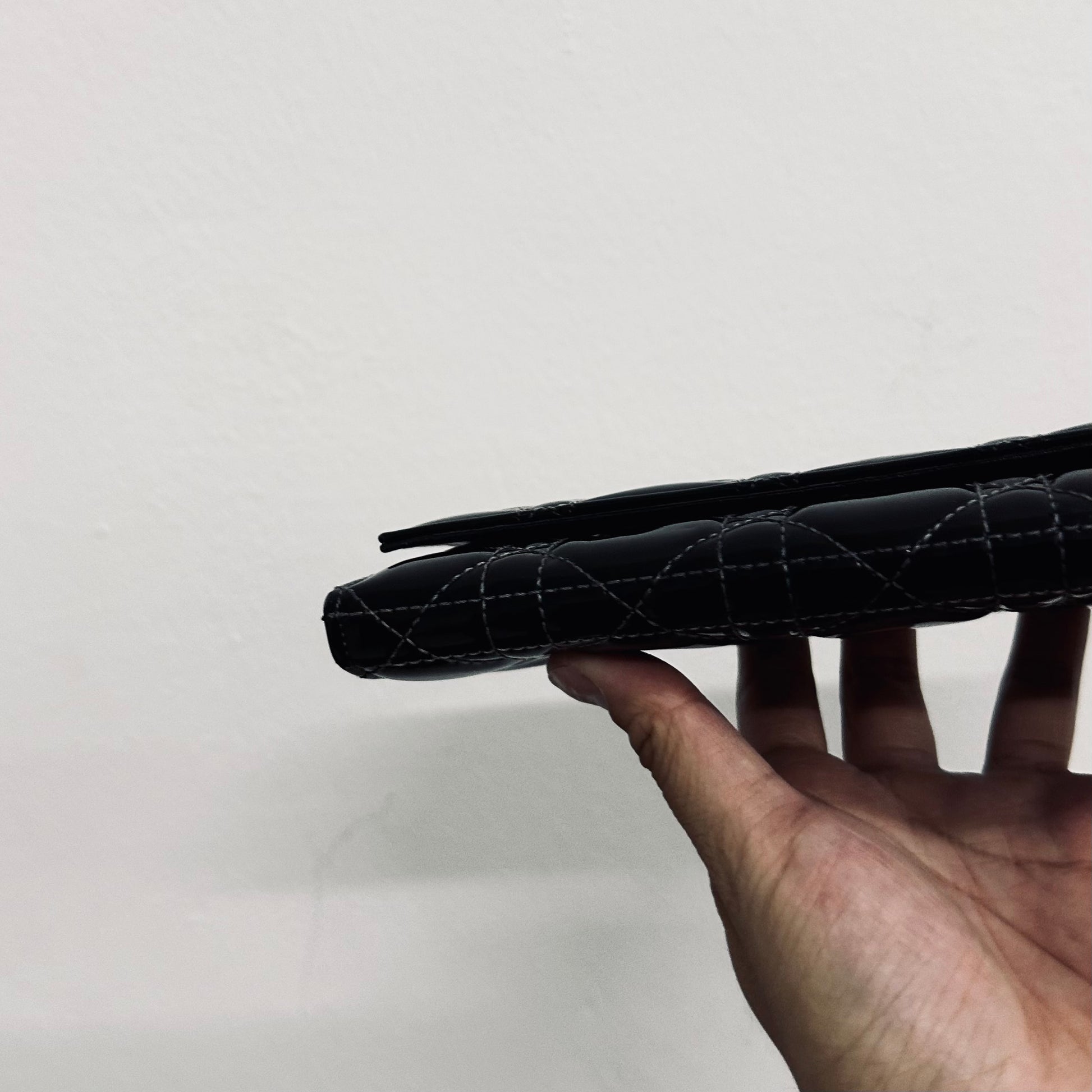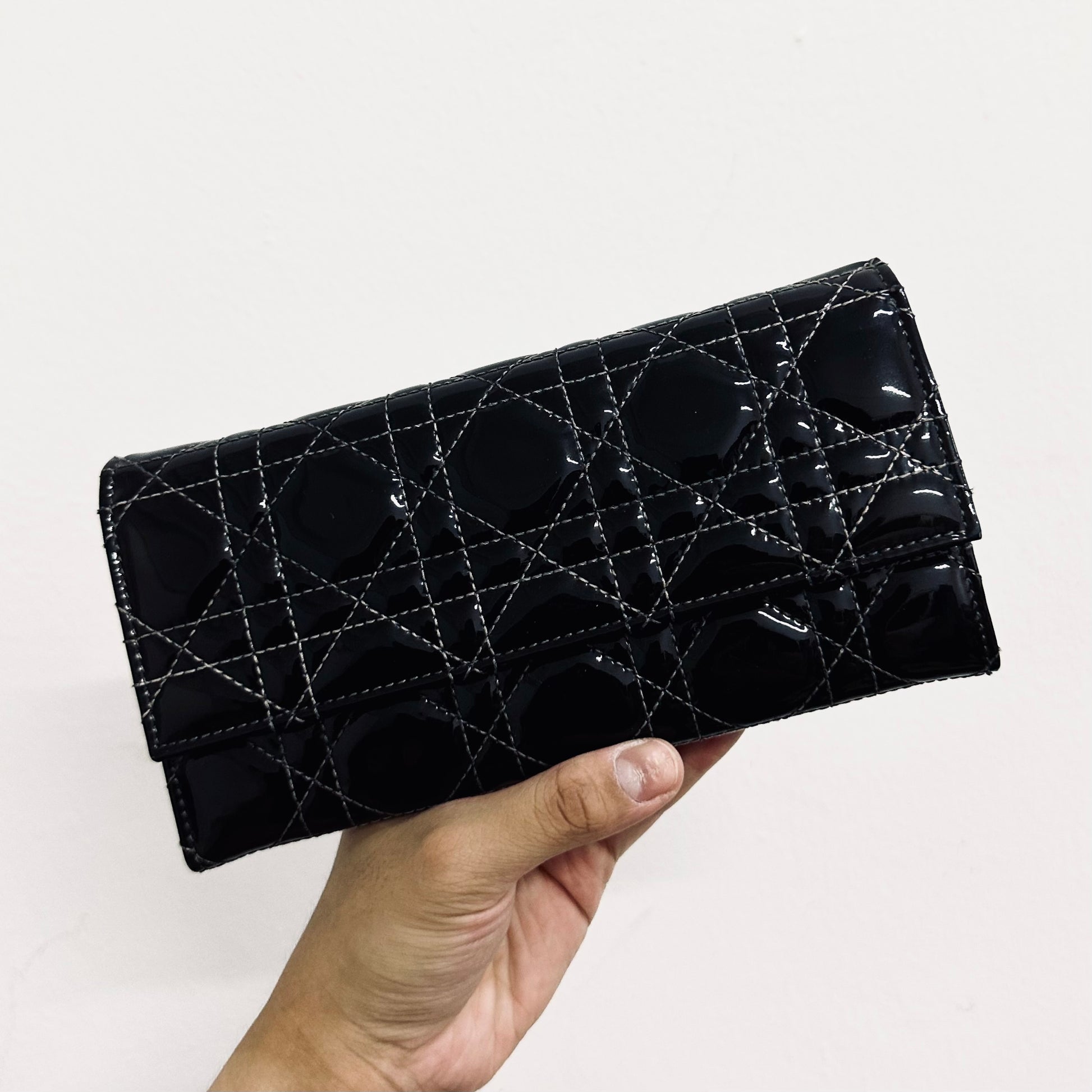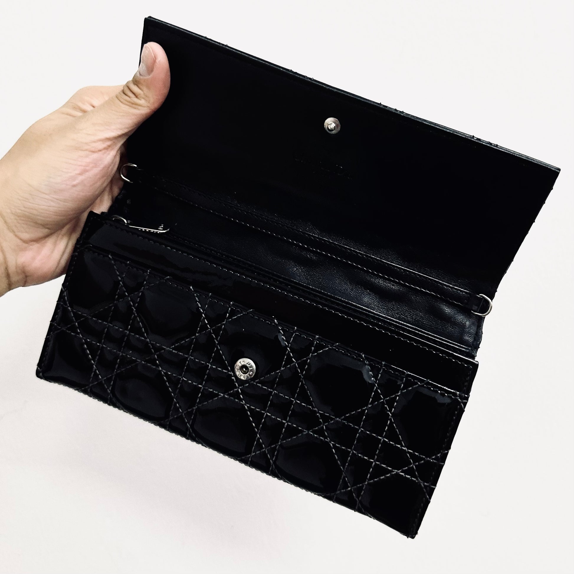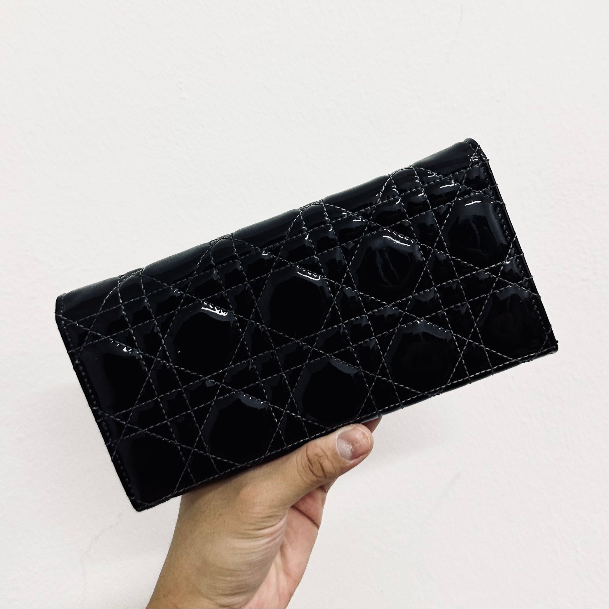Christian Dior Black Lady Dior Flap CD Monogram Logo Quilted Cannage Patent Leather Long Flap Wallet
