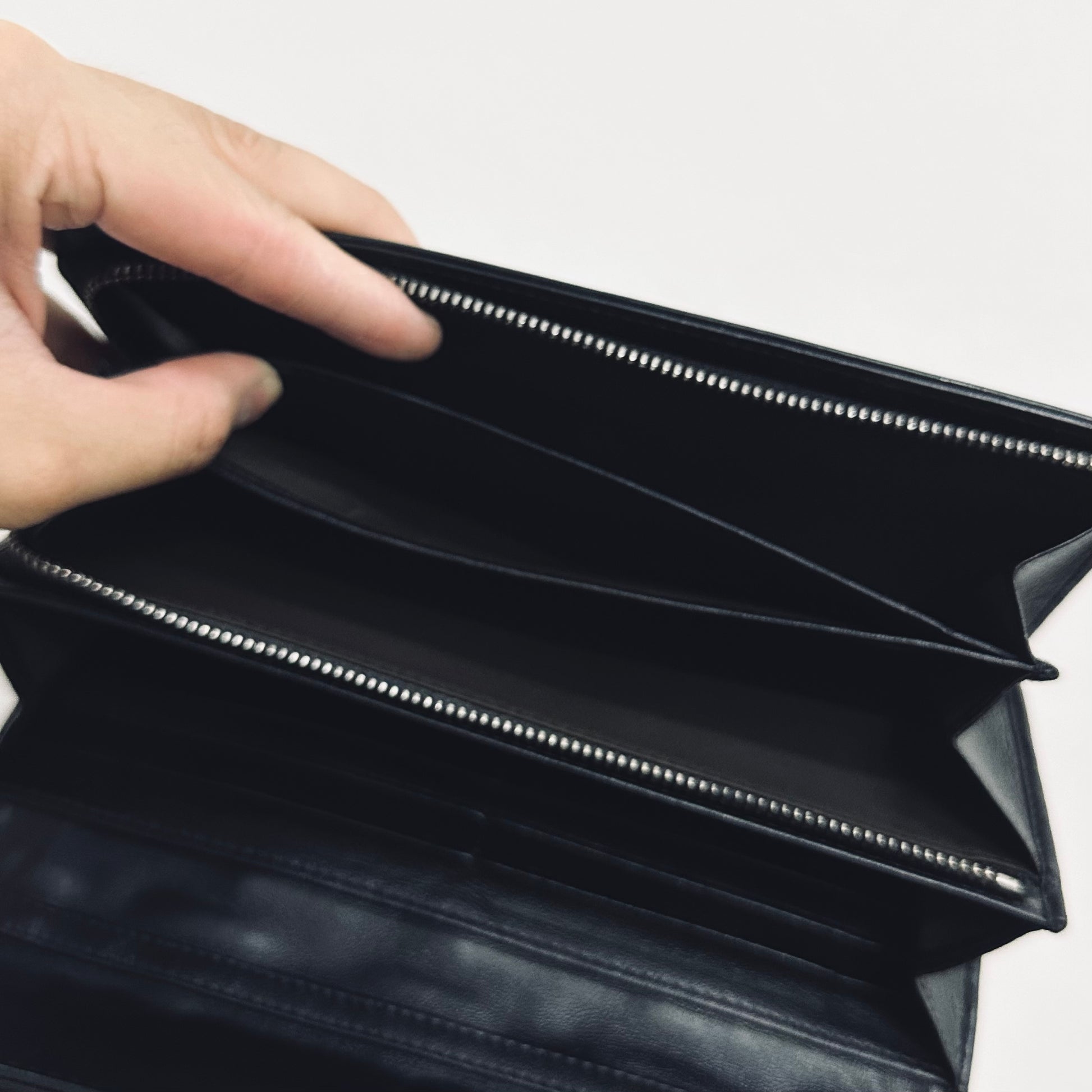 This has a flap button closure, slip pockets, zip pocket, card slots and central compartment. This measures 19x10x2cm. This comes with clearly engraved hardware, date code and interior stamping.
