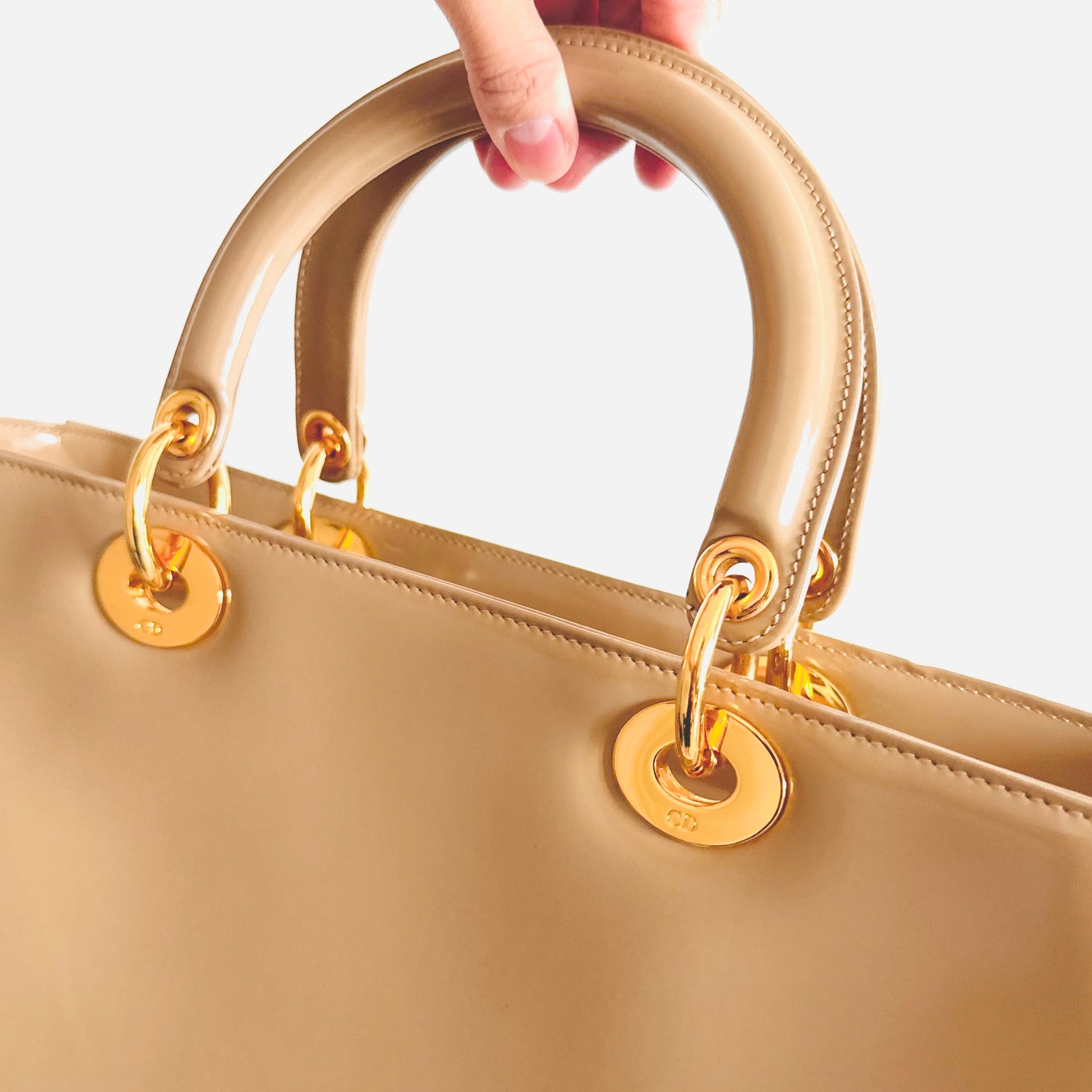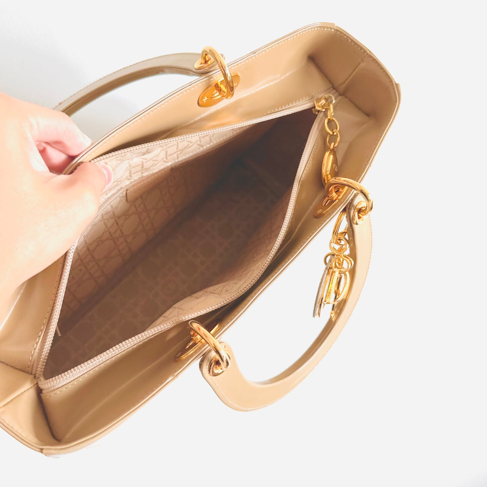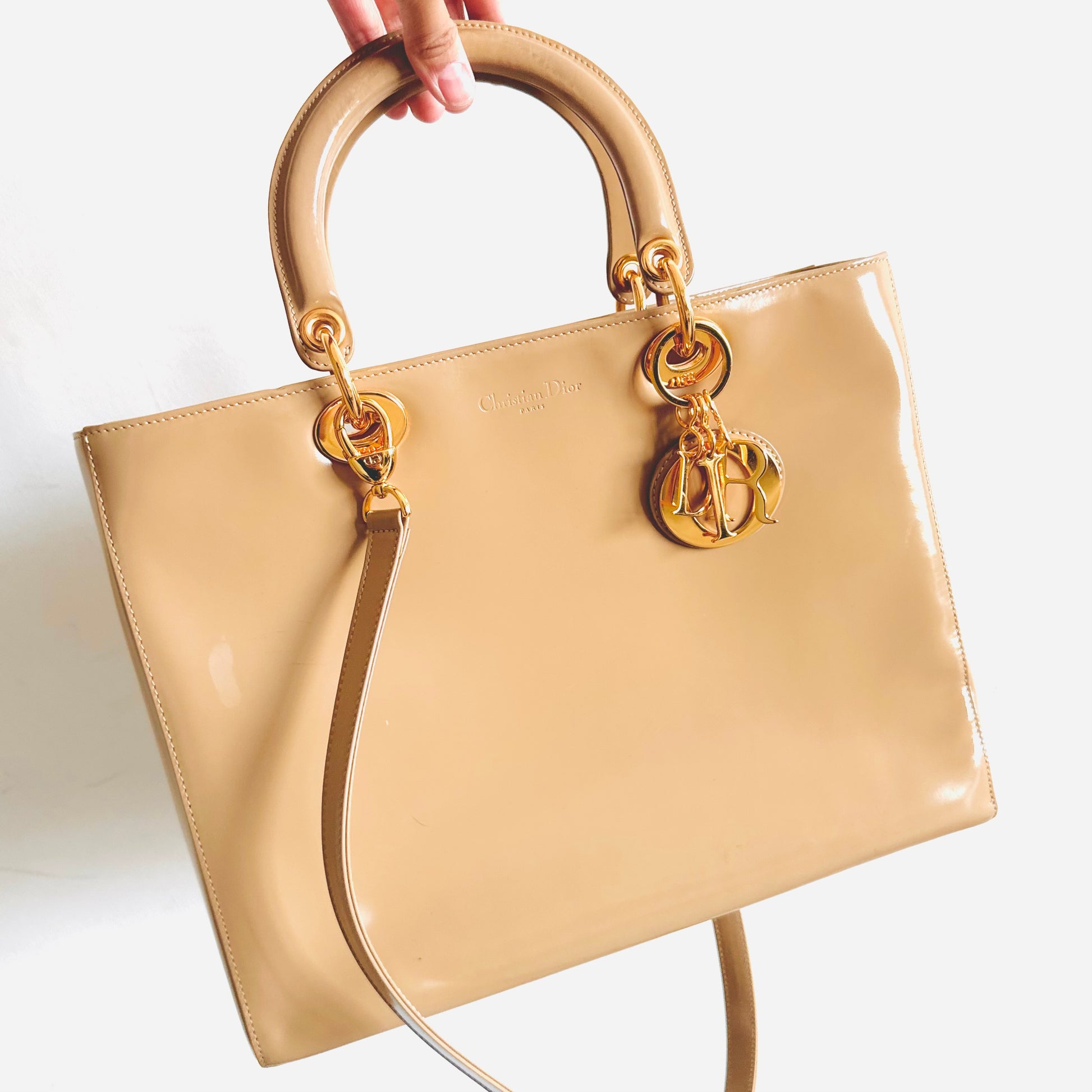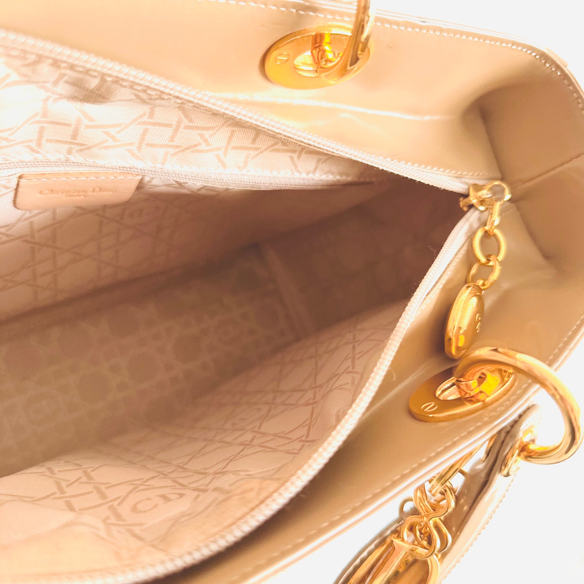 Christian Dior CD Beige GHW Large Lady Dior Patent Leather Shoulder Sling Top Handle Vintage Bag