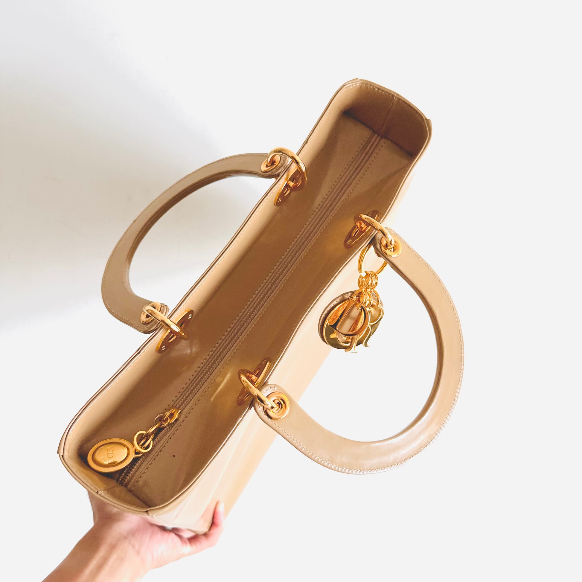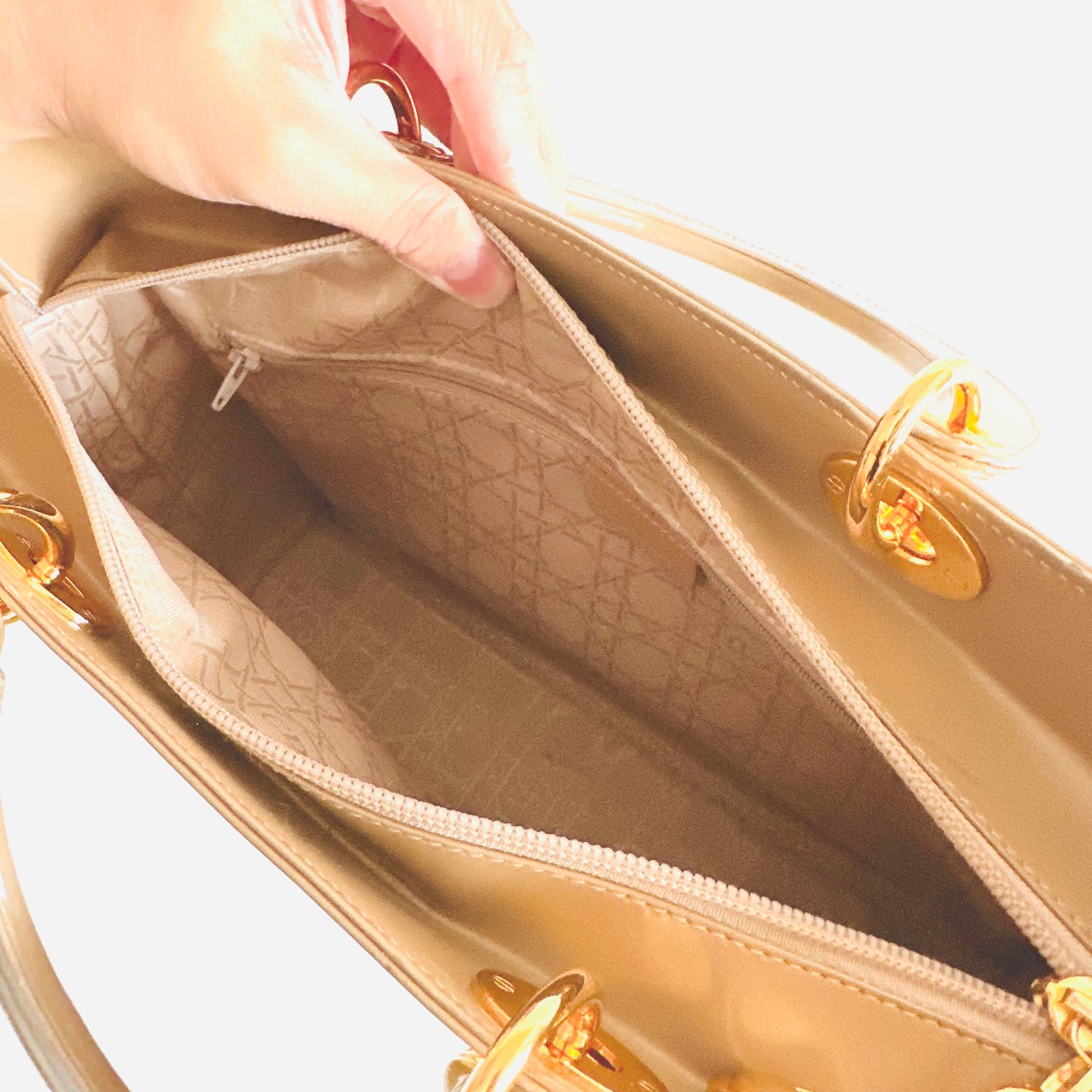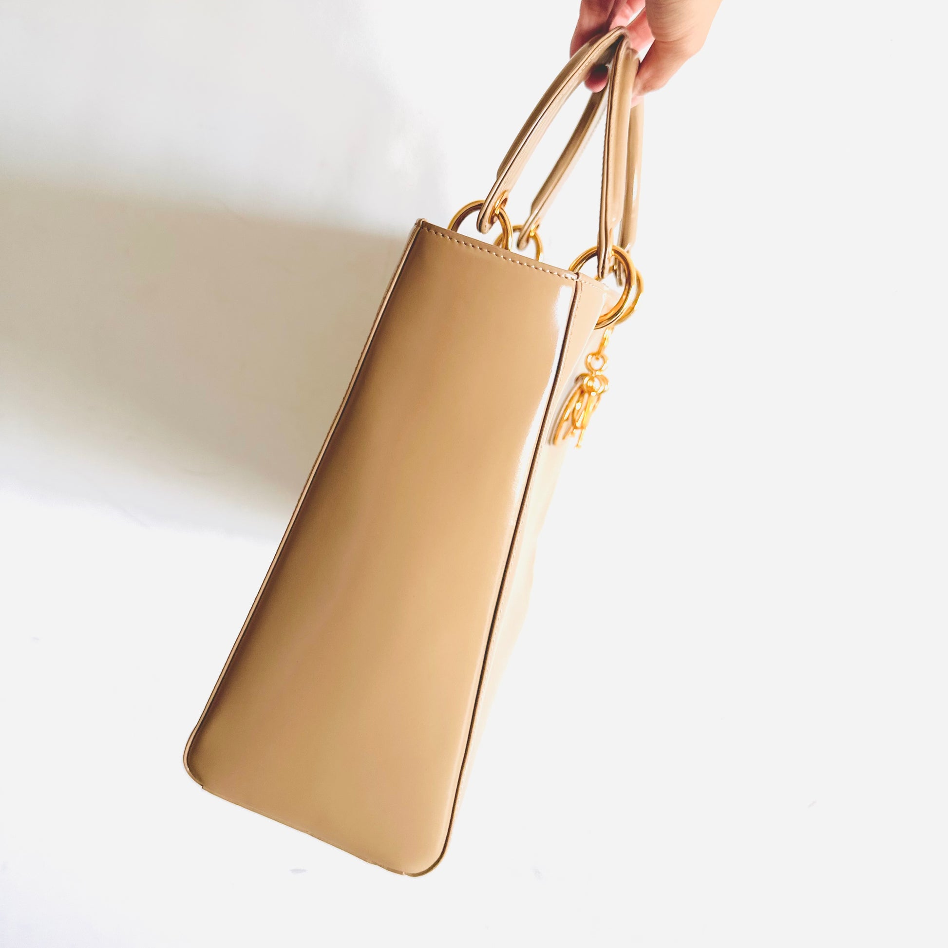Christian Dior CD Beige GHW Large Lady Dior Patent Leather Shoulder Sling Top Handle Vintage Bag