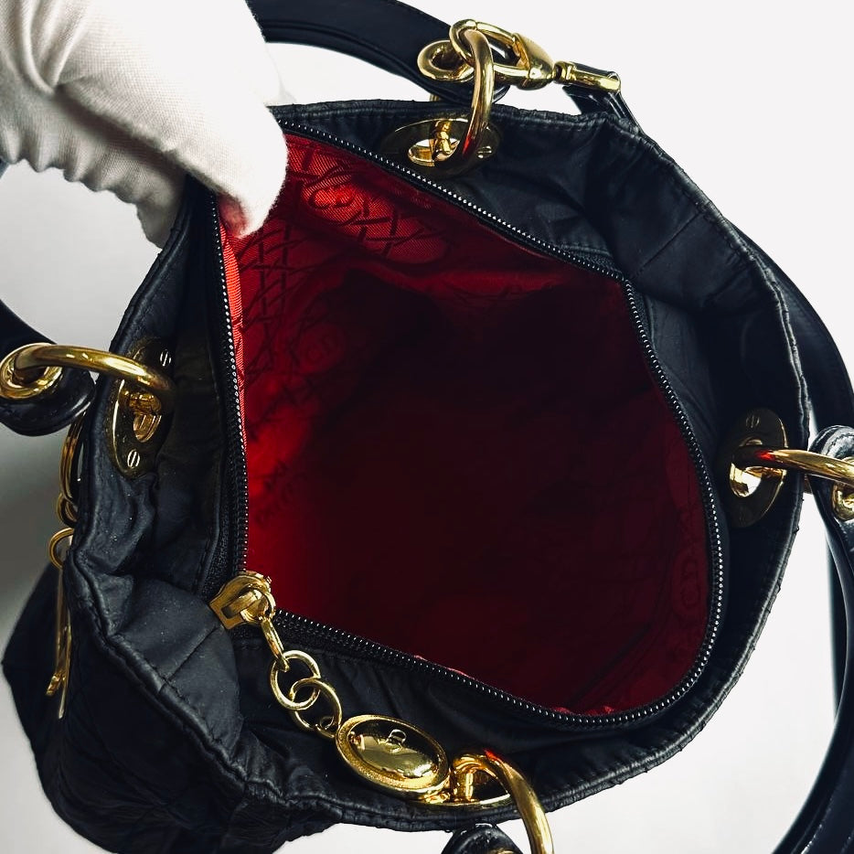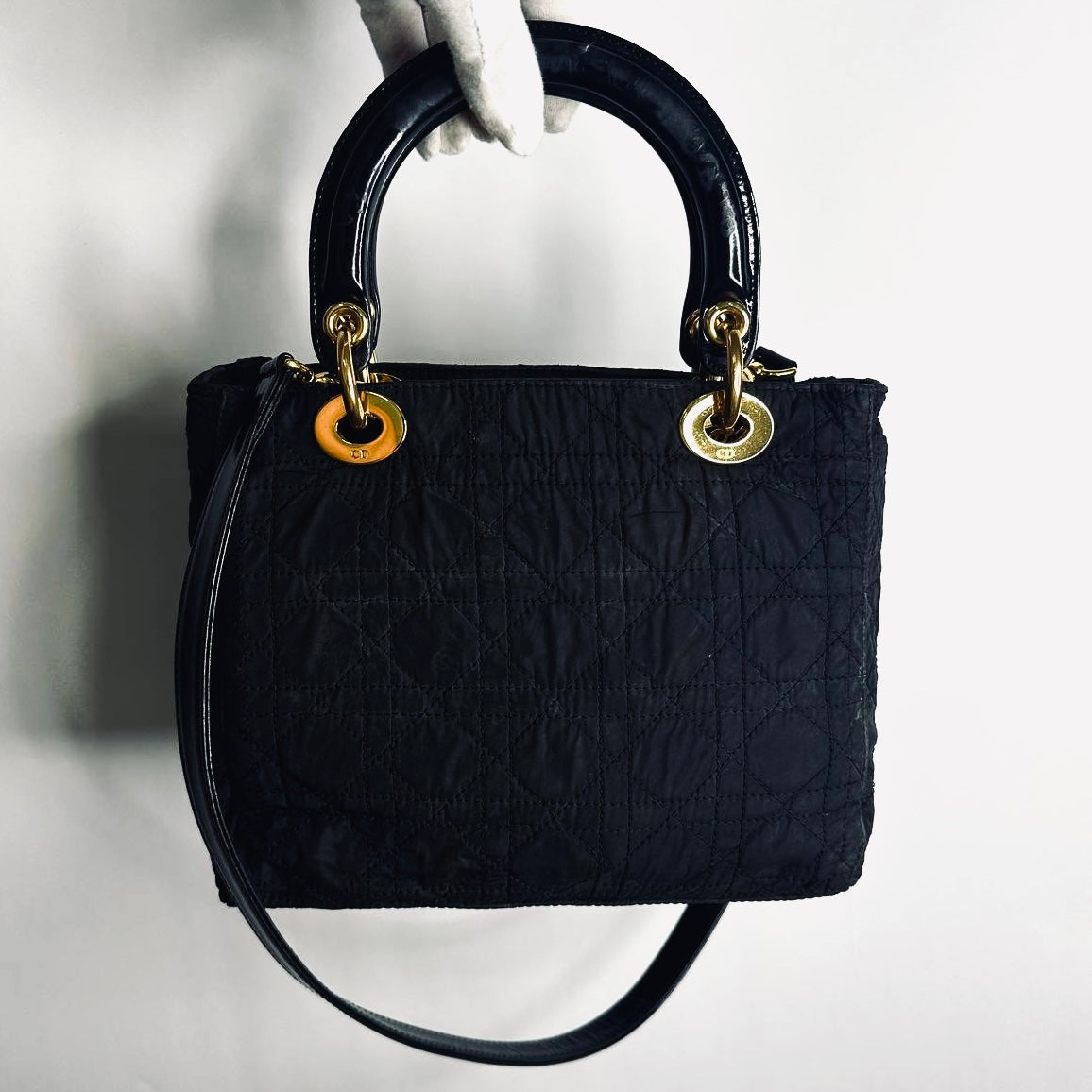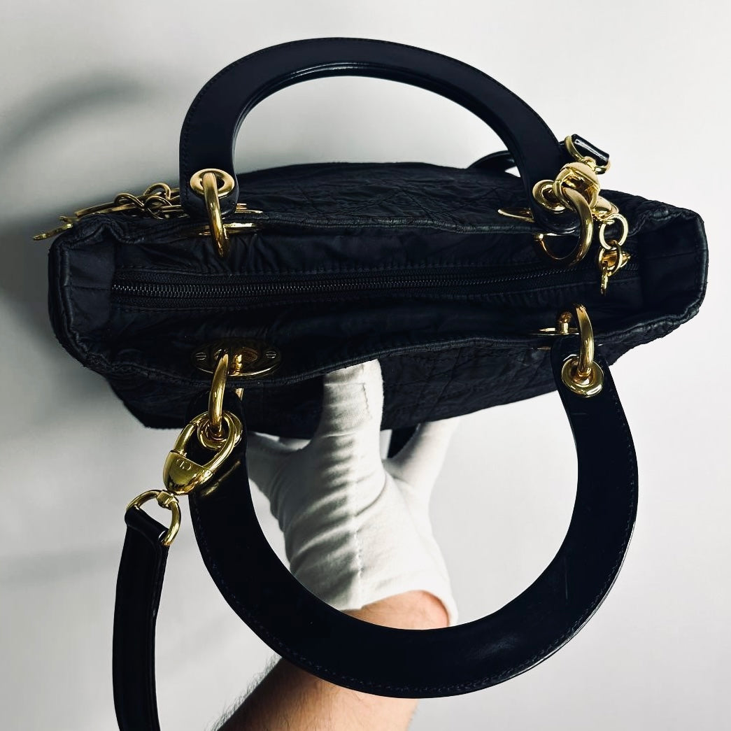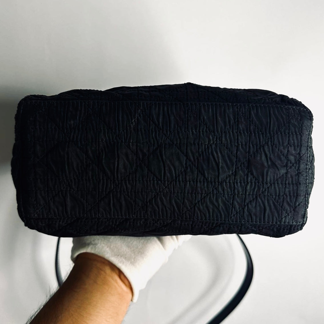 Christian Dior CD Black GHW Medium Lady Dior Cannage Quilted Nylon Monogram Logo 2-Way Top Handle Shoulder Sling Bag