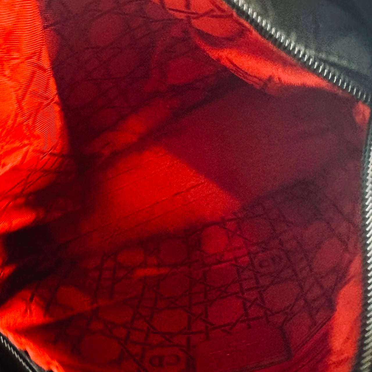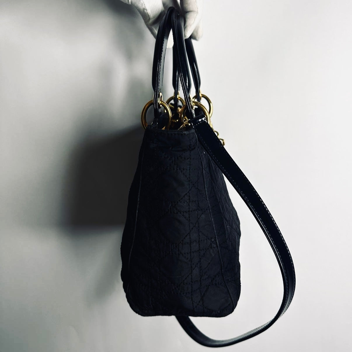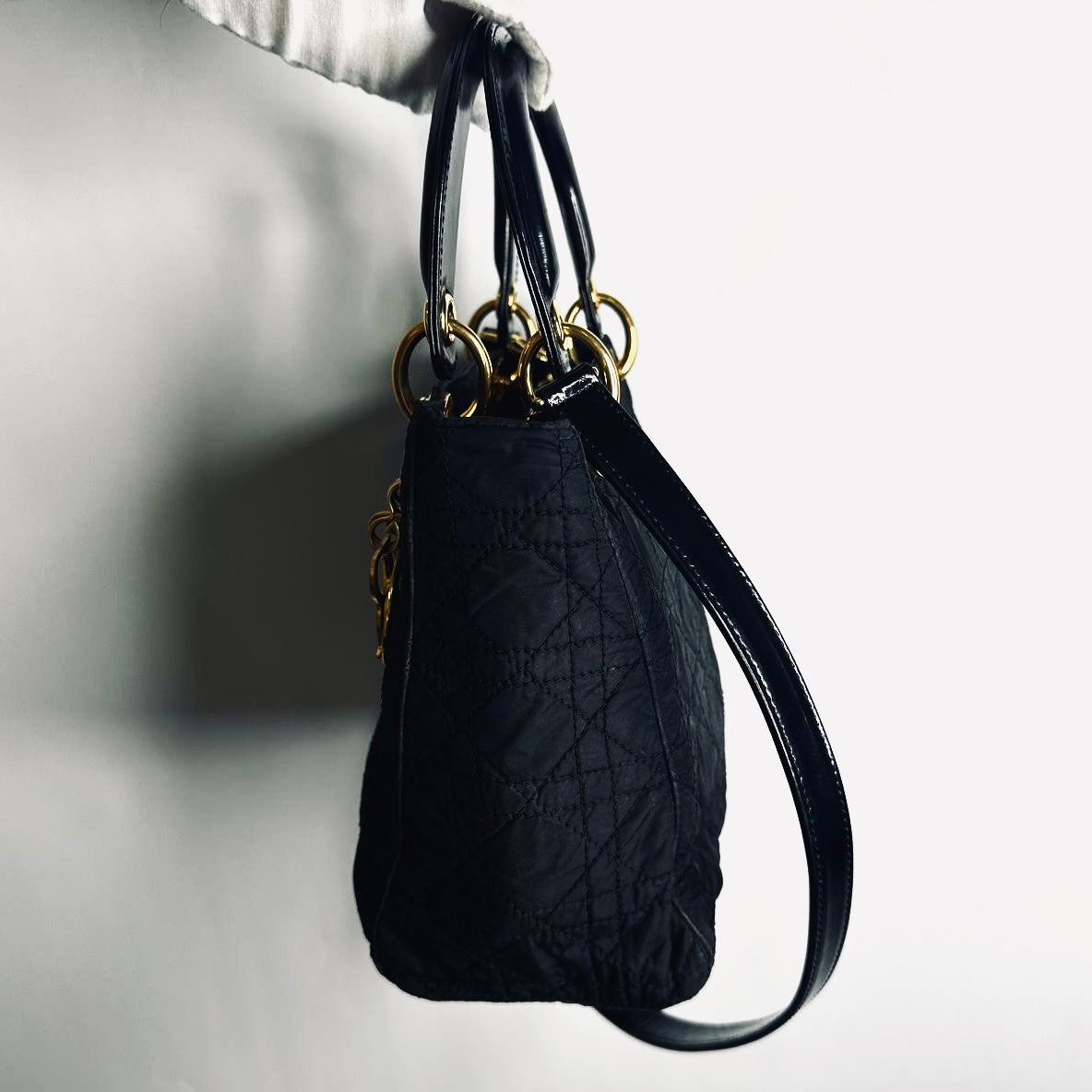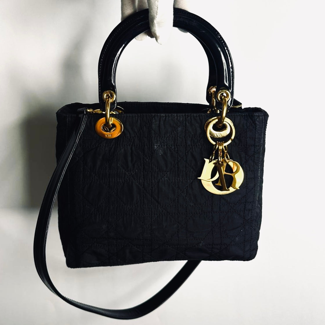 Christian Dior CD Black GHW Medium Lady Dior Cannage Quilted Nylon Monogram Logo 2-Way Top Handle Shoulder Sling Bag