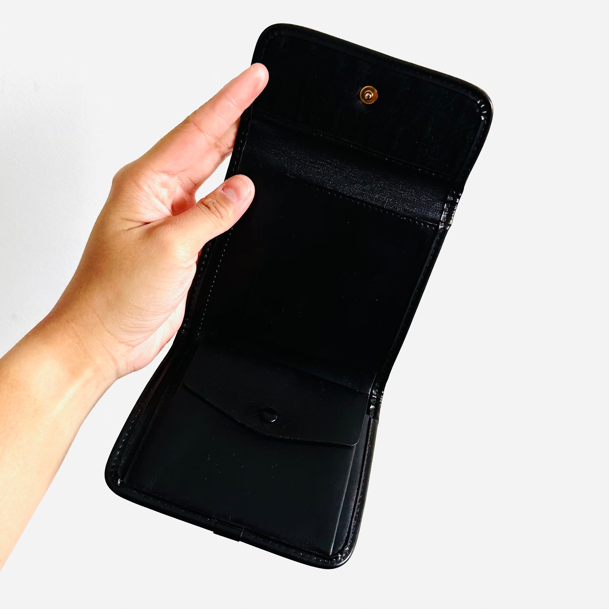 Preloved 9.6/10. This has a flap button closure, central compartment, flap coin pocket, card slots and slip pockets. This measures 11x10x1cm.