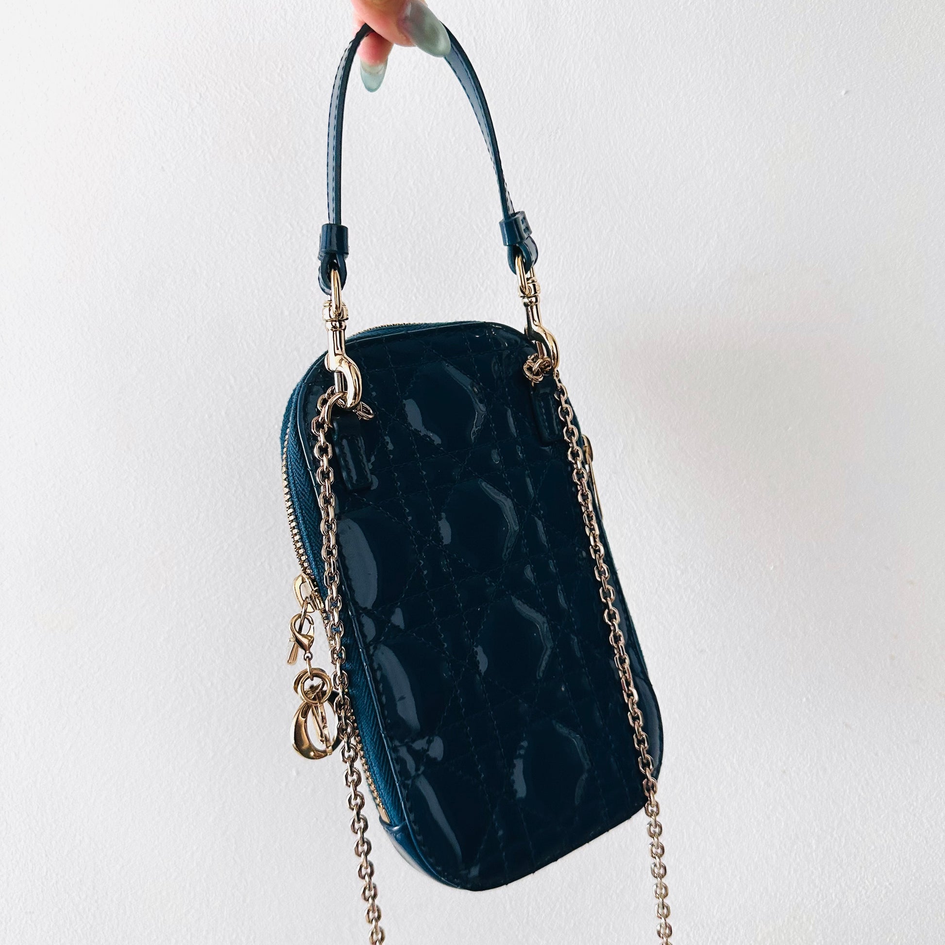 Christian Dior CD Call’In Blue GHW Lady Dior Cannage Quilted Patent Leather 2-Way Top Handle Chain Phone Sling Bag