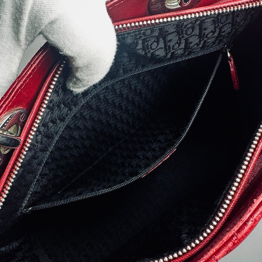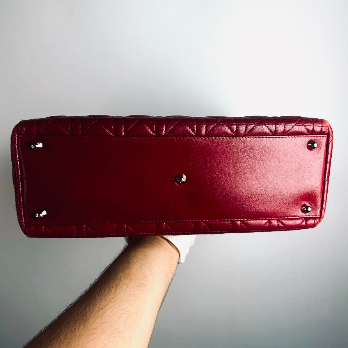 Christian Dior CD Cherry Red Large Lady Dior Cannage Quilted Lambskin Monogram Logo 2-Way Top Handle Shoulder Sling Bag