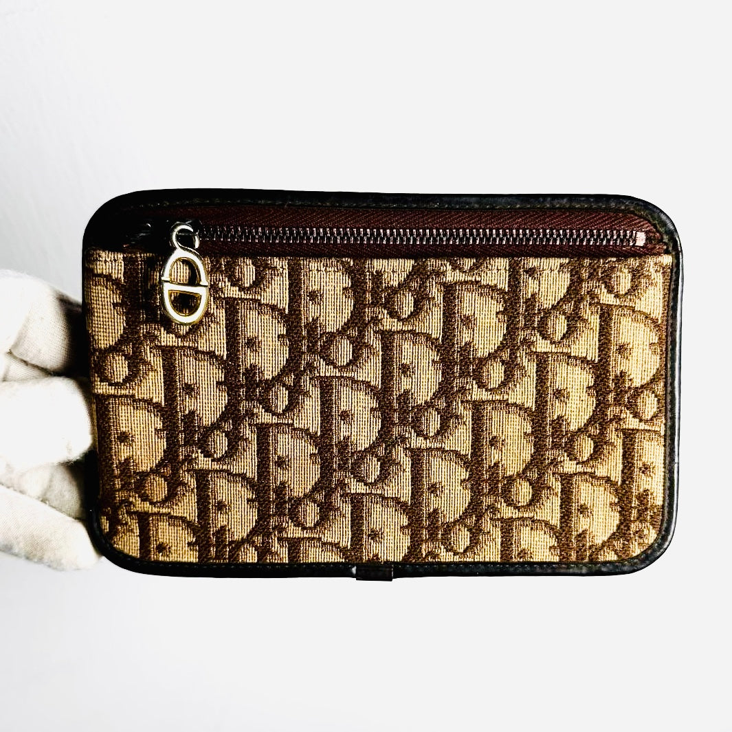 Christian Dior CD Dark Brown GHW Oblique Monogram Logo Vintage Zip Clutch Case Pouch