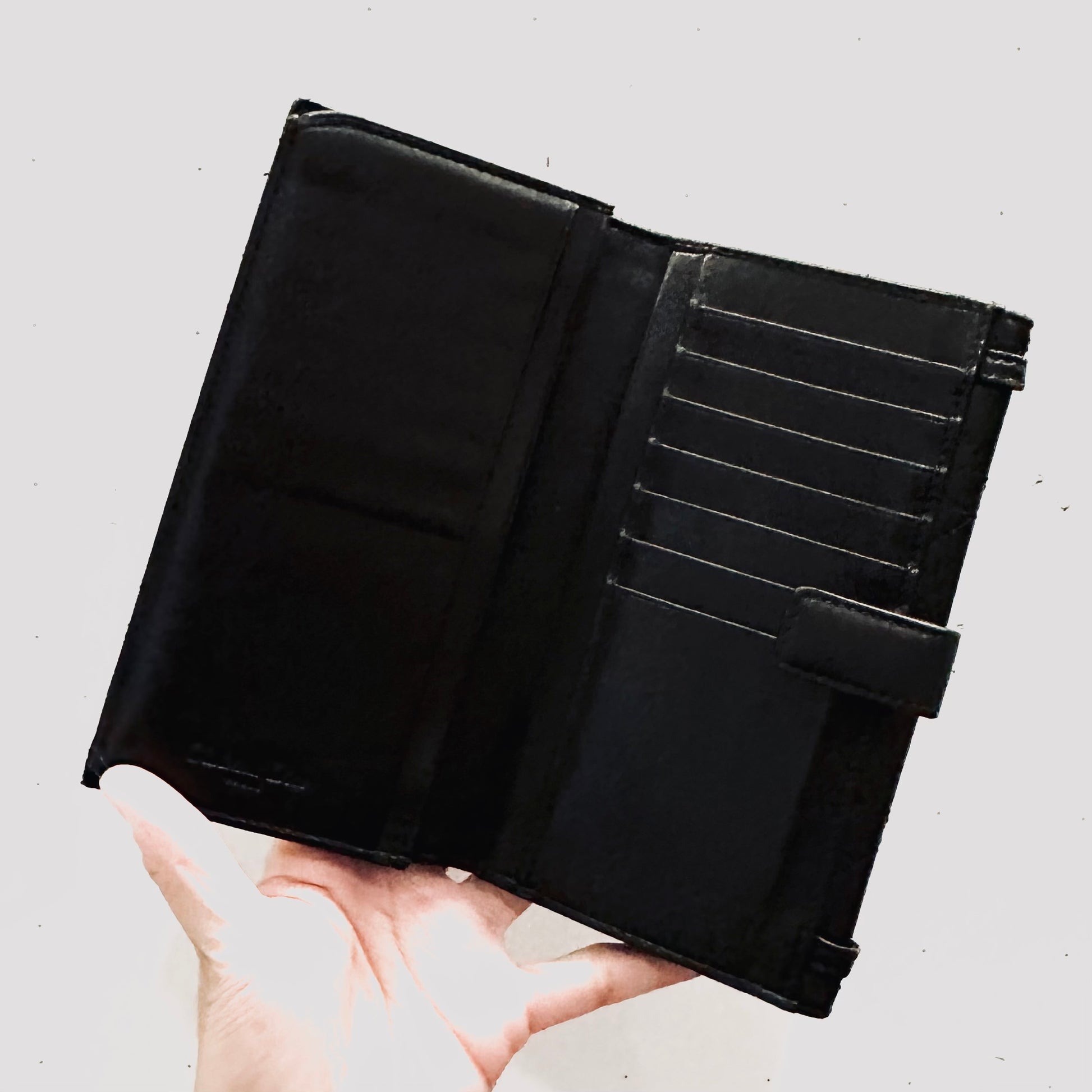 Preloved 9.5/10. This has flap button closures, coin pocket, card slots, notes compartment and slip pockets. This measures 17x10x2cm.