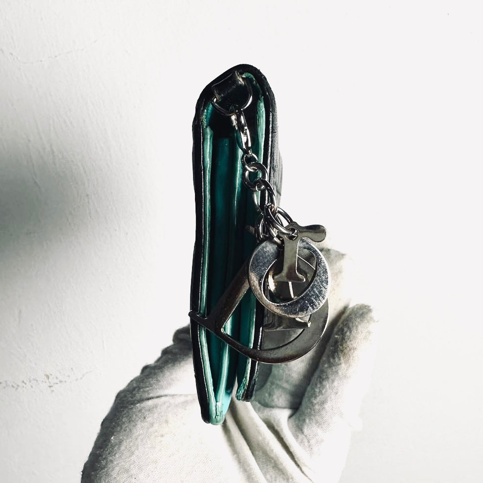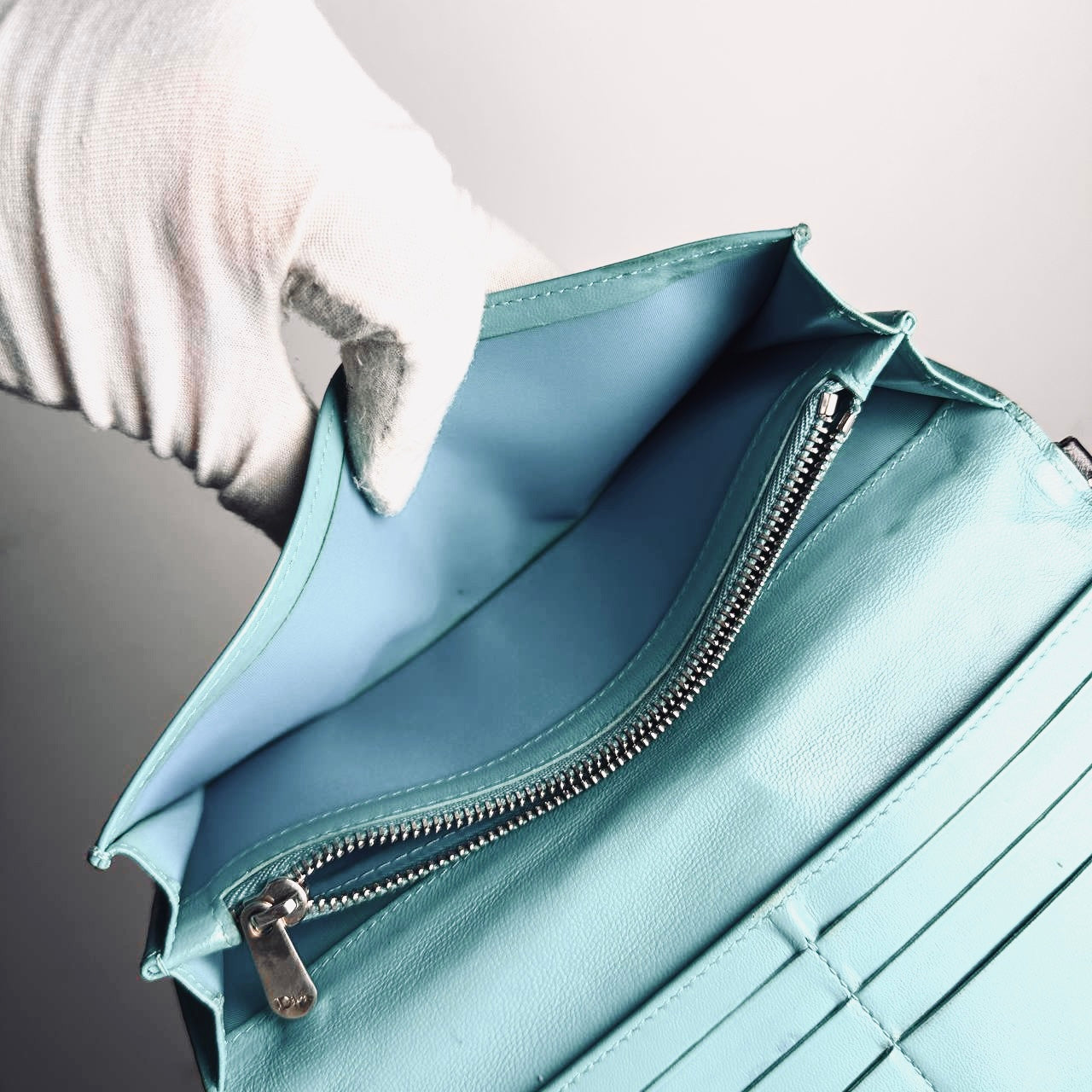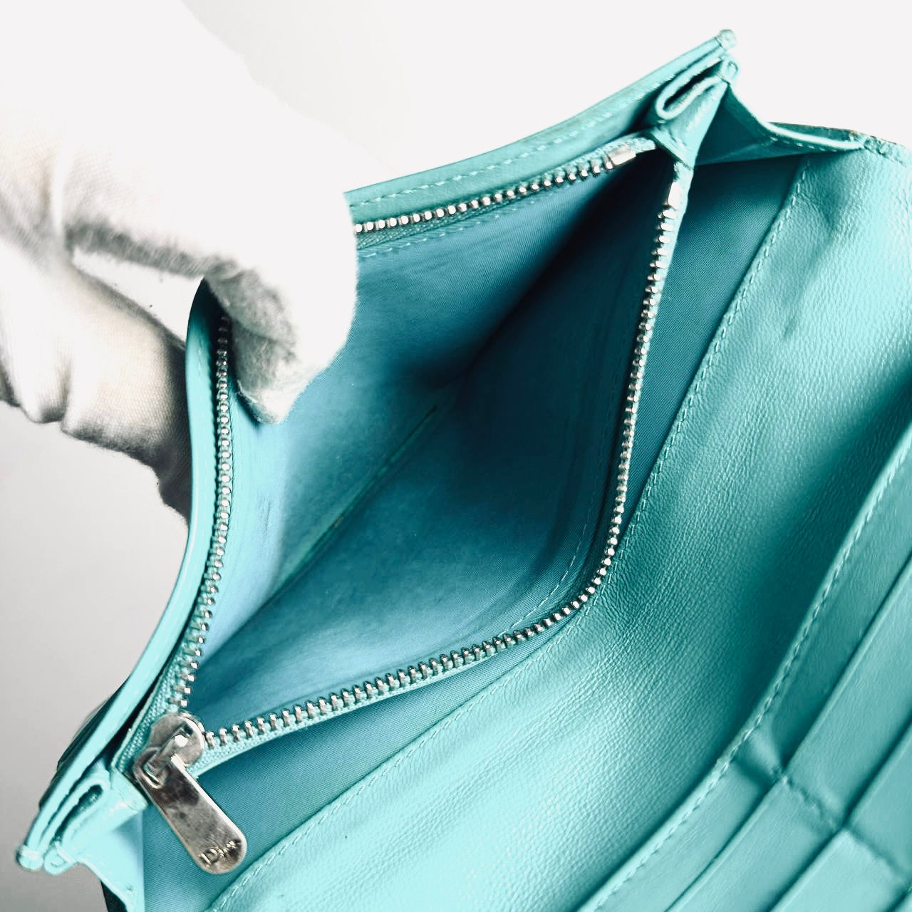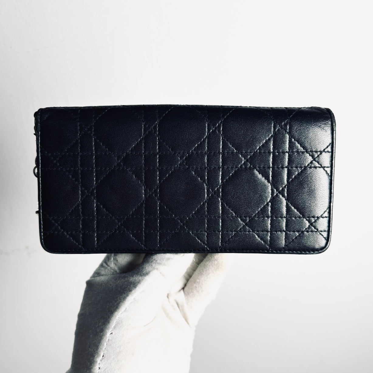 Christian Dior CD Lady Dior Black / Turquoise Charms Monogram Logo Cannage Quilted Lambskin Long Flap Bifold Wallet