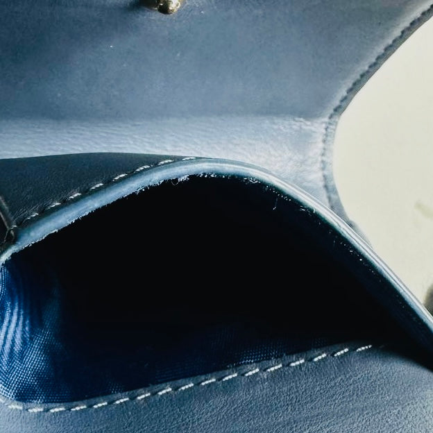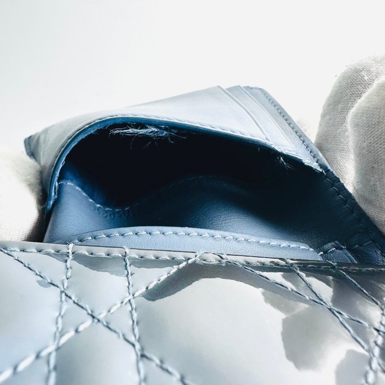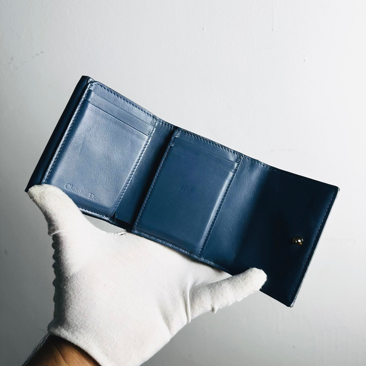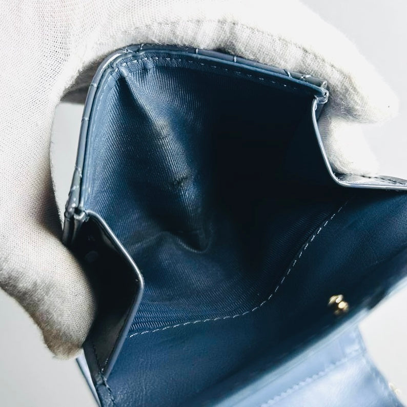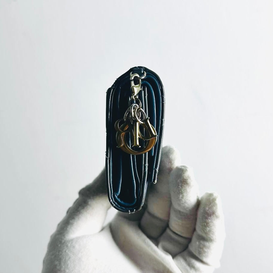 Christian Dior CD Lady Dior Dark Blue GHW Cannage Quilted Patent Monogram Logo Charms Flap Compact Trifold Wallet
