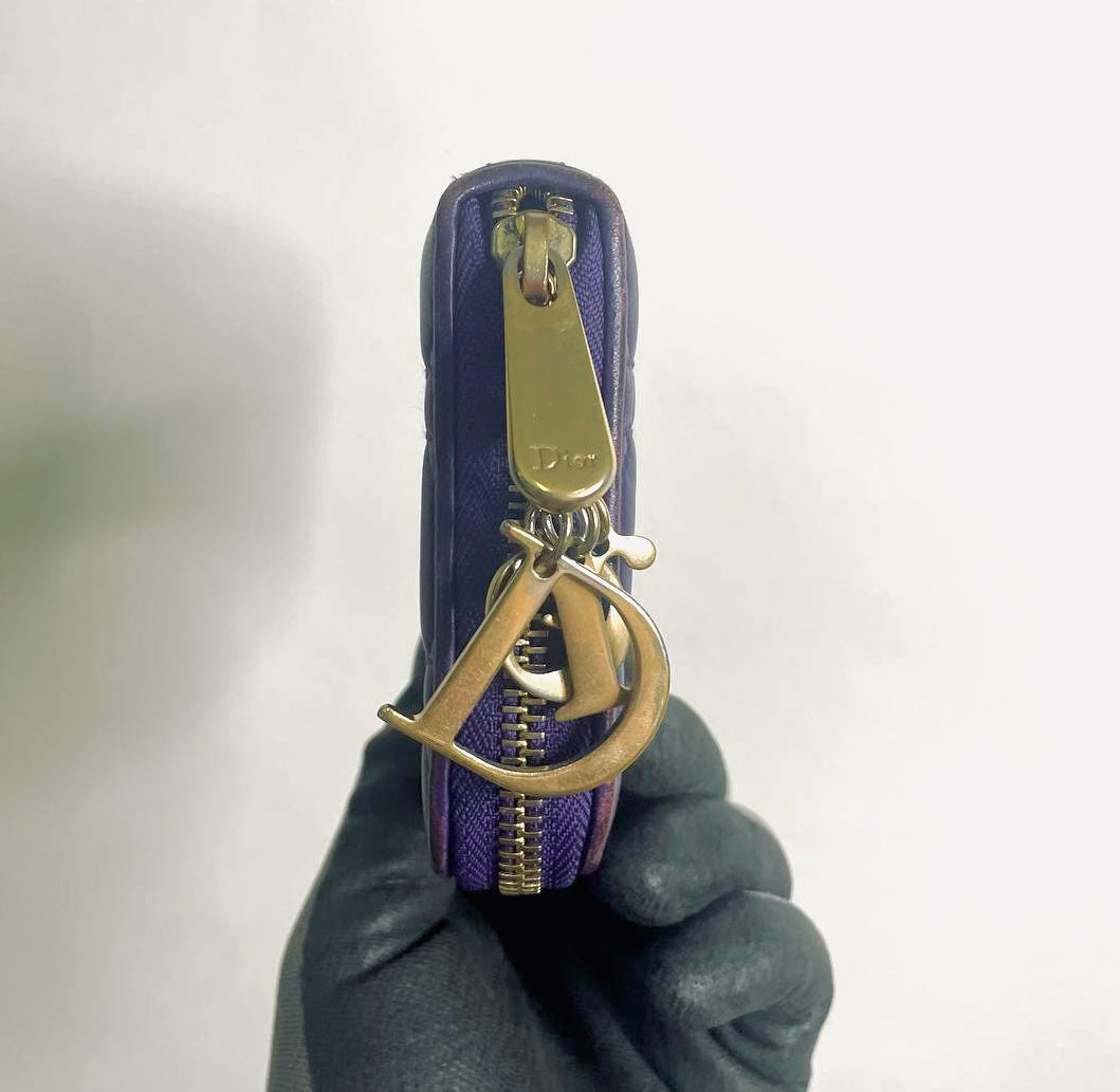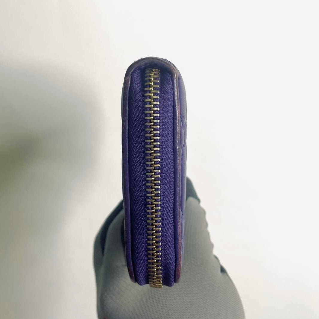 Christian Dior CD Lady Dior Indigo Purple GHW Cannage Quilted Lambskin Monogram Logo Charms Long Zippy Zip Around Wallet