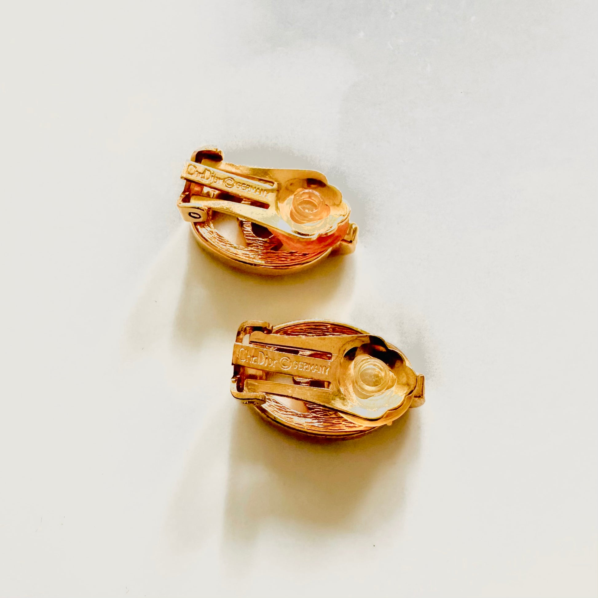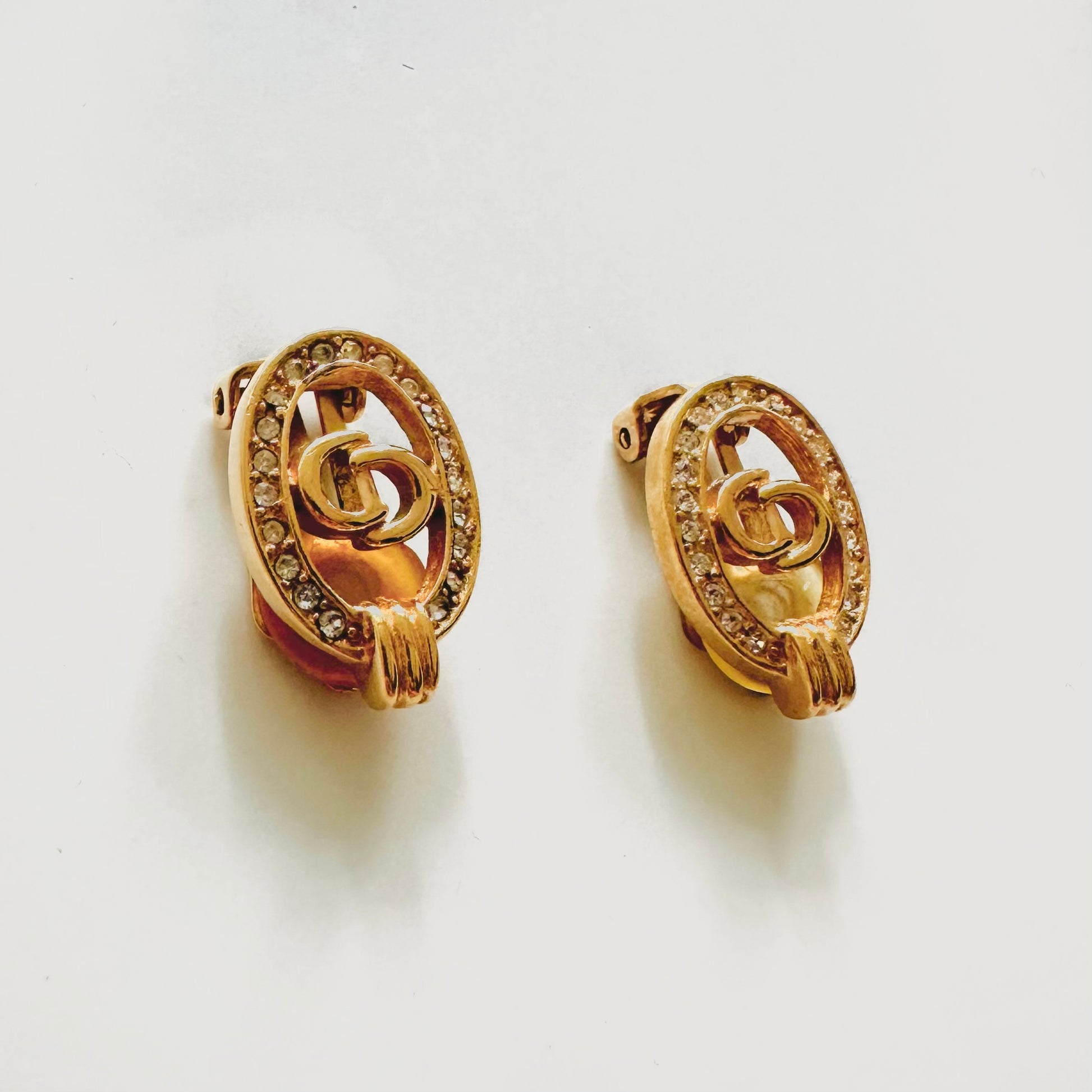 Christian Dior CD Monogram Logo Gold Crystals Oval Vintage Clip On Earrings