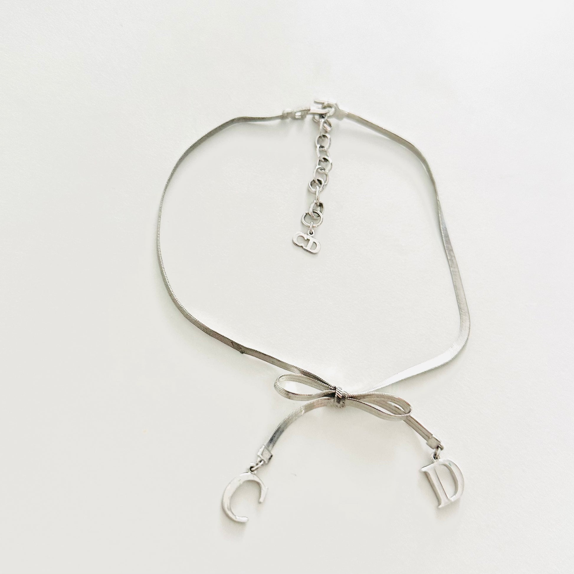 Christian Dior CD Ribbon Monogram Logo Charms Signature Classic Silver Chain Vintage Necklace